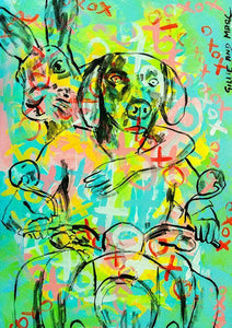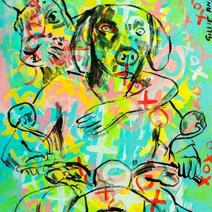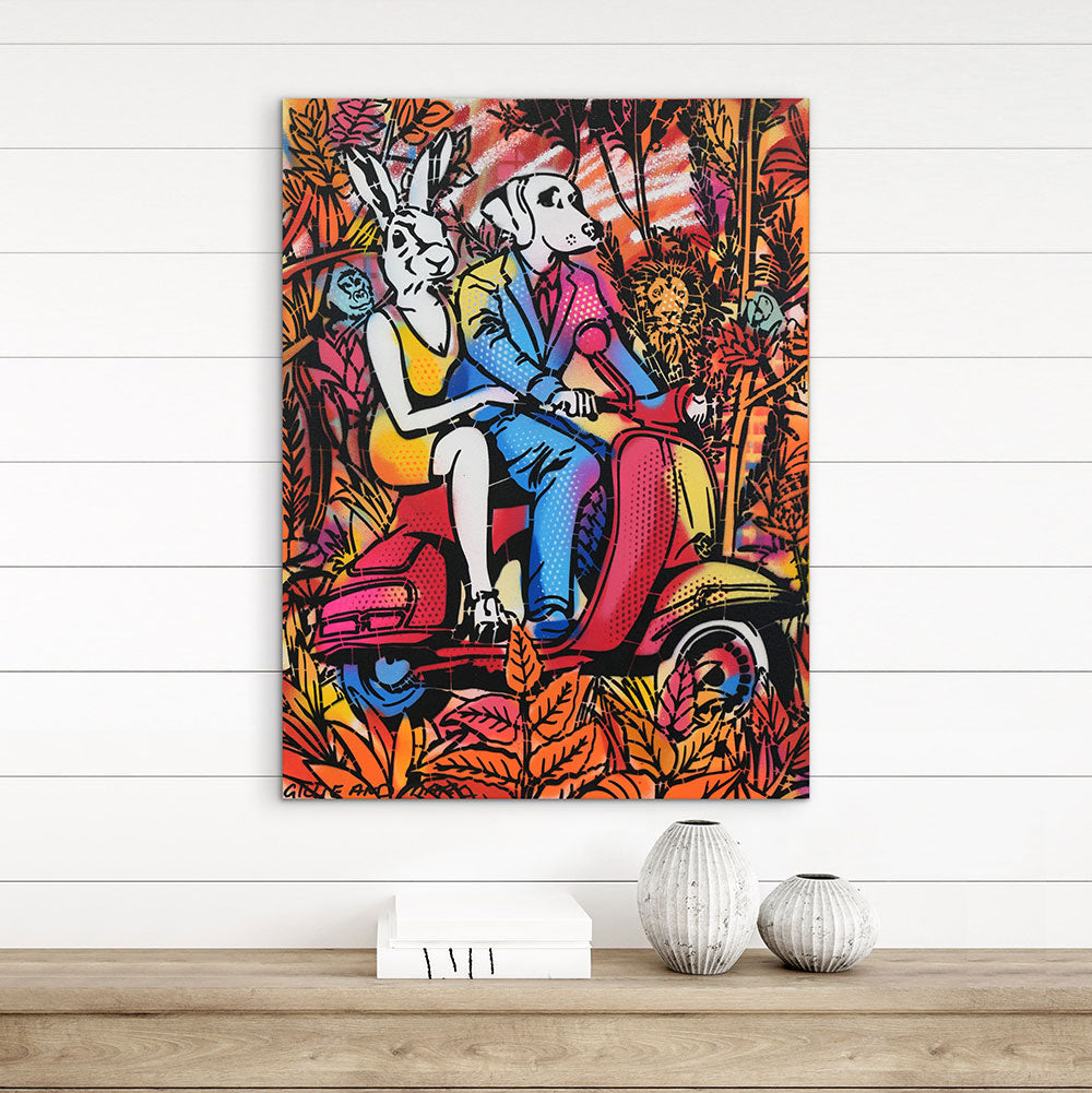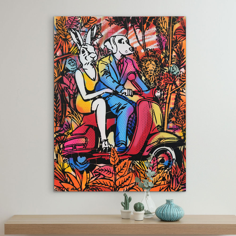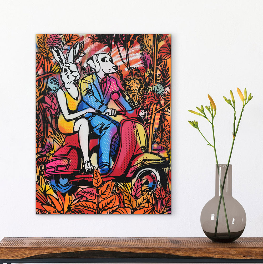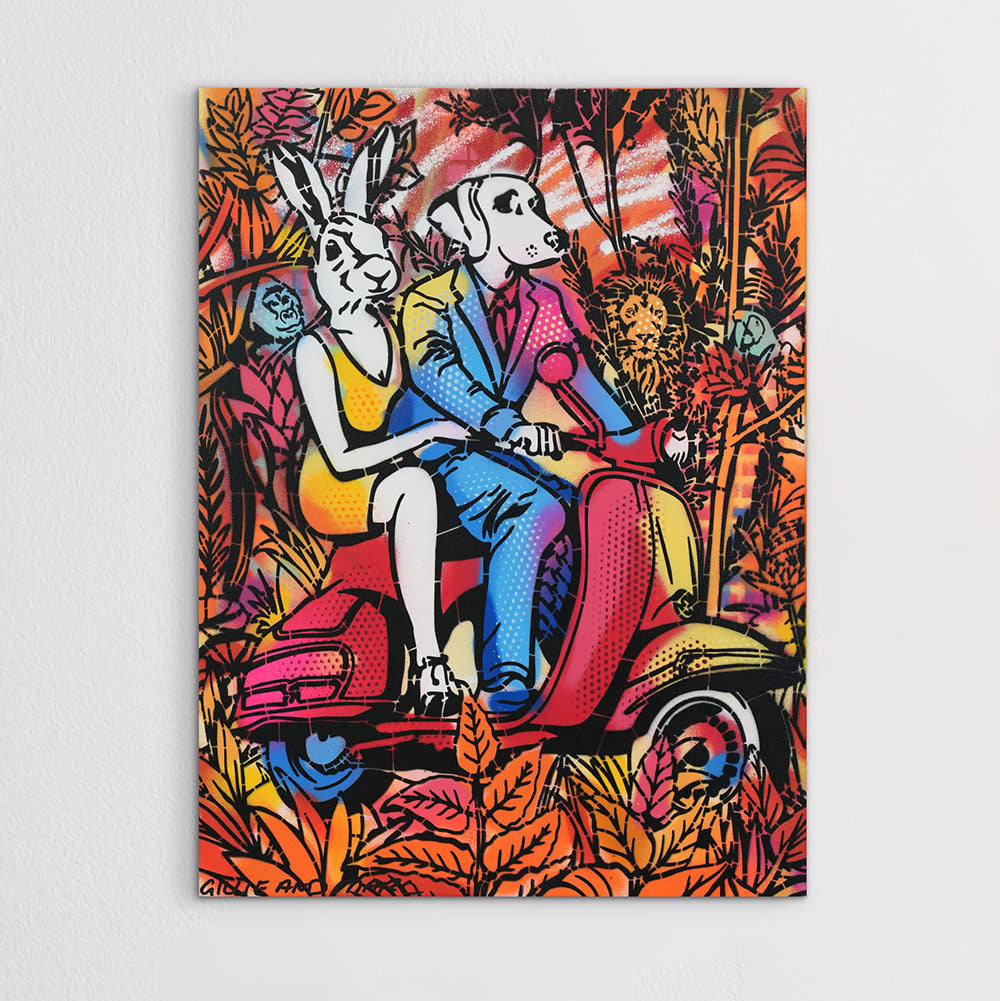 Description In this vibrant and energetic piece, Rabbitwoman and Dogman ride together through a burst of colour and life. Surrounded by a jungle of fiery oranges, pinks, and yellows, their scooter journey becomes a symbol of love, adventure, and unity. The duo—eternal companions in Gillie and Marc’s world—represent the power of connection and the joy of shared experiences. The dynamic stencil style and pop-inspired palette infuse the work with movement and optimism, capturing a moment where hearts and paths align perfectly.