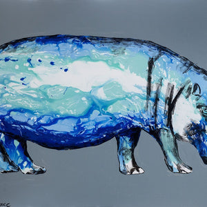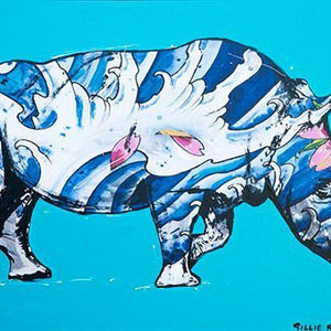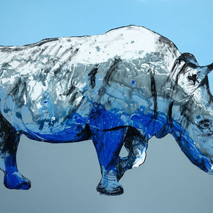 Description In a poignant tribute to Sudan, the last remaining male northern white rhino who passed away in March 2018, the painting "He was the last of his kind in the world" captures the essence of his solitary existence. Dripping with hues of blue, the canvas portrays Sudan as a symbol of resilience and fragility, his presence fading into the depths of the cerulean backdrop. Each stroke of the brush echoes his legacy, standing as a solemn reminder of the consequences of human neglect and environmental degradation. Amidst the swirling hues, Sudan's silhouette remains a poignant reminder of the irreplaceable loss of biodiversity and the urgent need for conservation efforts.