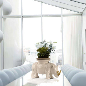 Description Modelled in memory of the beautiful Sudan, the last of the male White Rhinos who died in 2018, this ceramic sculpture serves as a reminder of what can be lost if we do not bring conservation issues to the forefront of our consciousness. Both practical and beautiful, this wonderful ceramic can be used as both a candle or a plant holder. Held on his back, this sculpture recognises the strength of this majestic Rhino, even with the heavy burden that he was plagued to carry, the burden of the extinction of his species. You can either light a candle in memory of Sudan, or watch your plants flourish off the strength of his back.