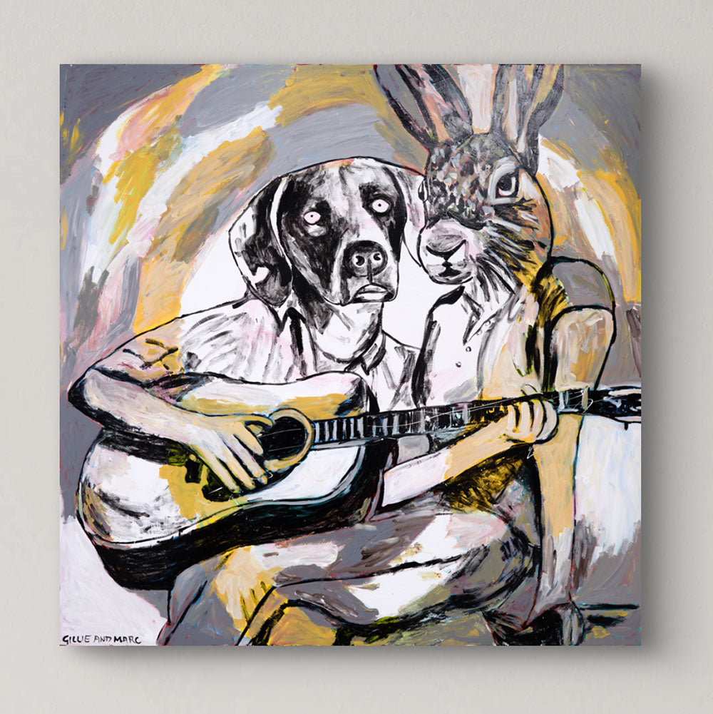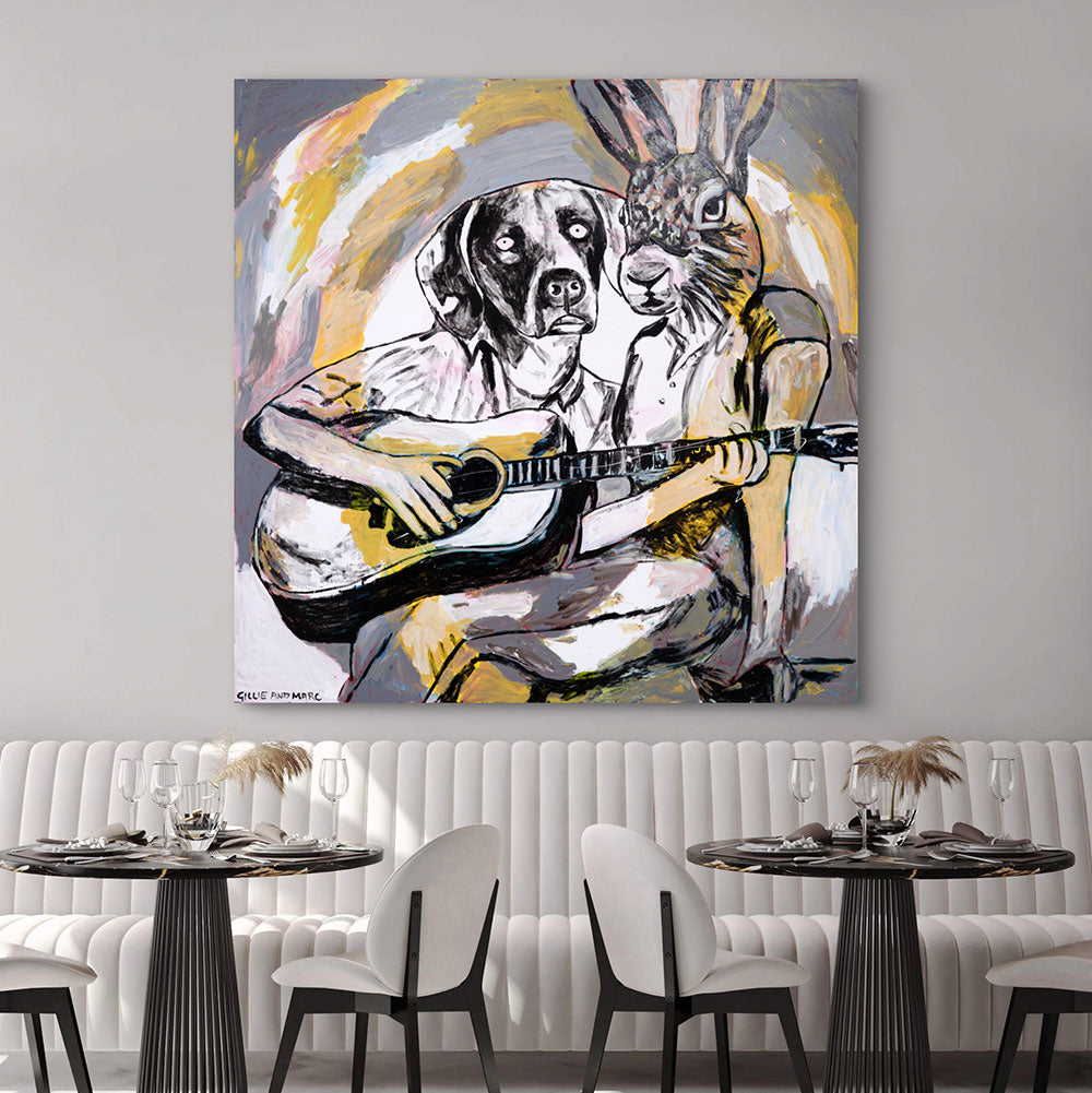 Style Contemporary Realism Description Dogman couldn't help but pick his guitar and start strumming beautiful chords that floated towards the sky. Watching Rabbitwoman's face light up, he started playing her a love song. The music filled their hearts with love and gratitude, and they danced the night away under the spell of Dogman's guitar. To Dogman, music was life, and playing music for Rabbitwoman became his life's purpose. Artwork Features The iconic style of Gillie and Marc’s Thick Texture Paintings provide the tangible dimensions of a sculpture with the convenient spatial simplicity of a painting. Multiple layers of impasto are mixed with the paint. With each piece, Gillie and Marc are sharing a part of their unique experience through choppy brushstrokes and captivating visuals that create a harmonious image that is more than just a painting.
