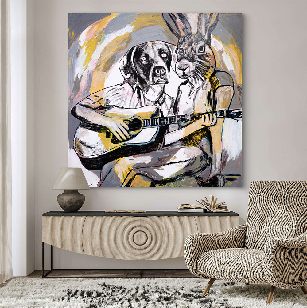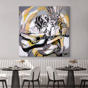 Style Contemporary Figurative, Wildlife, Fashion Description In Music For The Heart, Rabbitwoman and Dogman are depicted intimately playing a guitar together, evoking a sense of connection through music. The bold, expressive brushstrokes and a muted, yet vibrant color palette bring an emotional warmth to the scene. The shared instrument symbolizes harmony and unity between the two anthropomorphic characters. This artwork emphasizes the universal language of music, inviting the viewer to feel the emotional resonance of the moment.