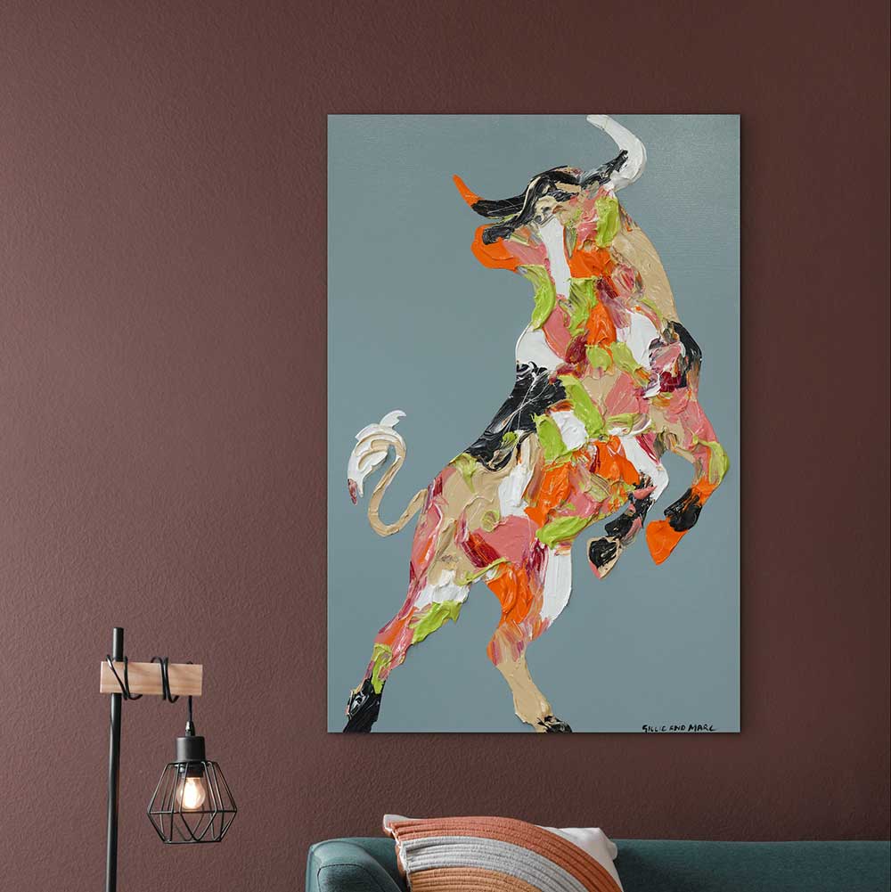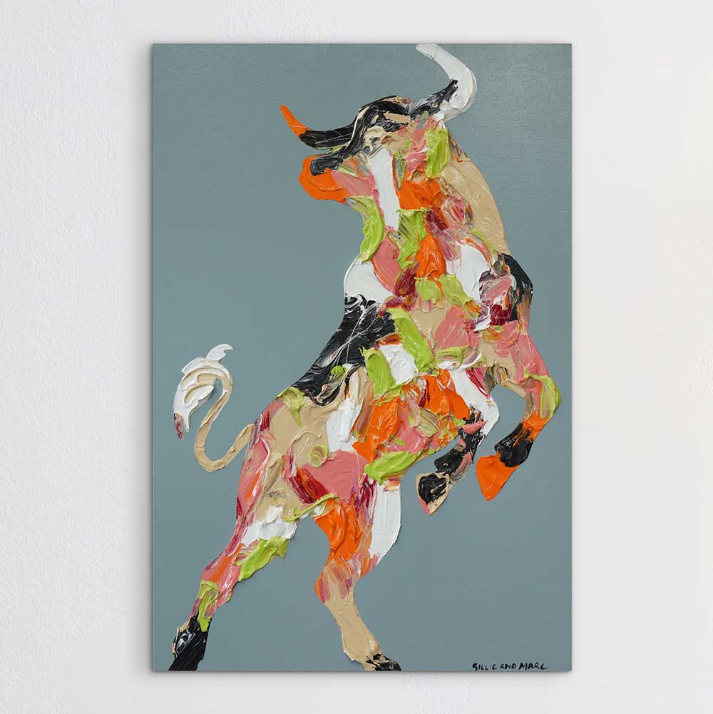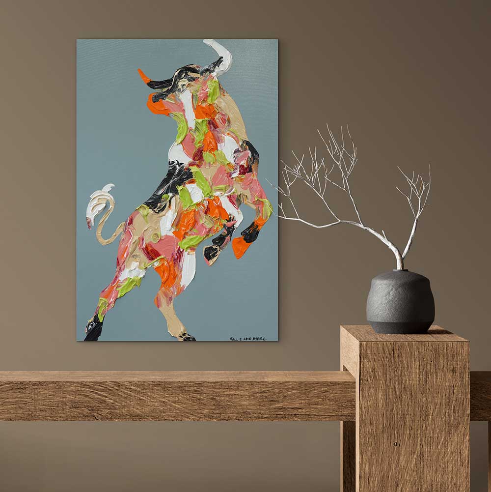 Description "Orion the Spirited Bull" is a captivating painting that captures the essence of a powerful bull facing the camera with unwavering spirit. The artist skillfully portrays the bull's strength and determination, while behind it, a moving silhouette in pastel evokes a sense of melancholy, symbolizing the gradual disappearance of these magnificent creatures due to the cruel sports they are subjected to. The dynamic brushstrokes and the interplay of paint and pastel create a sense of movement, further emphasizing the urgency to protect and preserve these animals.