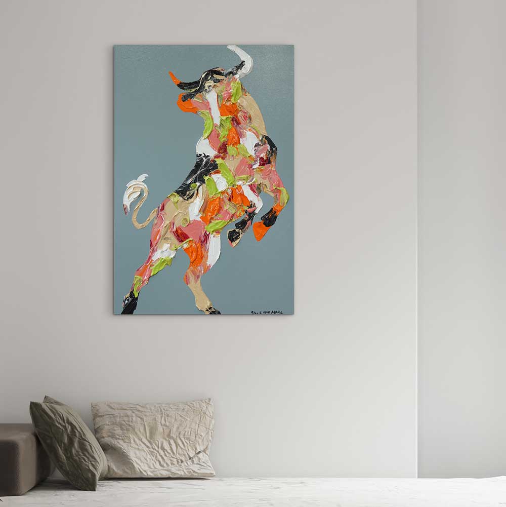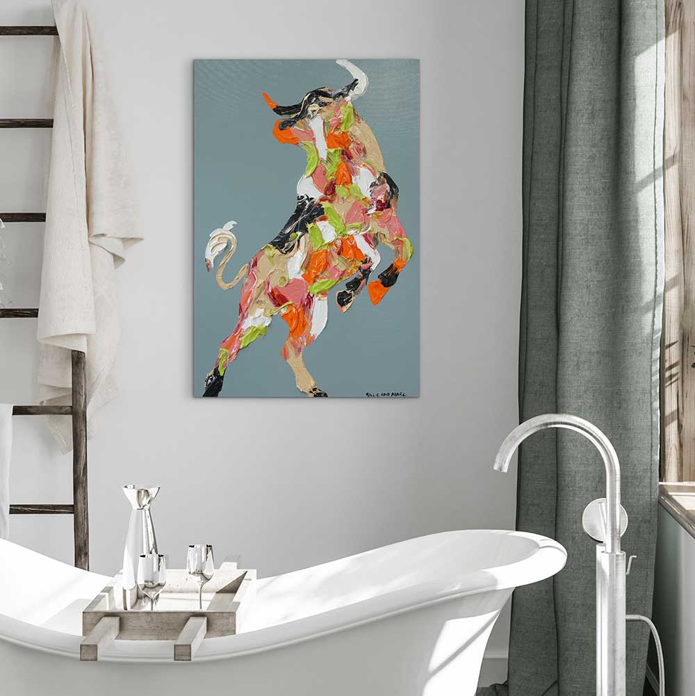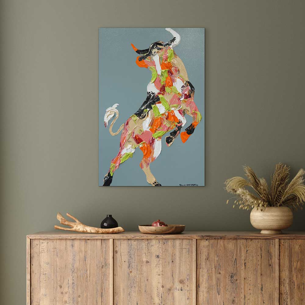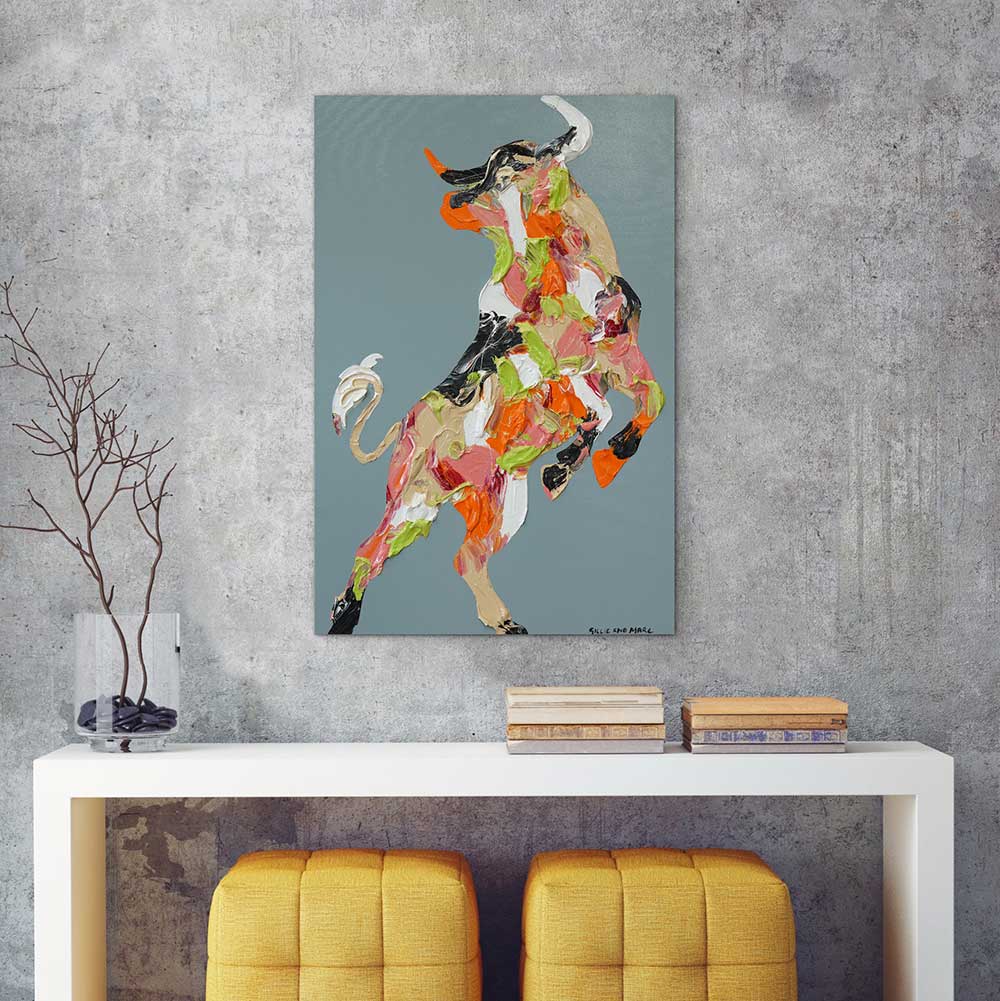 Description "Orion the Spirited Bull" is a captivating painting that captures the essence of a powerful bull facing the camera with unwavering spirit. The artist skillfully portrays the bull's strength and determination, while behind it, a moving silhouette in pastel evokes a sense of melancholy, symbolizing the gradual disappearance of these magnificent creatures due to the cruel sports they are subjected to. The dynamic brushstrokes and the interplay of paint and pastel create a sense of movement, further emphasizing the urgency to protect and preserve these animals.