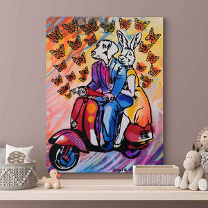Description This is fantastic artwork by Gillie and Marc, featuring their iconic characters Rabbitwoman and Dogman. The vibrant graffiti-style background, filled with splashes of color and energetic patterns, adds a dynamic feel to the piece. In this version, the duo is seen riding a red scooter, with Rabbitwoman embracing Dogman from behind—a recurring theme in their work that symbolizes love, trust, and togetherness. The addition of beautifully detailed butterflies, this time in blue, enhances the sense of freedom and adventure. The piece reflects the artists' signature pop-art and street-art fusion, celebrating the joy of shared journeys.