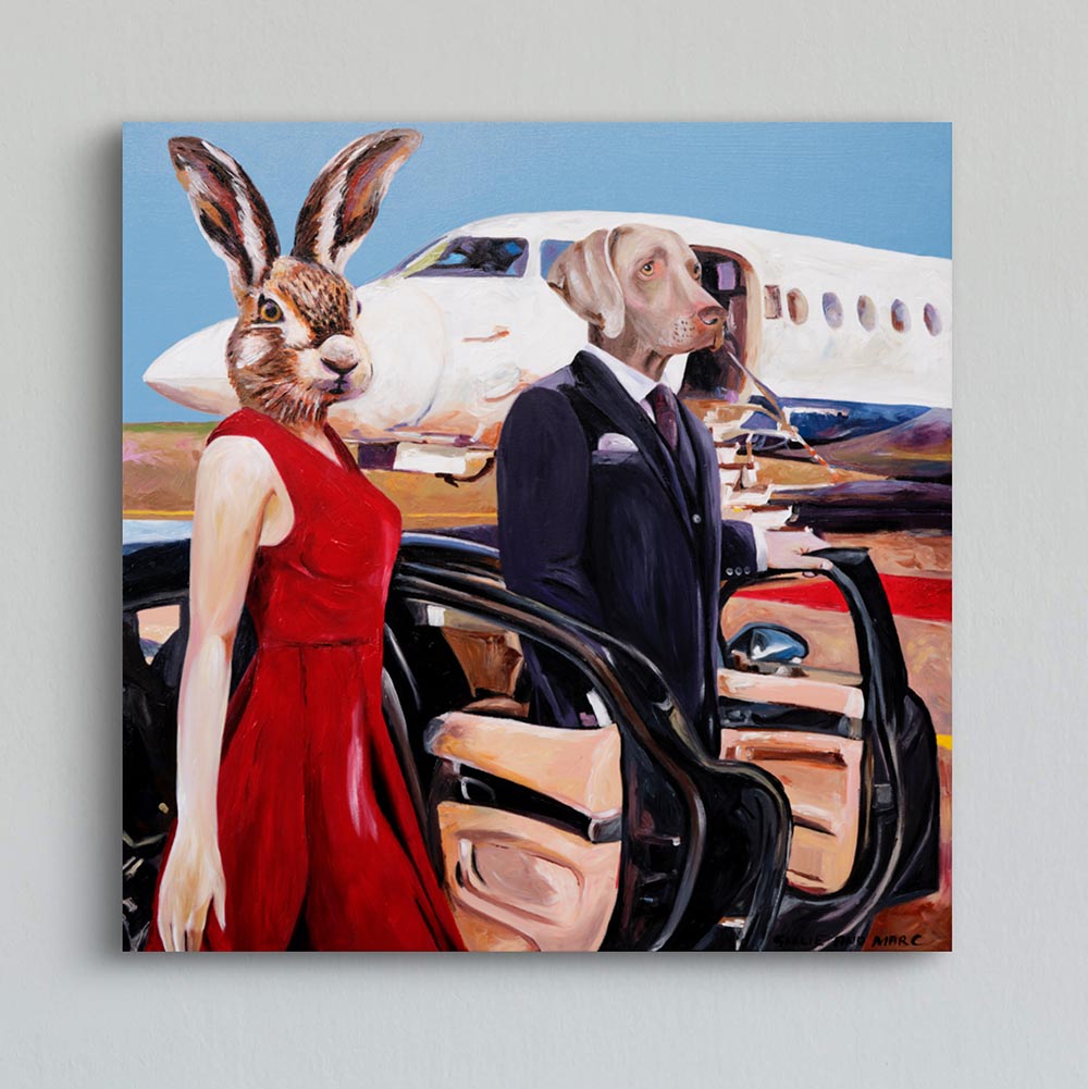 Description This intriguing artwork, titled "On a Jet Plane," vividly captures the essence of luxury and sophistication through an imaginative, anthropomorphic style. The unique portrayal of rabbitwoman and dogman in elegant attire, preparing to board a private jet, symbolizes the allure, elegance, and high-class lifestyle associated with air travel. The vibrant colors and meticulous details highlight the sophistication and exclusivity of the scene, evoking a sense of adventure and opulence. Each brushstroke adds depth and character, bringing the anthropomorphic figures to life in a way that is both captivating and whimsical. "On a Jet Plane" serves as a playful reminder of the allure of travel and the dream of experiencing life’s luxuries with grace and style.