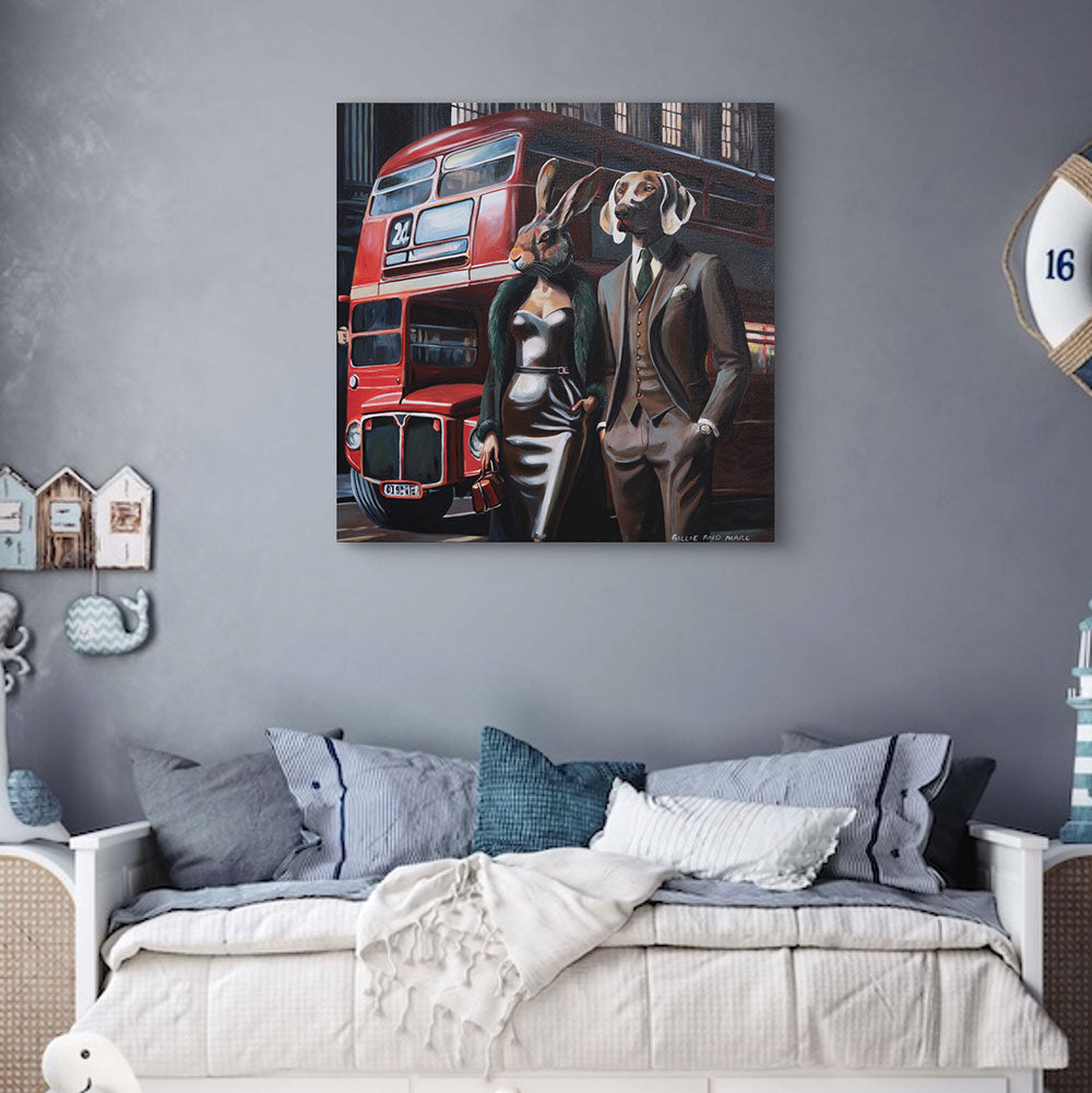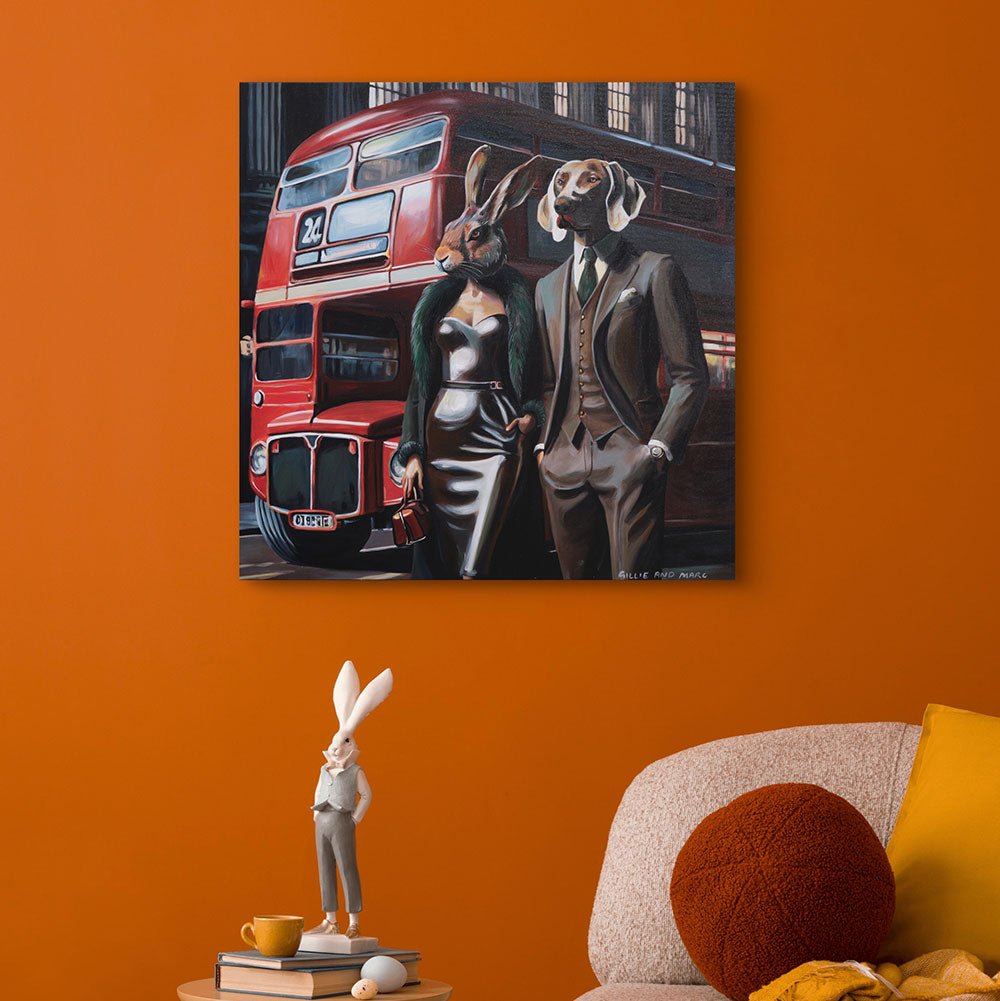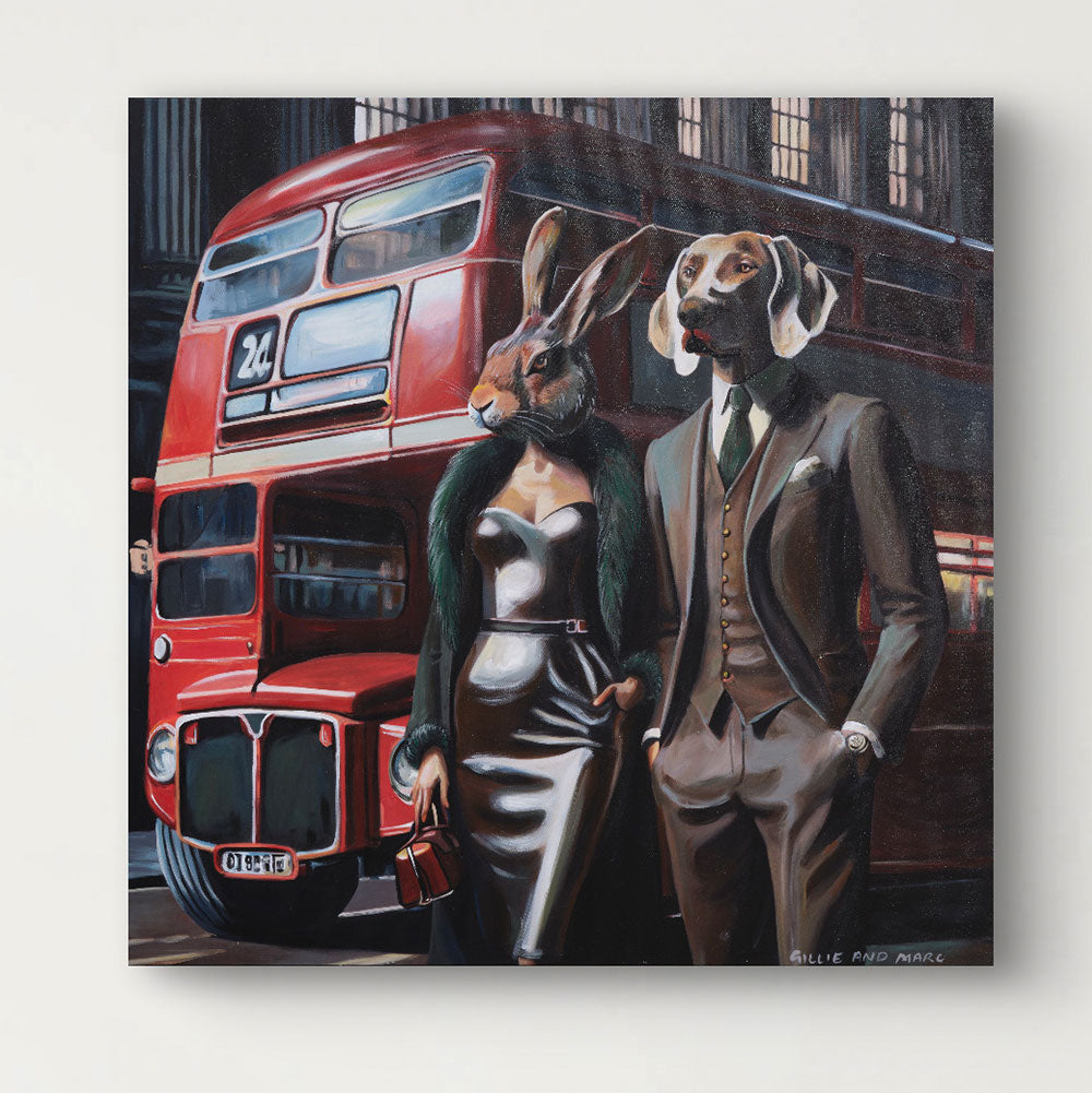 Description In this playful yet elegant painting, the rabbitwoman and dogman, anthropomorphized with their human-like attire, walk confidently through the urban landscape, embodying a sophisticated yet wild persona. The luxurious fur coats and sharp suits contrast beautifully with the classic red double-decker bus in the background, adding a touch of high fashion to the street scene. The juxtaposition of the animal features with their poised, human-like poses invites a whimsical narrative, blending the charm of the animal kingdom with the elegance of the city. This artwork highlights the unexpected fusion of the natural and the fashionable, celebrating individuality and style.