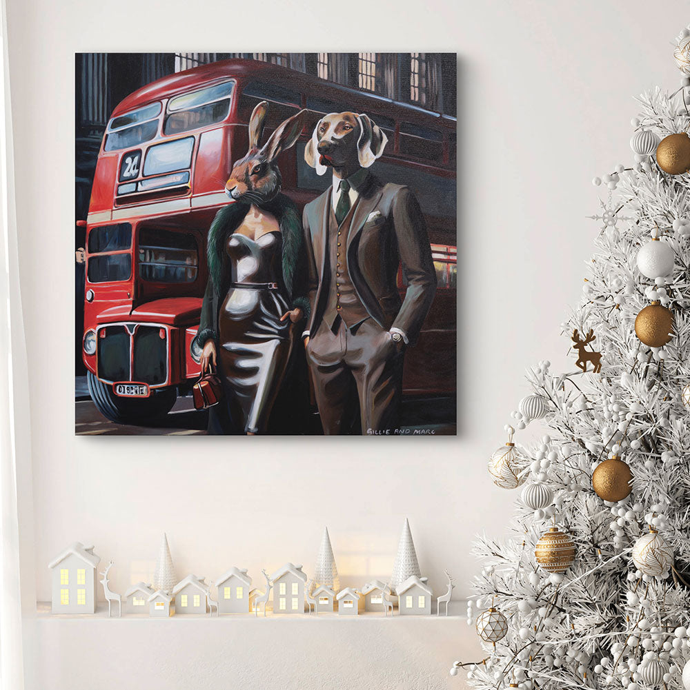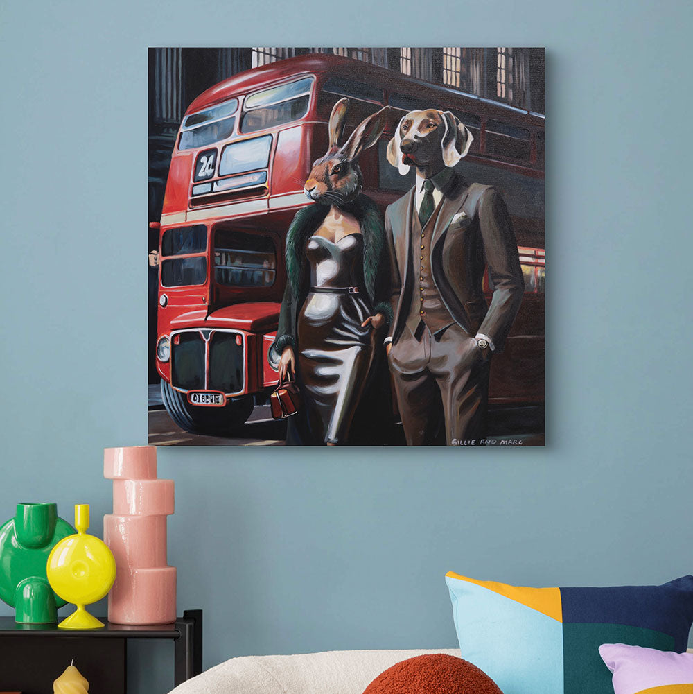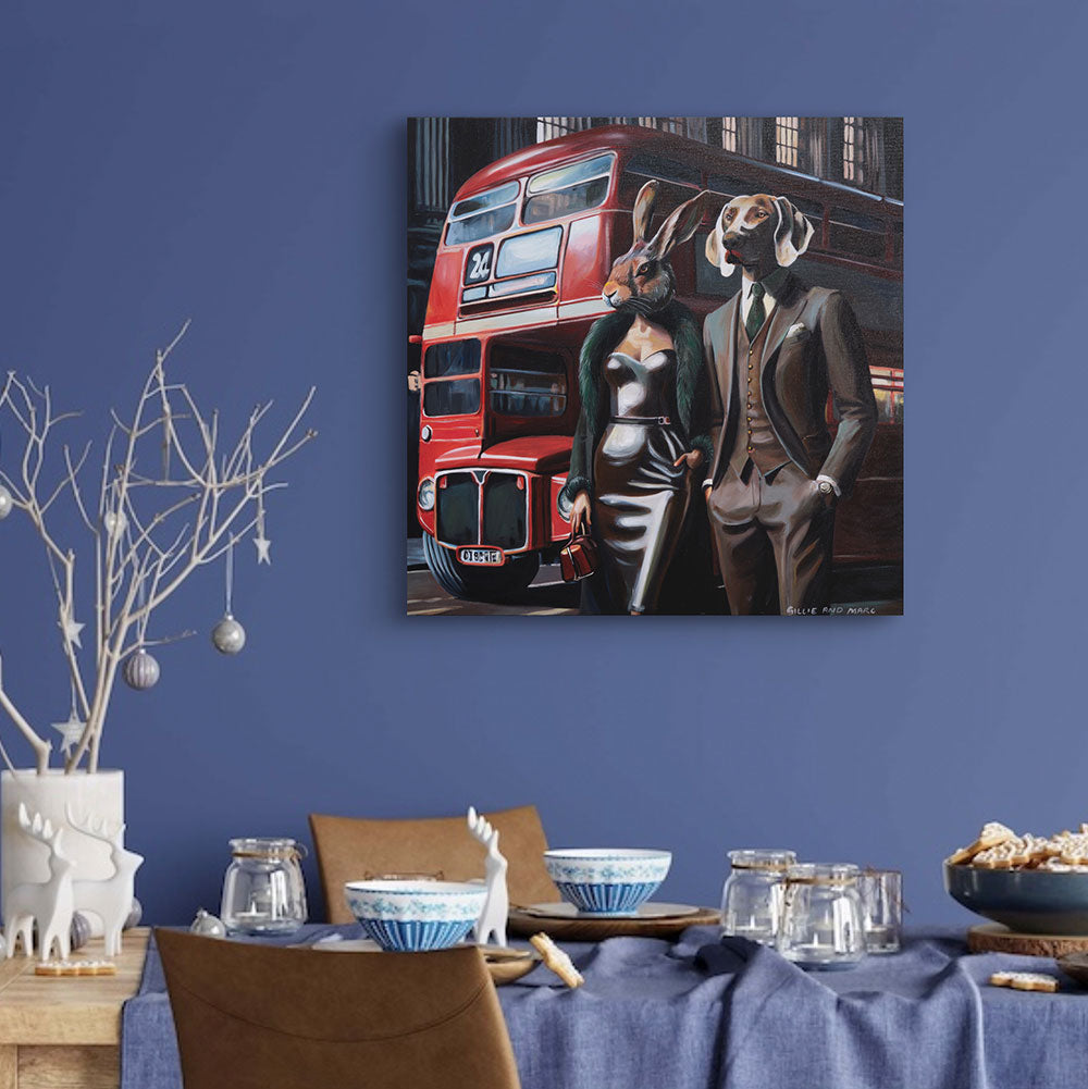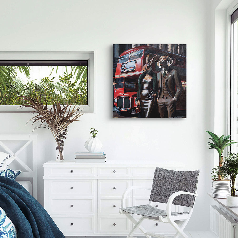 Description In this playful yet elegant painting, the rabbitwoman and dogman, anthropomorphized with their human-like attire, walk confidently through the urban landscape, embodying a sophisticated yet wild persona. The luxurious fur coats and sharp suits contrast beautifully with the classic red double-decker bus in the background, adding a touch of high fashion to the street scene. The juxtaposition of the animal features with their poised, human-like poses invites a whimsical narrative, blending the charm of the animal kingdom with the elegance of the city. This artwork highlights the unexpected fusion of the natural and the fashionable, celebrating individuality and style.