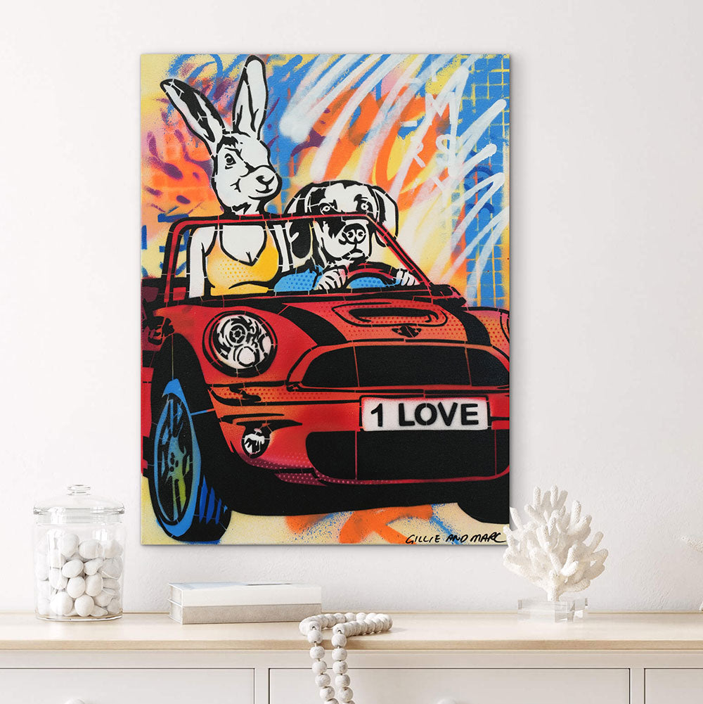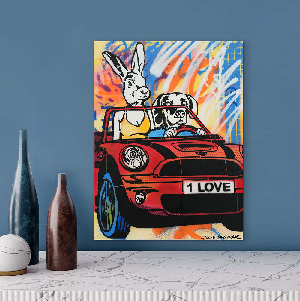 Description On the Road Again captures Rabbitwoman and Dogman in their iconic red convertible, cruising forward with confidence and joy. Set against a backdrop of bold spray-painted colours and energetic motion lines, the scene is bursting with movement and freedom. The number plate, “1 LOVE,” reminds us that every journey — no matter the destination — is powered by love, partnership, and the thrill of exploring the world together.