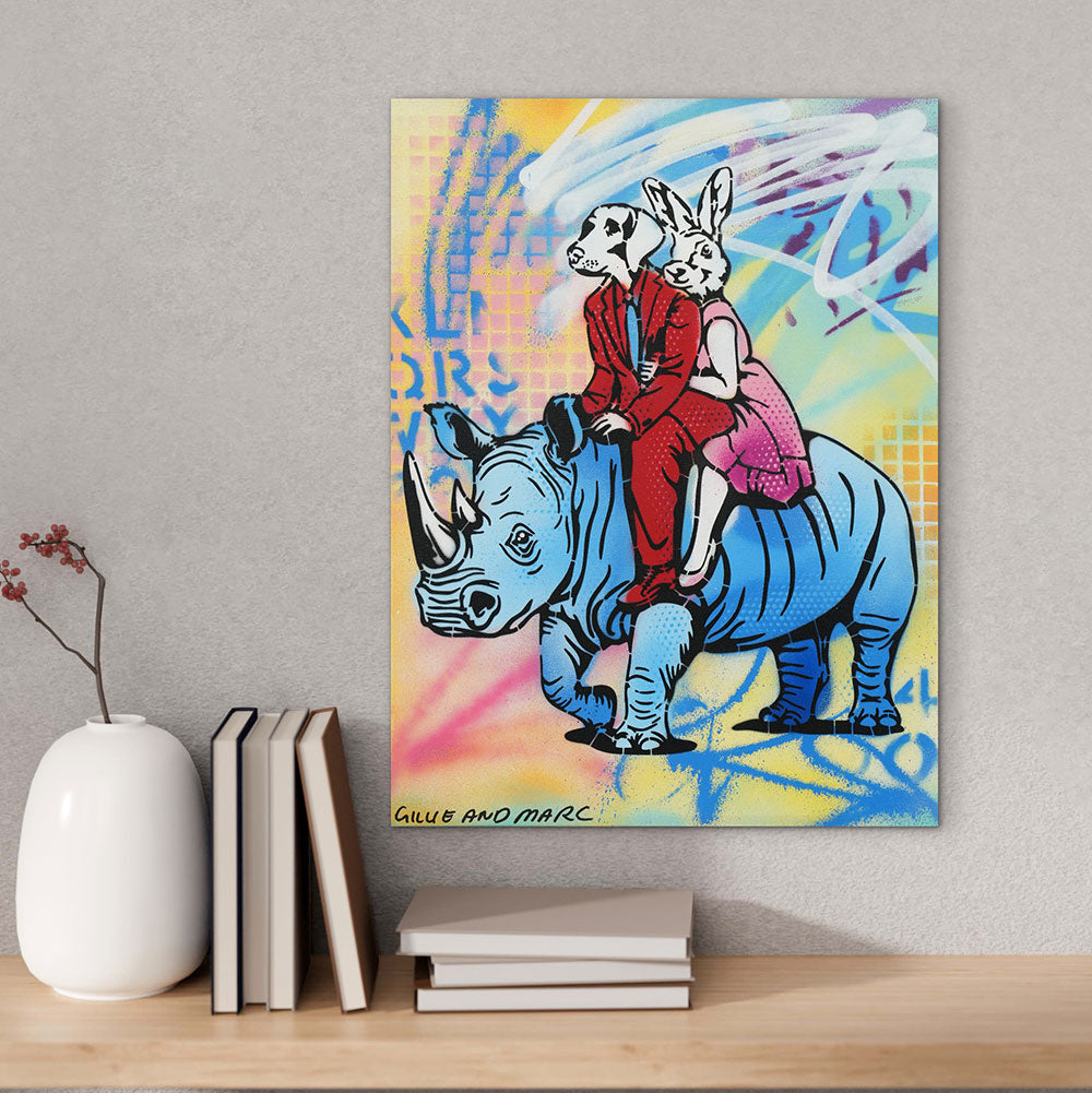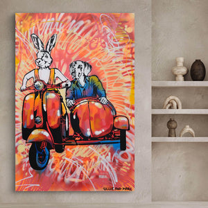 Description This artwork, "On the Road to Rome" by Gillie and Marc, features their beloved characters, Rabbitwoman and Dogman, on a vibrant red scooter with a sidecar. This piece continues their exploration of adventure, love, and companionship. In this composition, Rabbitwoman takes the lead, confidently steering the scooter, while Dogman sits in the sidecar, seemingly surprised or deep in thought. The dynamic graffiti-style background, with its bold, swirling colors, adds a sense of energy and movement. The use of pop-art aesthetics and street-art elements makes this painting feel both modern and timeless, capturing the joy of shared experiences and travel. The title suggests a journey to Rome, a city known for romance, history, and culture—aligning perfectly with the themes of their work.