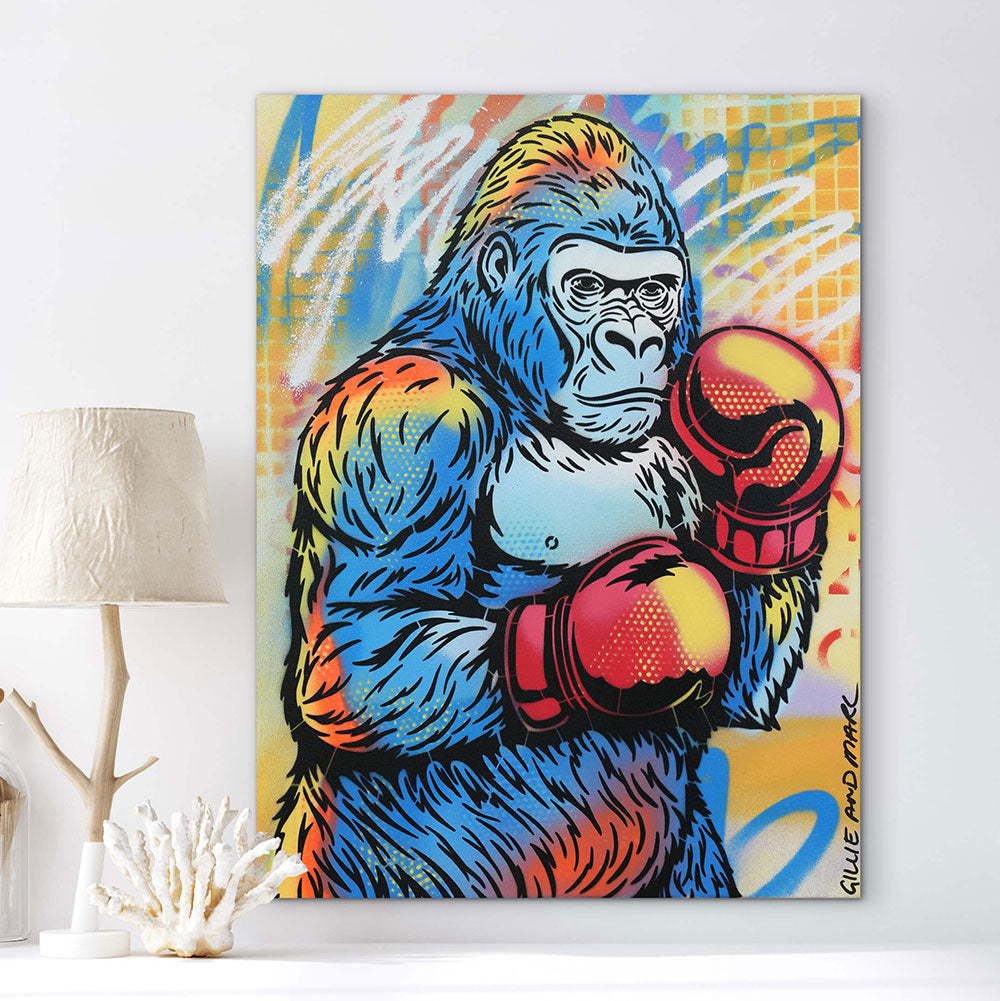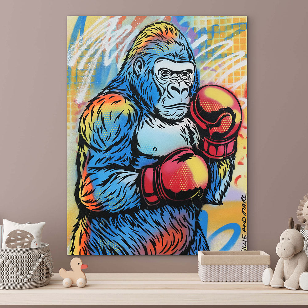 Description This dynamic painting features a gorilla in full boxing form, wearing bright red gloves and striking a powerful pose. The vivid use of colors, such as bold pinks, yellows, and greens, contrasts with the soft beige background, adding energy and intensity to the composition. The gorilla's fierce expression and muscular frame emphasize its strength and determination, while the abstract brushstrokes enhance the sense of motion and power. This artwork captures the essence of raw energy and the spirit of combat, symbolizing a fierce force ready to take on anything in its path.