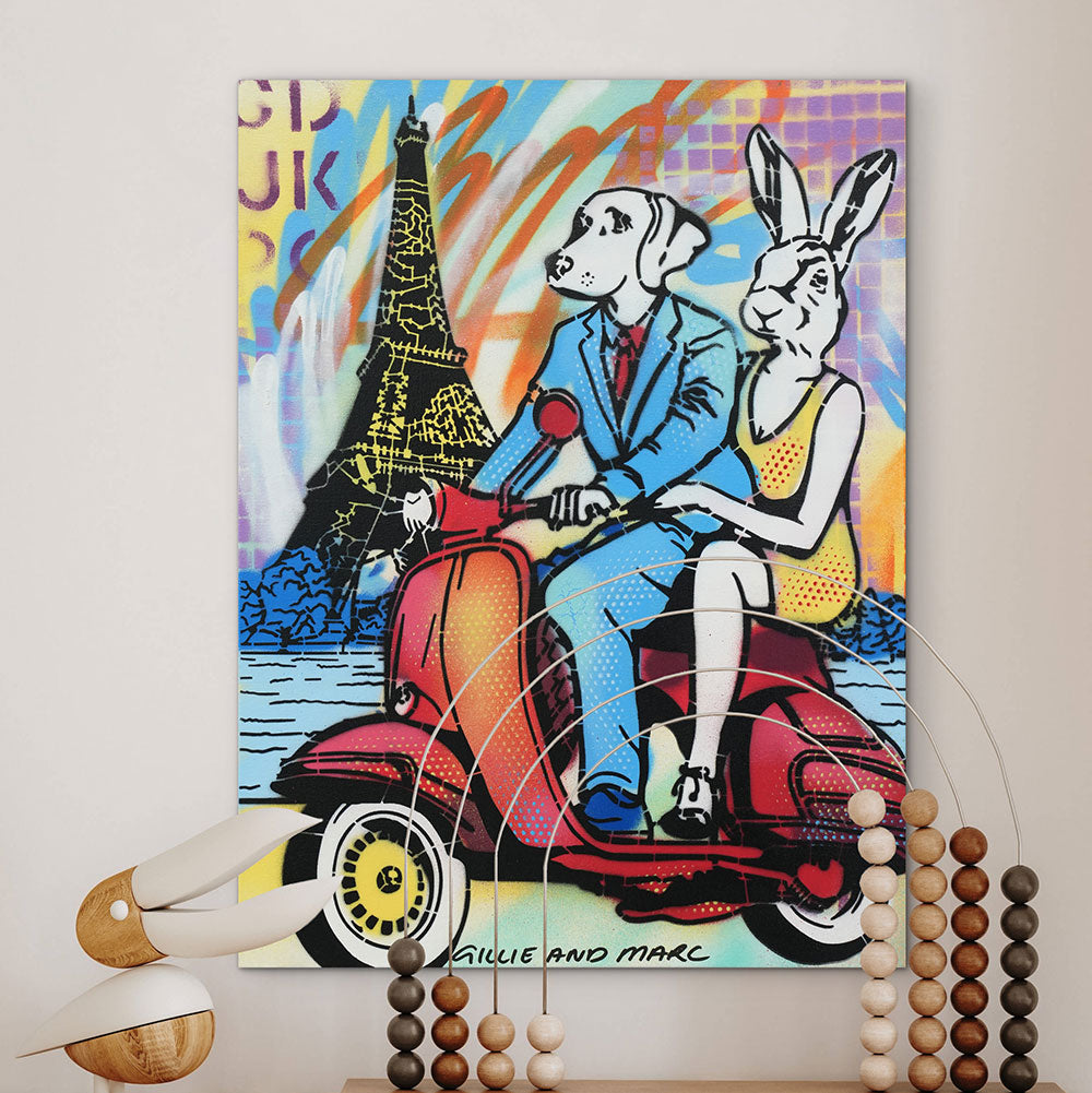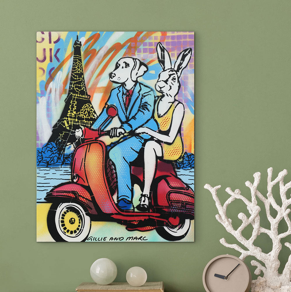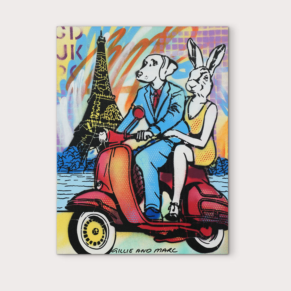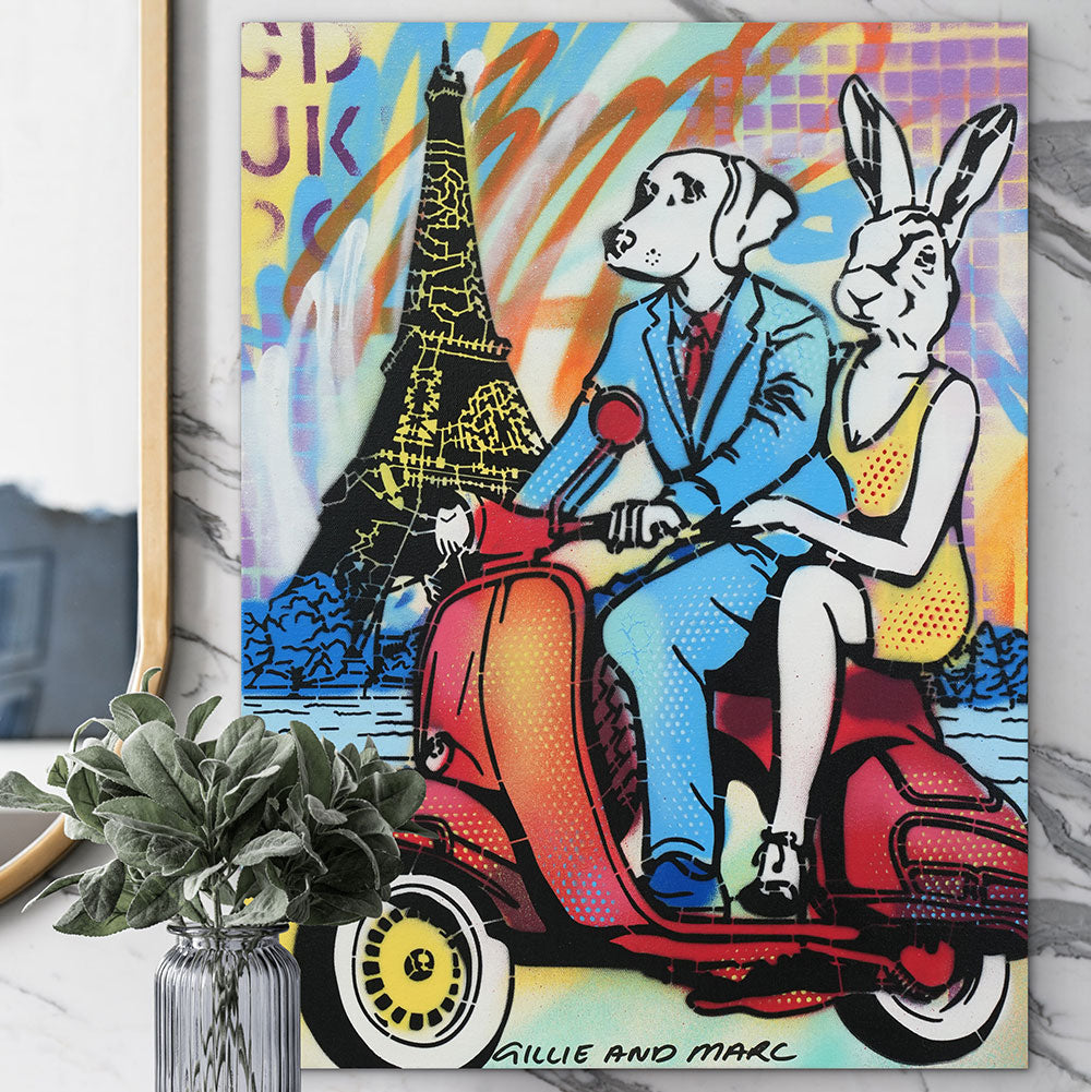 Description Rabbitwoman and Dogman ride their red scooter through the romantic streets of Paris, the Eiffel Tower rising gracefully behind them. The vibrant palette of neon pinks, yellows, and blues bursts with the energy of love and wanderlust. As they journey together, they remind us that life’s path—though finite—is made infinite through shared moments and connection. This striking pop-street artwork celebrates adventure, companionship, and the beauty of living boldly in colour.