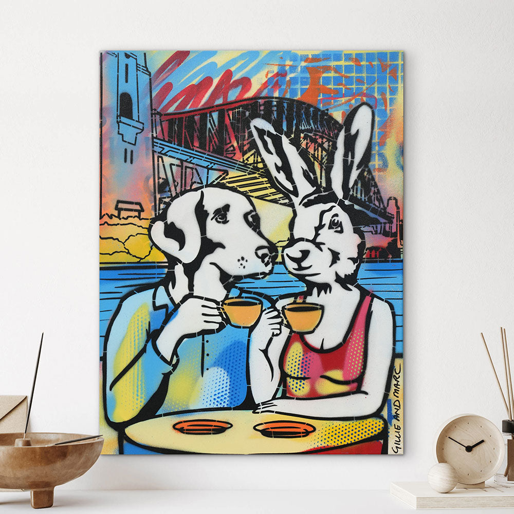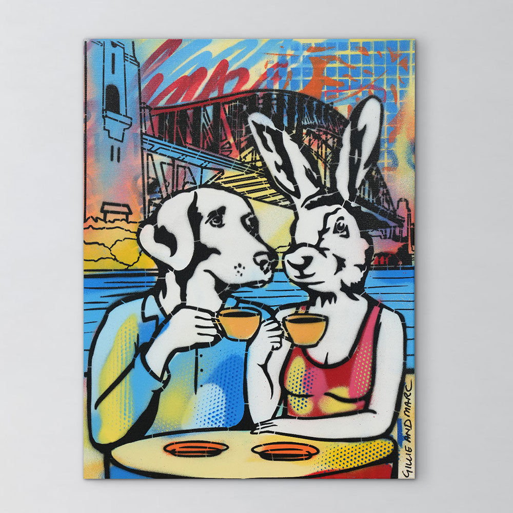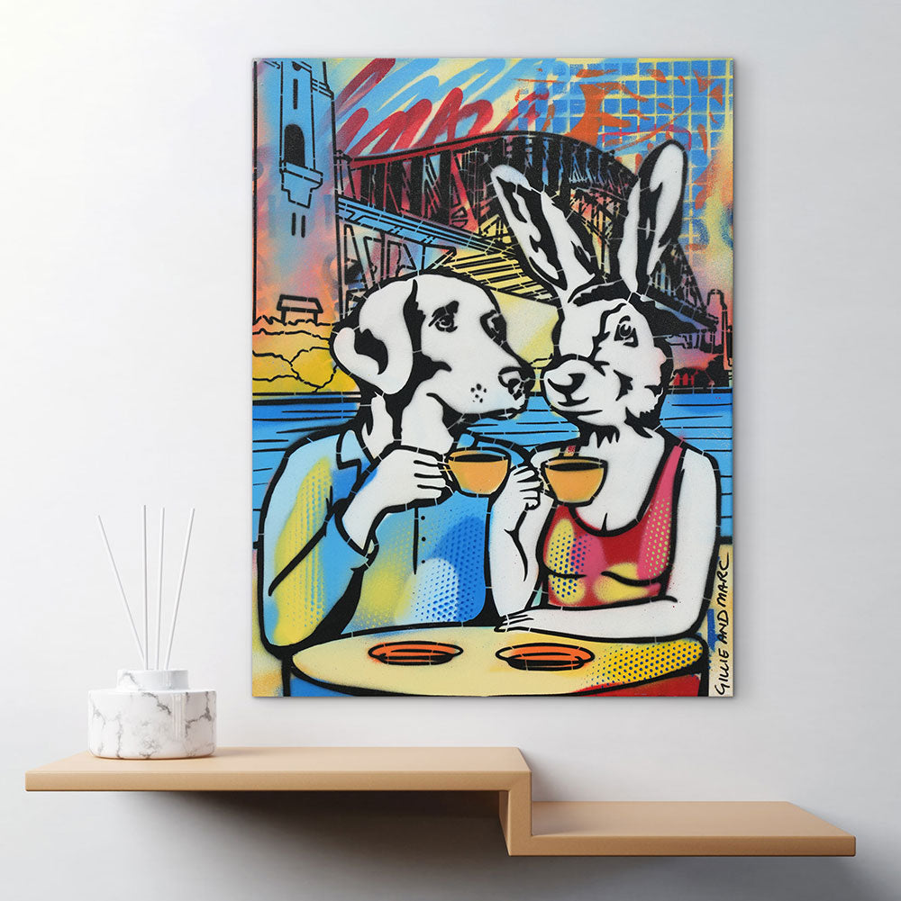Description With the Sydney Harbour Bridge in the background, Rabbitwoman and Dogman share a quiet coffee together, their expressions filled with warmth and love. The vibrant colours and layered stencils capture the energy of the city while reflecting the calm intimacy between the two. In Our Forever Begins Here, Gillie and Marc celebrate the beauty of simple moments — the kind that anchor us, remind us of love’s constancy, and mark the beginning of something everlasting.