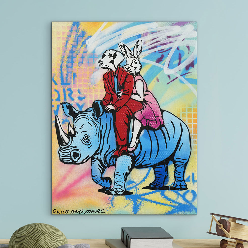 Description In Our Love, Our Compass, Rabbitwoman and Dogman ride gracefully atop a majestic rhino, their bodies leaning gently into one another as they journey forward. The radiant colours — soft blues, warm yellows, and vibrant pinks — swirl around them, creating a dreamlike landscape full of movement and hope. This artwork celebrates love as a guiding force, a compass that leads two hearts toward adventure, courage, and a shared sense of purpose.