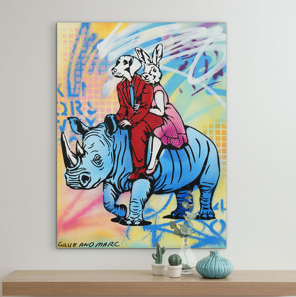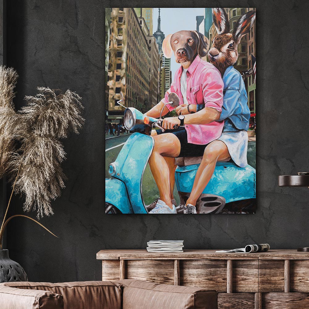 Description This vibrant artwork by Gillie and Marc captures Rabbitwoman and Dogman on a classic blue scooter, embodying love, adventure, and companionship. Dressed in elegant attire, Dogman steers confidently while Rabbitwoman embraces him from behind, symbolizing trust and unity. The graffiti-inspired background bursts with dynamic energy, mirroring the excitement of their journey. This piece reflects the artists' signature blend of pop-art and street-art aesthetics, celebrating love as a boundless adventure.