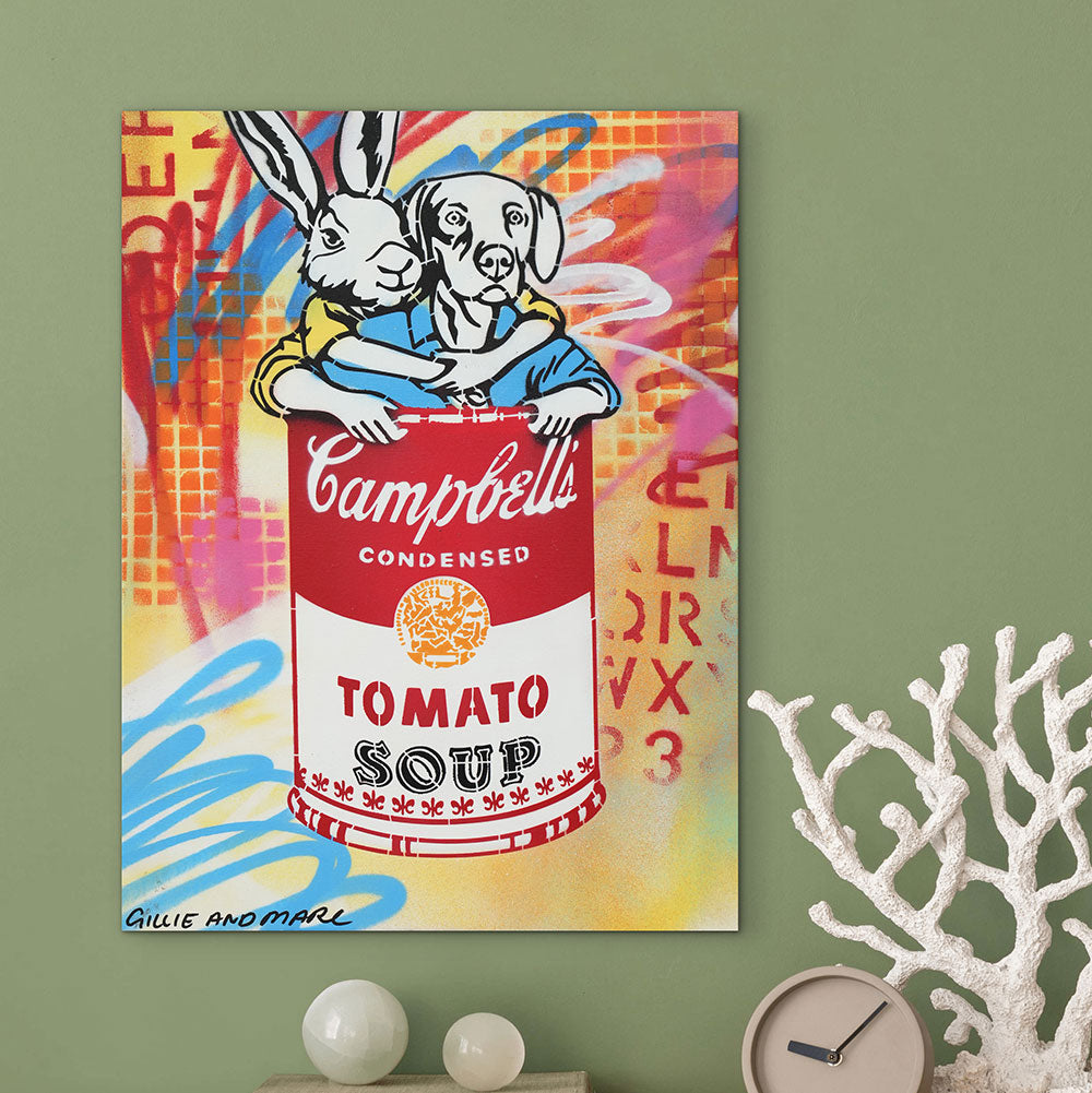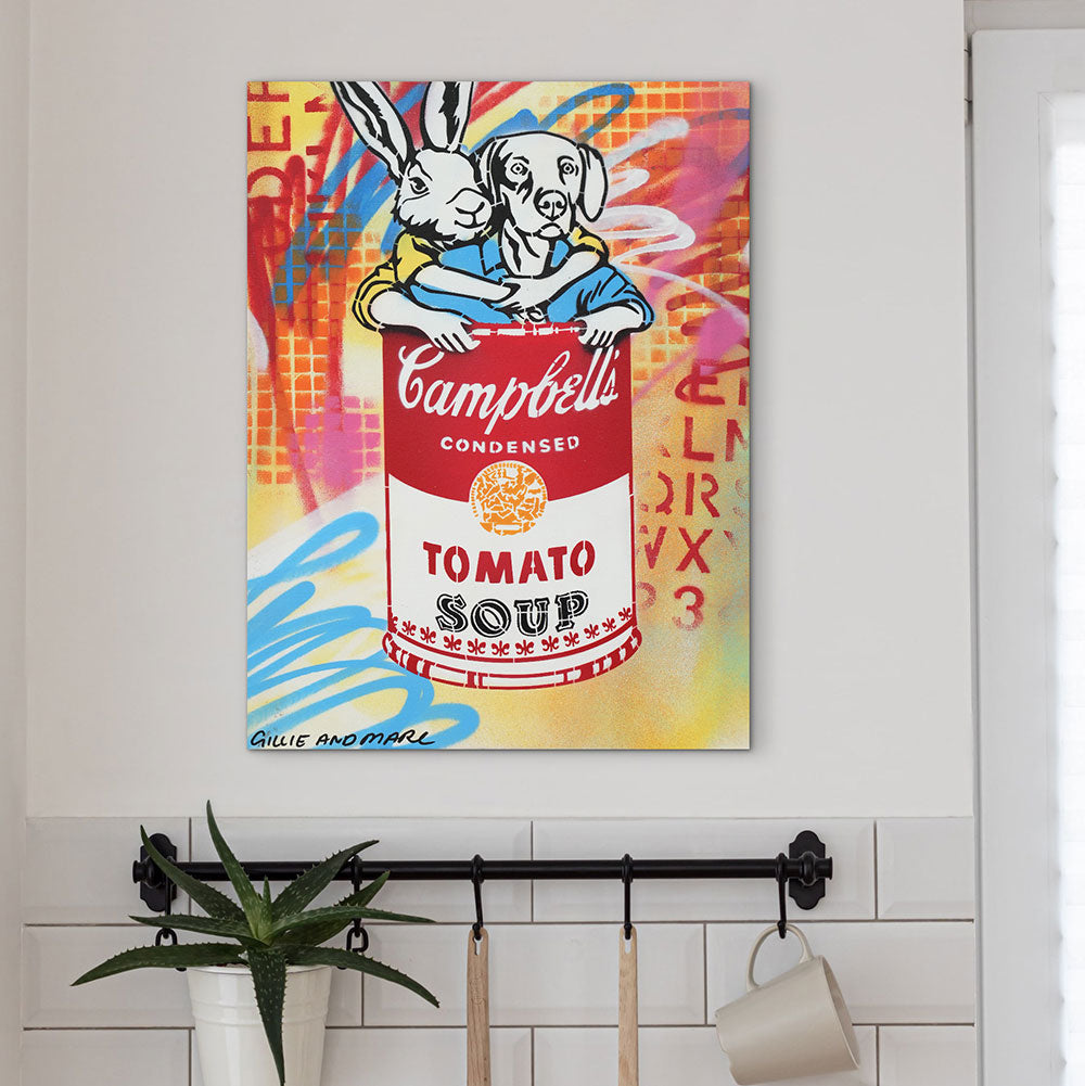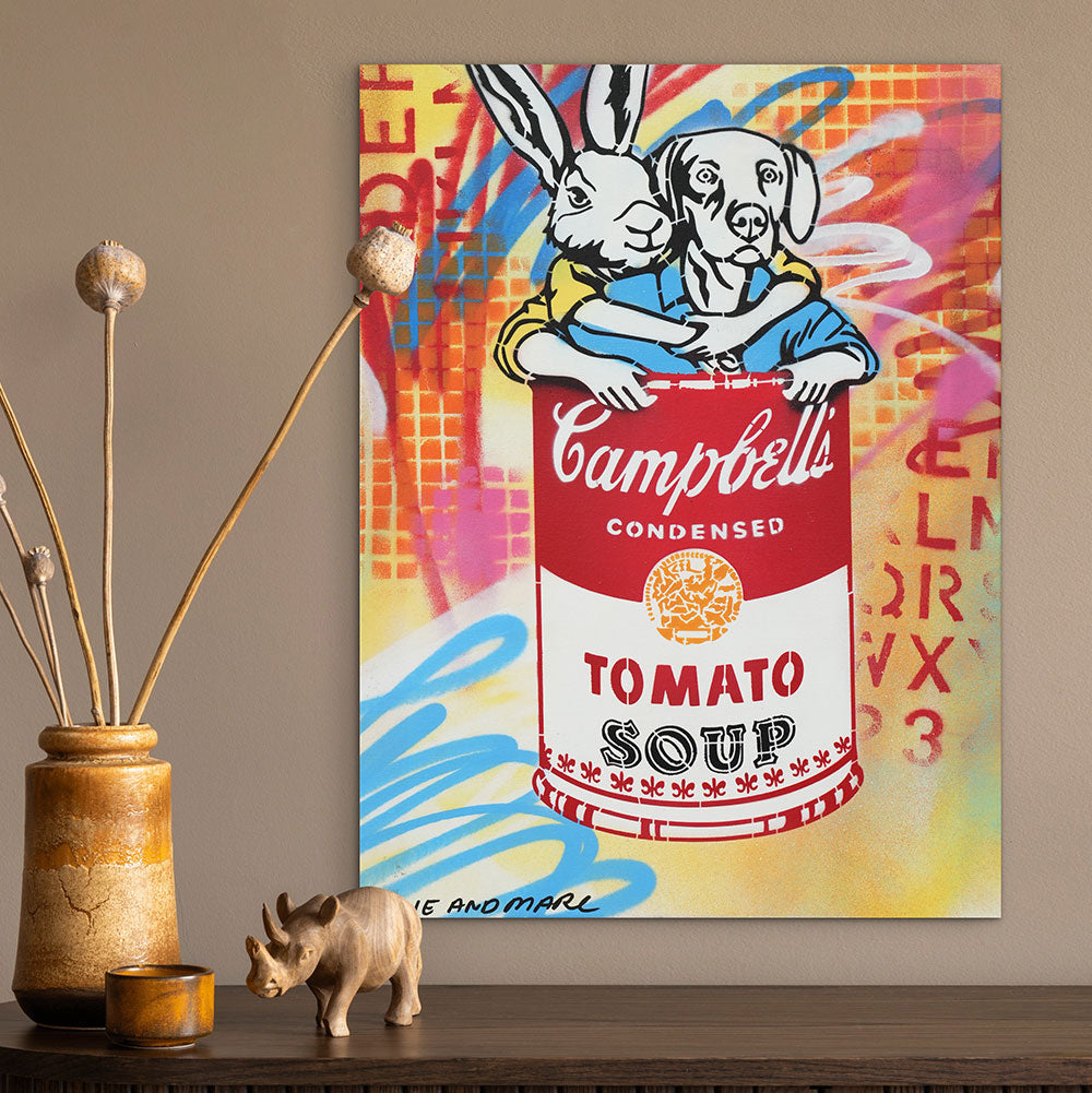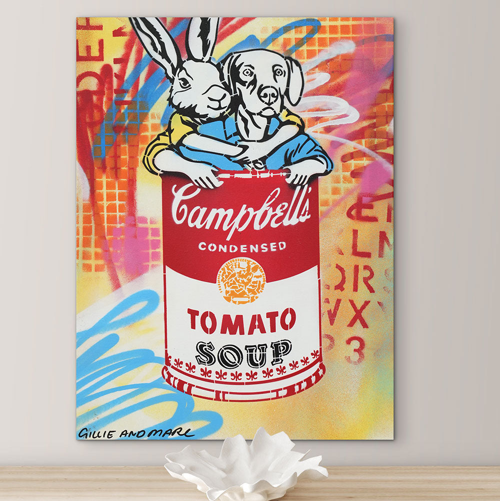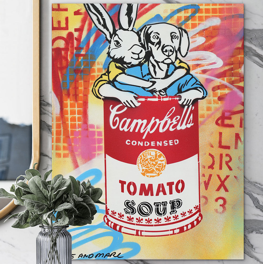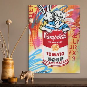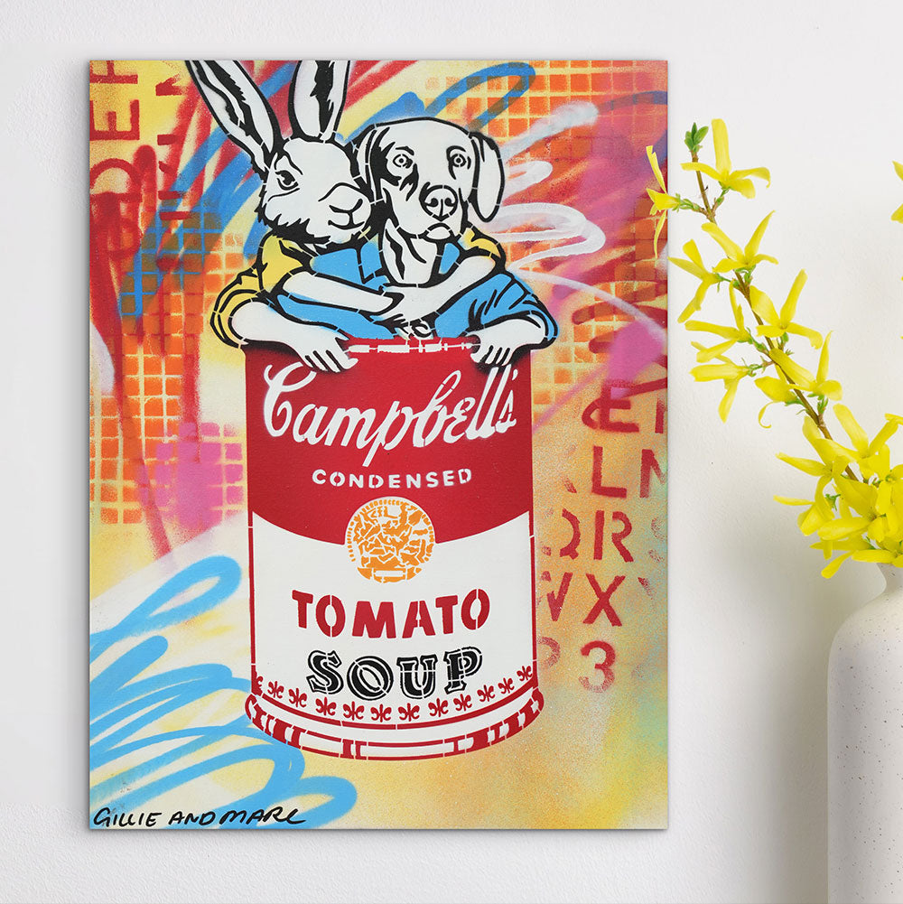 Description InOur Souls Remember, Rabbitwoman and Dogman embrace over the iconic Campbell’s soup can, merging contemporary pop art with themes of love and nostalgia. The familiar red-and-white label nods to Warhol’s legacy while transforming into a symbol of unity and shared memory. Surrounded by Gillie and Marc’s signature explosion of colour and stencil work, the duo remind us that love — like art — is timeless, comforting, and forever etched in the soul.