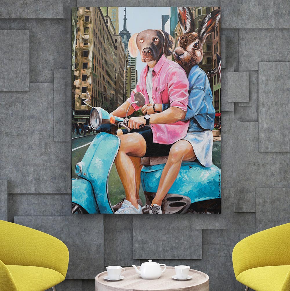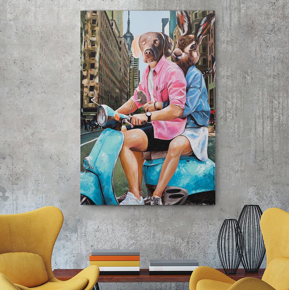 Description On the Road of Love bursts with vibrant energy and texture, portraying Rabbitwoman and Dogman on their iconic scooter ride. The thick impasto strokes create movement and rhythm, as colours collide and dance across the canvas in joyful harmony. Set against a calm grey backdrop, the duo’s journey becomes a symbol of freedom, love, and the thrill of adventure — a celebration of two souls travelling through life together.