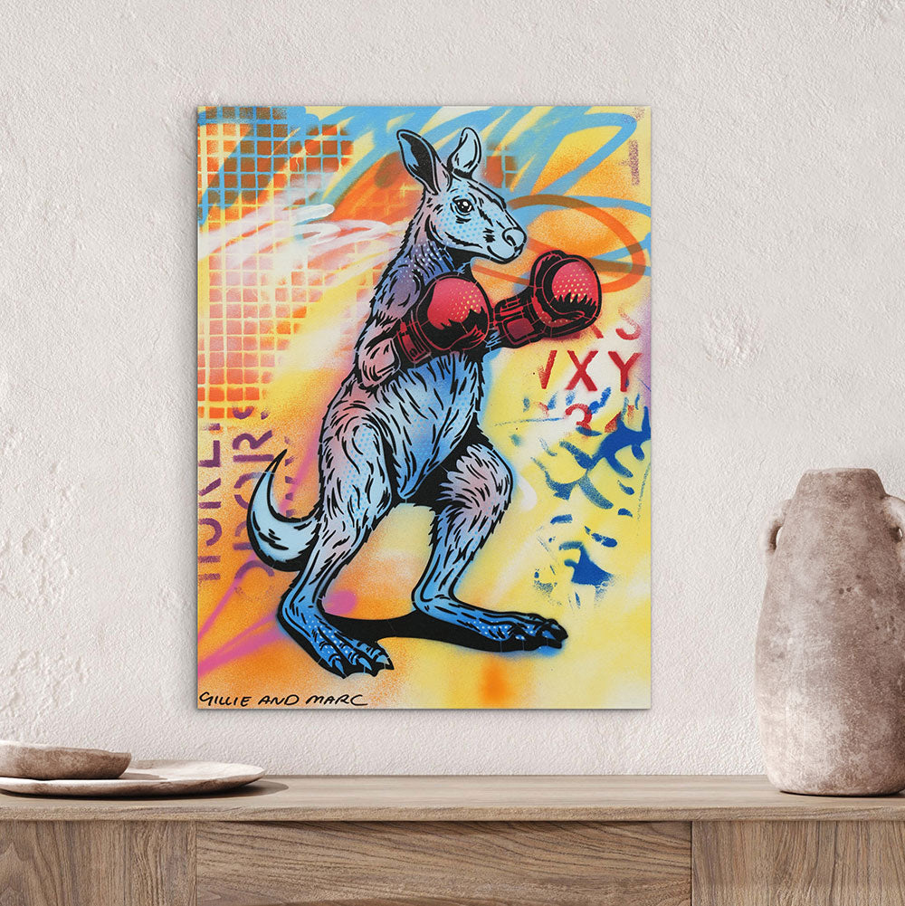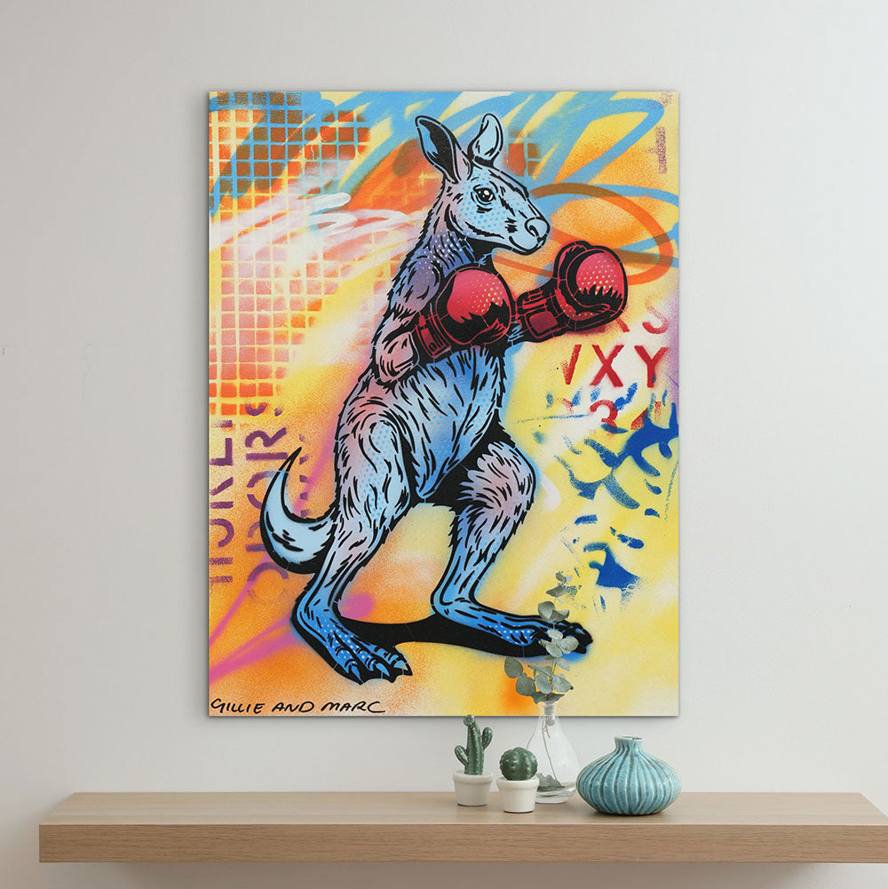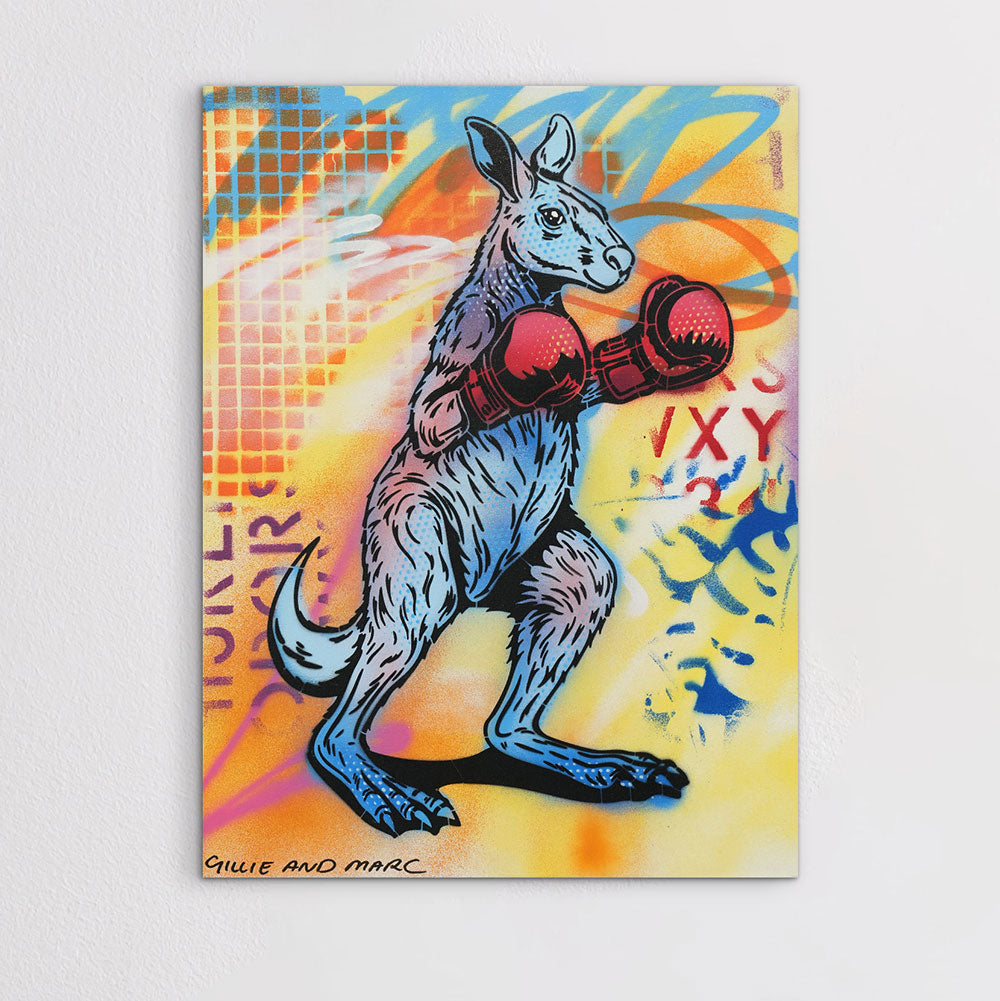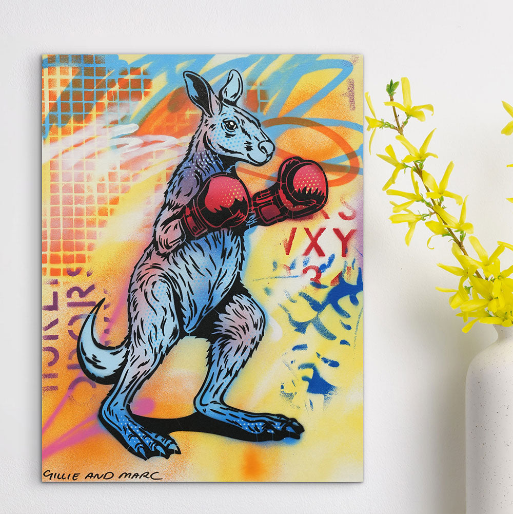 Description In The Infinite Embrace, a bold kangaroo stands strong with bright red boxing gloves, ready to take on the world. Bursting with colour and energy, this artwork celebrates courage, resilience, and the unshakeable spirit of Australia’s wildlife. With Gillie and Marc’s signature pop-street vibrancy, the kangaroo becomes a symbol of strength wrapped in compassion — a reminder that even the fiercest fighters protect what they love.