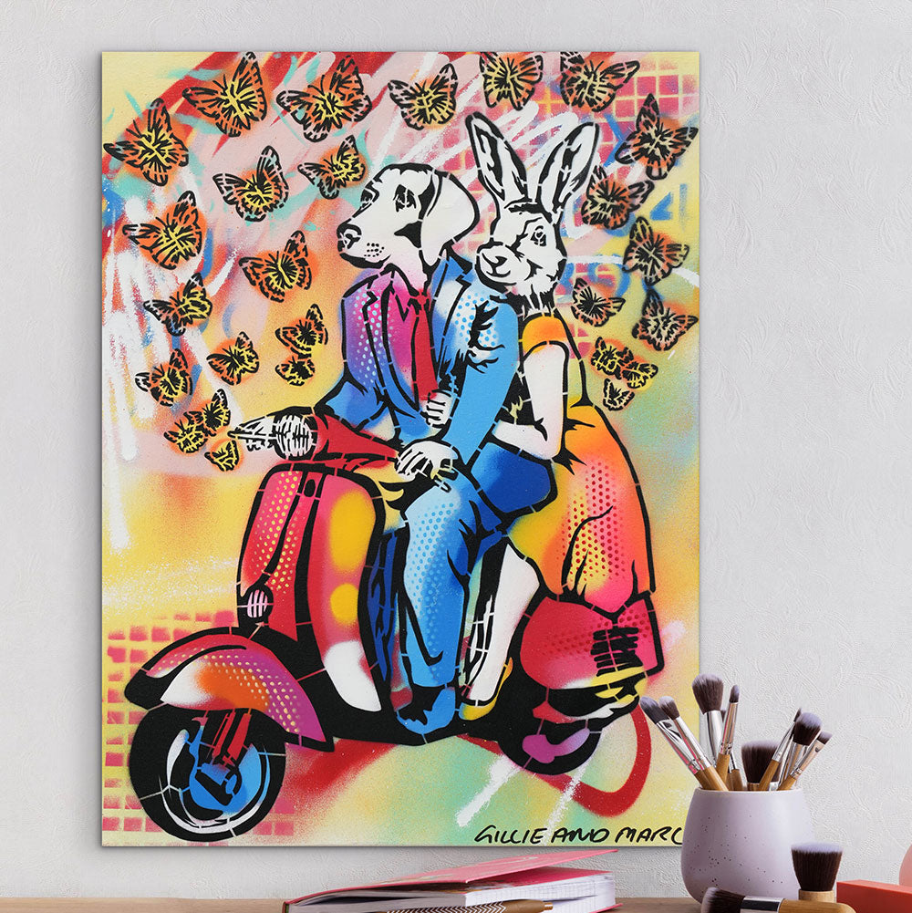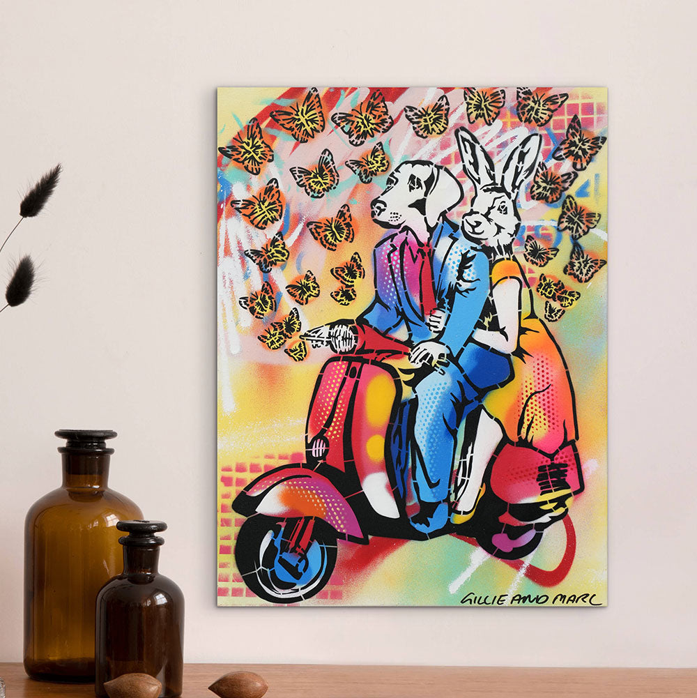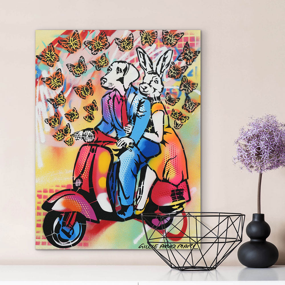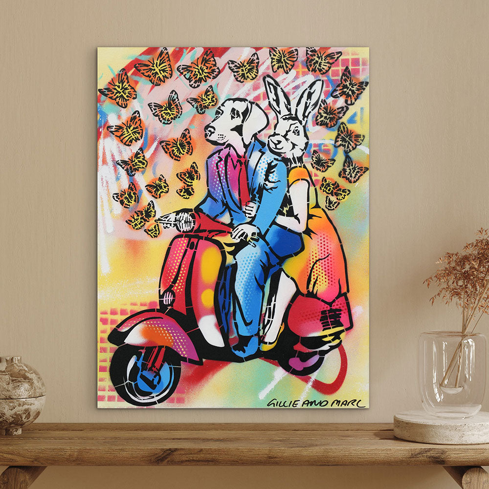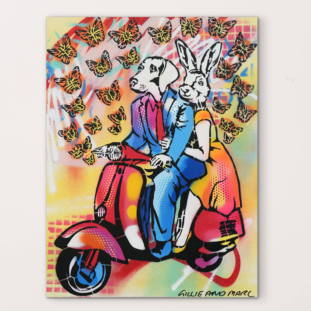 Description The Iconic Escape captures Rabbitwoman and Dogman in a moment of exhilaration and joy as they speed off into a dreamscape filled with glowing butterflies. The scooter ride becomes symbolic of freedom and spontaneity, while the neon palette and spray-paint textures evoke urban energy and pop art rebellion. Wrapped in vibrant colors and movement, the duo’s carefree escape feels both timeless and iconic—a celebration of love, adventure, and the thrill of the ride.
