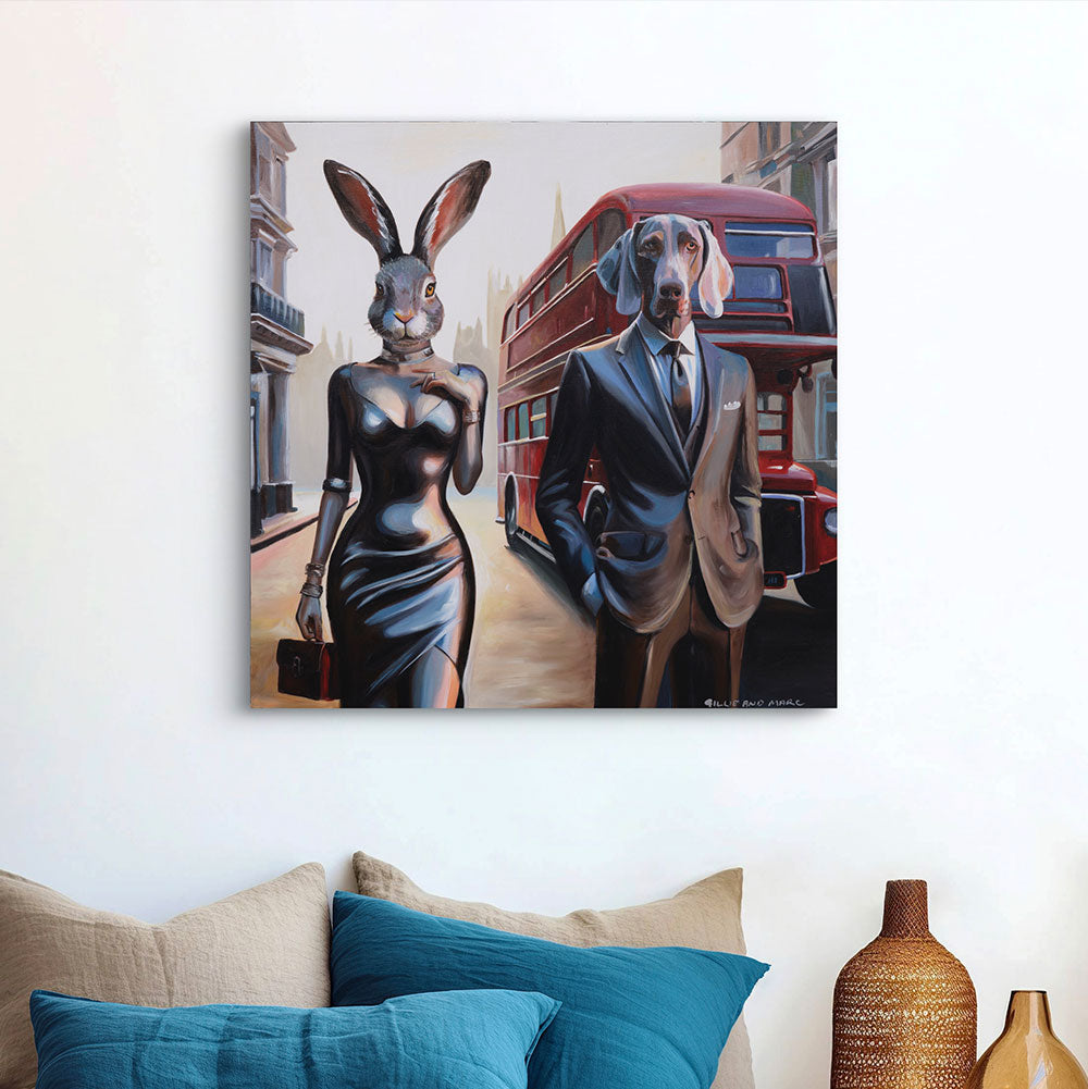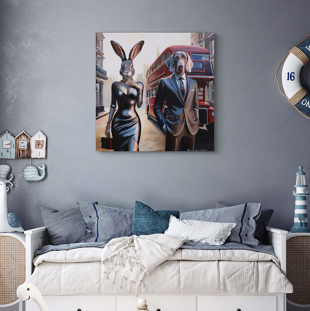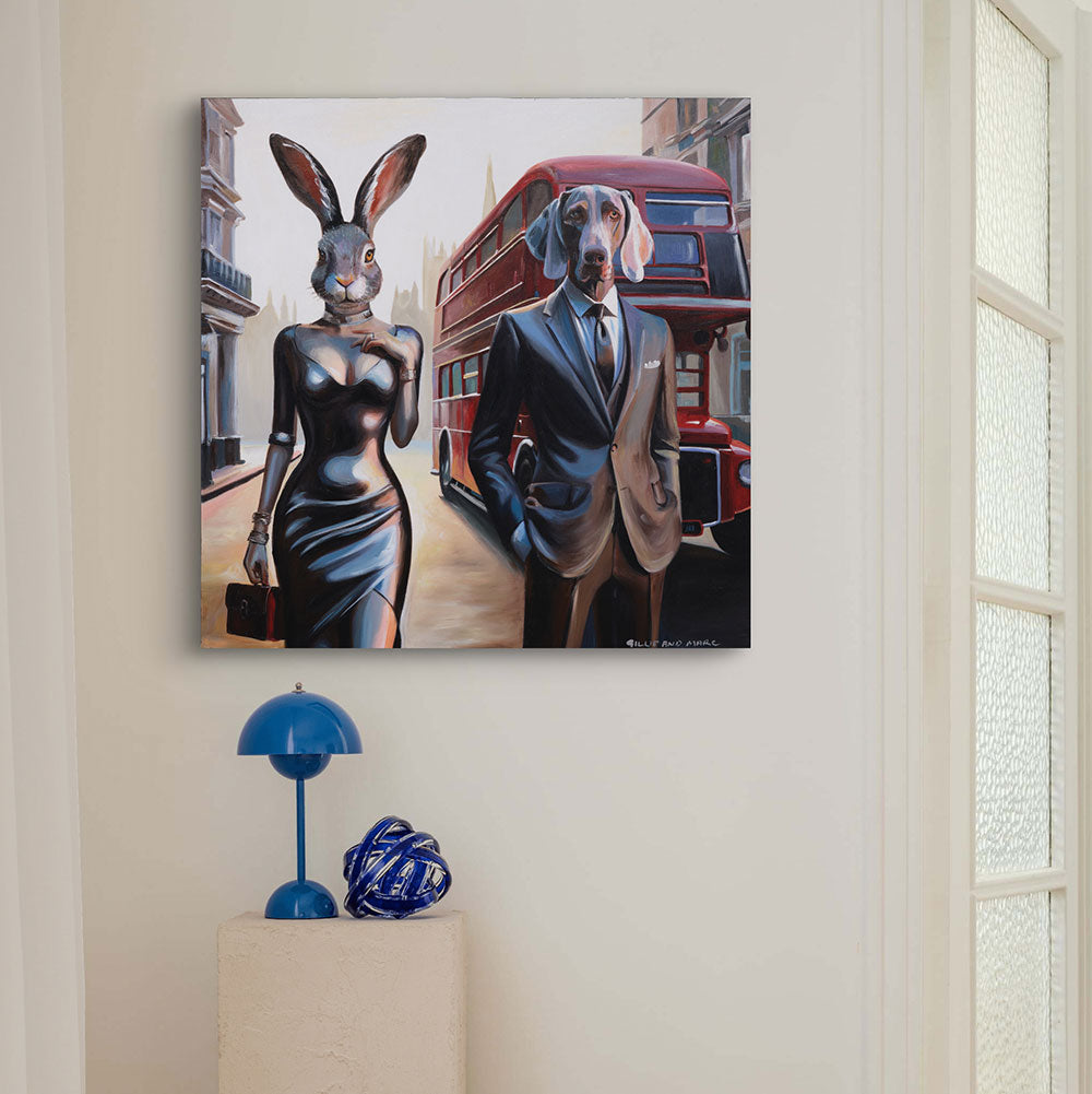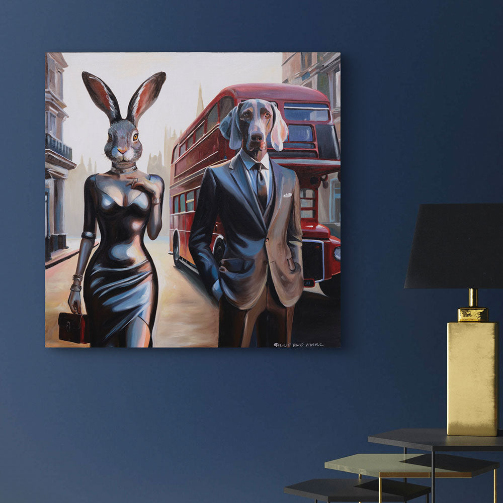 Description Step into the fast-paced rhythm of city life with The Morning Rush. Featuring the iconic Rabbitwoman and Dogman, this painting captures a fleeting moment of quiet amidst the chaos of a daily commute. Dressed impeccably, the duo exudes sophistication and calm, seated on a London double-decker bus as the world rushes past. Through a blend of surrealism and storytelling, the artwork invites the viewer to reflect on the beauty found in life's mundane routines.