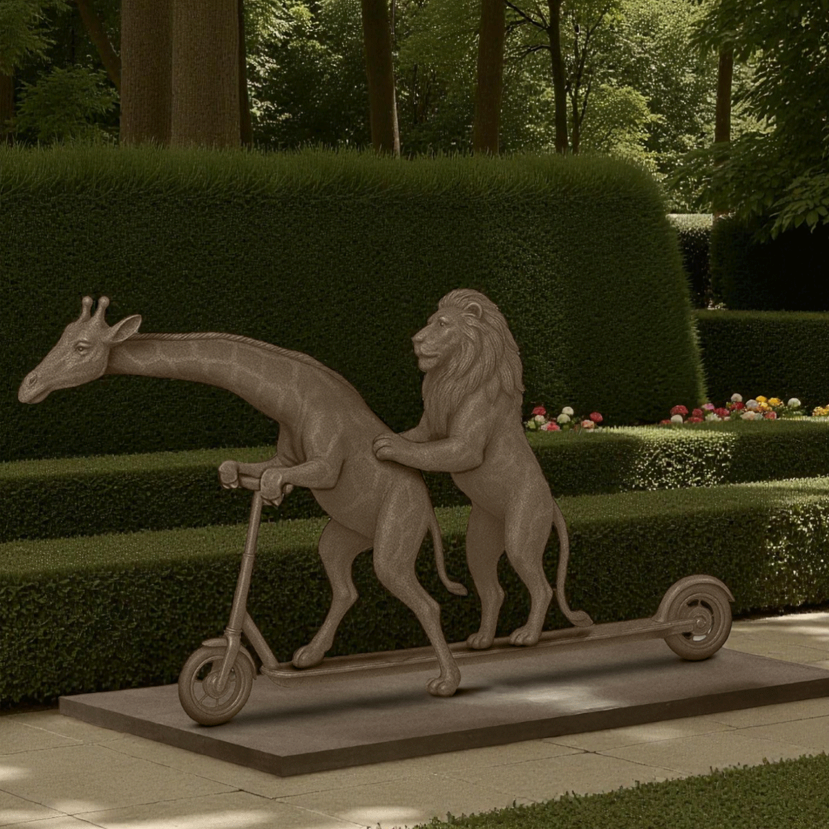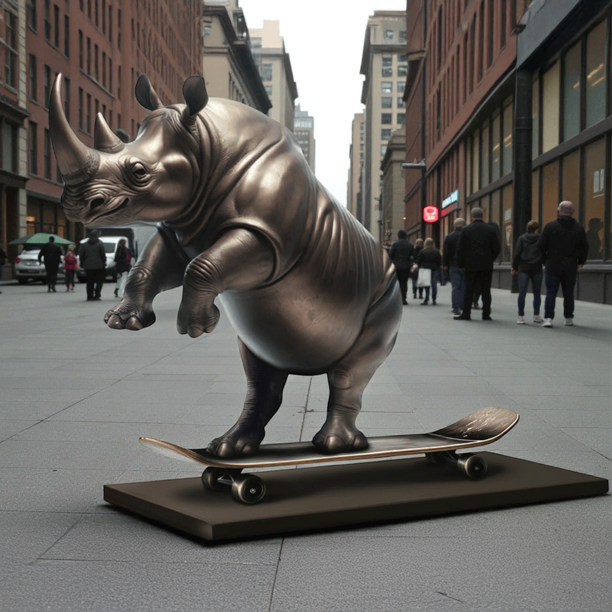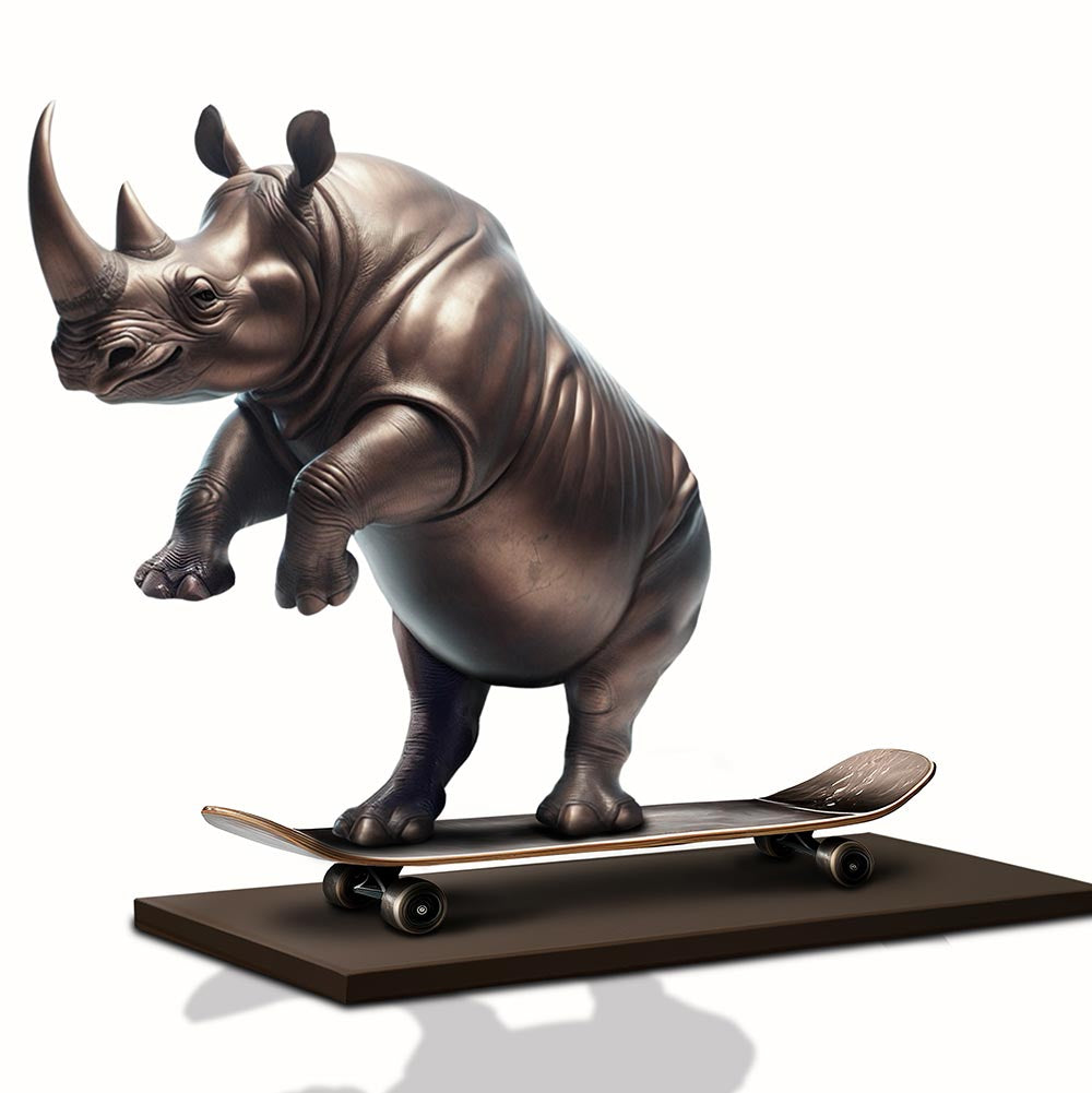 Description The Northern White Rhino Races Against Time on the Skateboard is a bronze sculpture that fuses urgency with whimsy, using playful imagery to deliver a profound message. The piece portrays an endangered northern white rhino mounted on a skateboard, charging forward with determination as if every second matters. While the skateboarding element brings a sense of levity and humor—inviting viewers to smile at the unexpected sight—it also underscores the gravity of the rhino’s plight, as the species teeters on the brink of extinction. This tension between the lighthearted and the serious creates a compelling visual metaphor: the rhino is not just racing for fun, but racing against time itself, a symbol of the urgent fight to preserve biodiversity before it is too late.