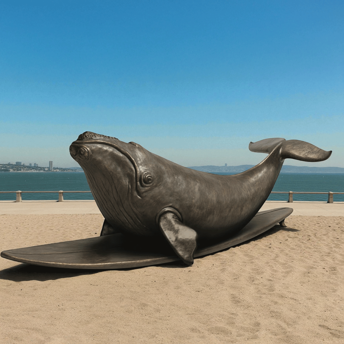Description This bronze sculpture presents the critically endangered North Atlantic right whale in an unexpectedly playful scene—riding a sleek surfboard. The whale, massive yet graceful, appears to glide effortlessly, its immense presence contrasted by the lightness of the board beneath it. At the front of the surfboard, there is a space intentionally designed for the public to join in—inviting them to imagine themselves sharing the thrill of the ride with this majestic creature. This interactive element transforms the piece from a static display into a shared experience, drawing viewers into the world of the whale and the ocean it inhabits. The juxtaposition of the whale’s size and the surfboard’s delicacy invites reflection on the fragile balance between humanity and the ocean’s most vulnerable species. By placing the whale in a human-centered pastime, the artist underscores the pressures human activities have placed on marine life while also celebrating the whale’s enduring vitality and majesty. The surfboard, a symbol of freedom and harmony with the sea, becomes a poignant reminder of what stands to be lost without urgent conservation efforts—making this piece both whimsical and profoundly thought-provoking.