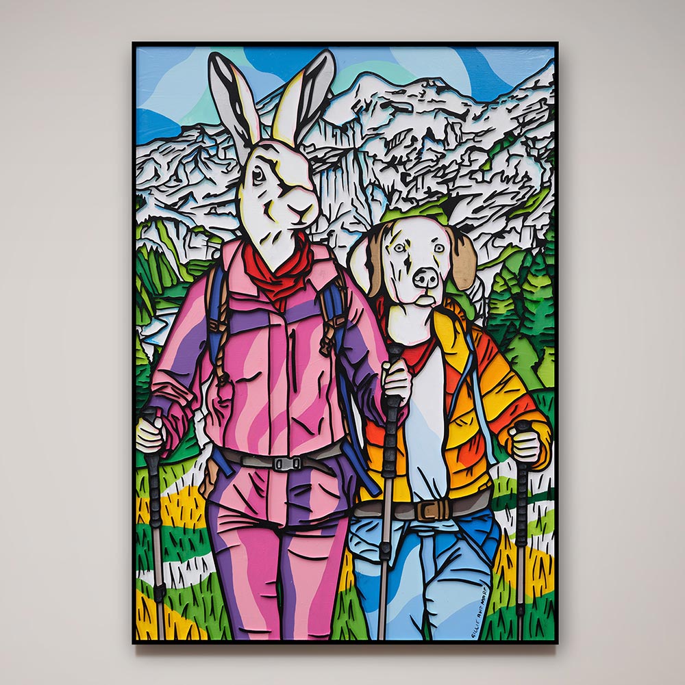 Style Contemporary Figurative Description Rabbitwoman and Dogman loved to explore. They would head out on the most exotic and intrepid adventures, to the furthest corners of the earth. They would climb mountains, tunnel in caves, and canoe down deep ravines. While they were seeing new places they were actually discovering something far more important. The secrets of life. Today the mountains were calling ... Artwork Features The iconic style of Gillie and Marc’s Thick Texture Paintings provide the tangible dimensions of a sculpture with the convenient spatial simplicity of a painting. Multiple layers of impasto are mixed with the paint. With each piece, Gillie and Marc are sharing a part of their unique experience through choppy brushstrokes and captivating visuals that create a harmonious image that is more than just a painting.