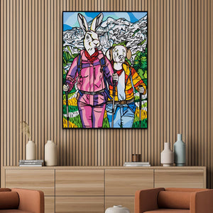 Description "The Mountain Lovers" captures Rabbitwoman and Dogman skiing together in a vivid, surreal landscape that celebrates companionship and adventure. Set against a striking backdrop of bright colors like orange, blue, and yellow, the artwork blends human and animal features, emphasizing the unity and harmony found in shared experiences. The expressive colors and energetic style symbolize both the warmth of connection and the thrill of the mountains, making the piece both playful and intense. Through a pop-art style, "The Mountain Lovers" invites viewers to see the beauty of diversity and the joy of exploring the world together.