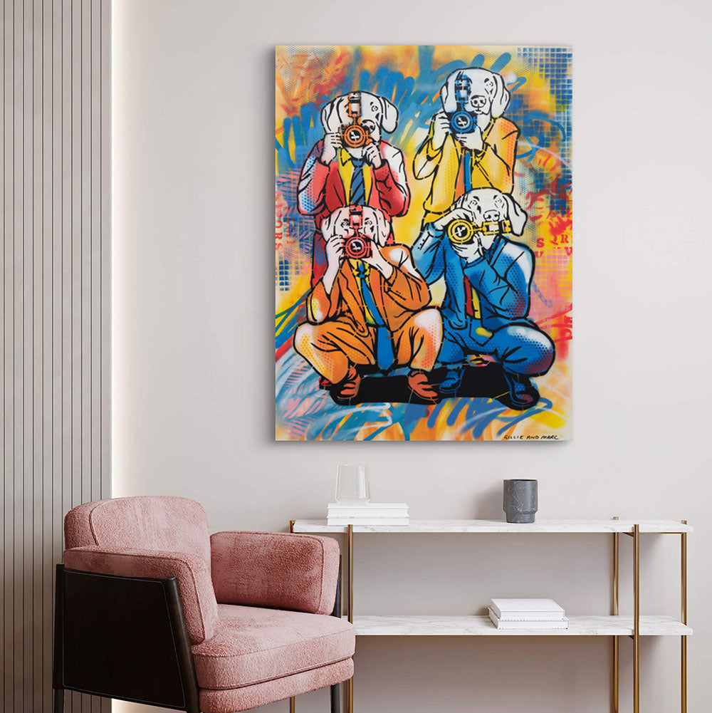 Description In The Pap Pack Is Legendary, four Dogmen dressed in bold suits capture the world through their lenses, transforming the act of observation into an explosion of colour and personality. With their cameras raised and expressions focused, this playful work shines a light on the culture of celebrity, curiosity, and storytelling. Gillie and Marc use their signature pop-art flair to celebrate those who document the world—and remind us that what we choose to focus on can shape what we see.
