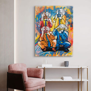 Description The Pap Dogs Are Here is a playful yet thought-provoking piece that turns the camera back on those who are always behind the lens. Featuring a group of Dogmen dressed in vibrant suits, each holding a camera, the artwork humorously critiques the omnipresence of paparazzi culture while celebrating the art of photography. With its pop-art-inspired bold colors and dynamic composition, this piece captures the energy of media frenzy and the ever-watchful eye of society.