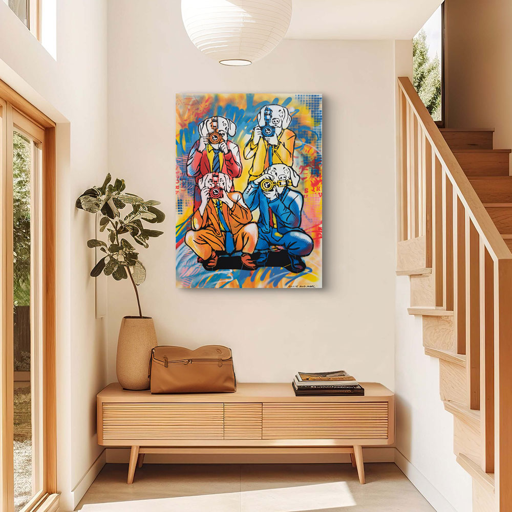 Description "The Pap Dogs Have Arrived" offers a playful yet thought-provoking take on fame, media, and curiosity. Featuring Dogman in bold, vibrant colors with cameras in hand, this piece humorously reflects the paparazzi culture that dominates modern society. The graffiti-inspired textures and dynamic use of color highlight the energy and chaos associated with the pursuit of capturing a moment. This artwork is a vibrant commentary on the intersection of celebrity and privacy, skillfully rendered with Gillie and Marc's signature whimsical style.