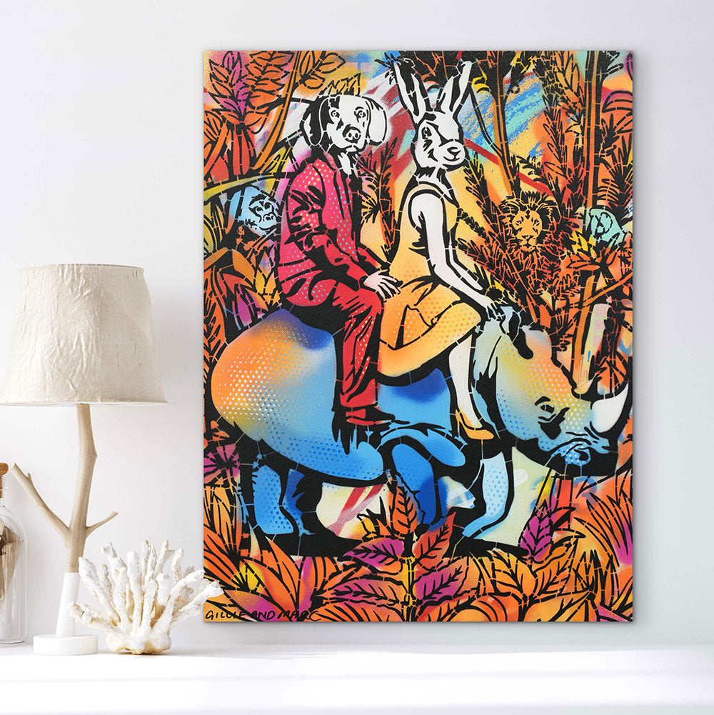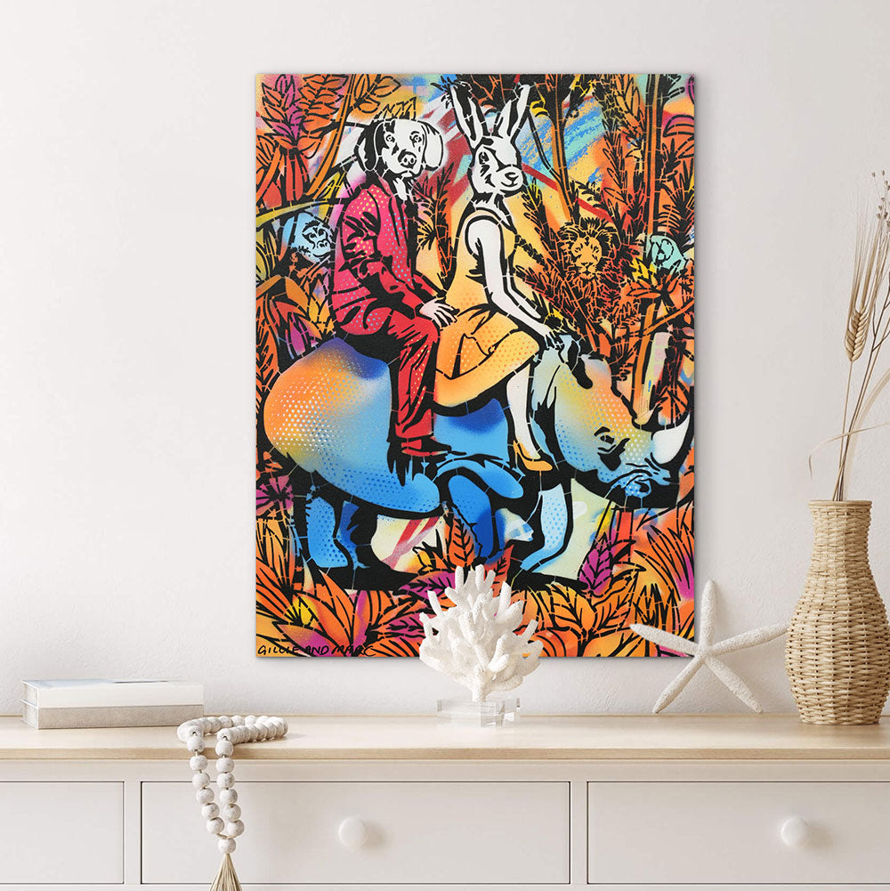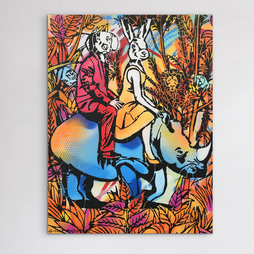 Description The Sound of Us sweeps rabbitwoman and dogman into a wild, dreamlike jungle, riding peacefully atop a gentle rhino as vibrant foliage glows around them. Hidden faces of the forest—lions, monkeys, and other watchful spirits—emerge from the colour, creating a world that feels alive with mystery and harmony. Painted in Gillie and Marc’s electric palette, the work celebrates unity between humans, wildlife, and the natural world. It reminds us that when we listen closely—to nature, to each other, to love—we find a rhythm that carries us forward together.