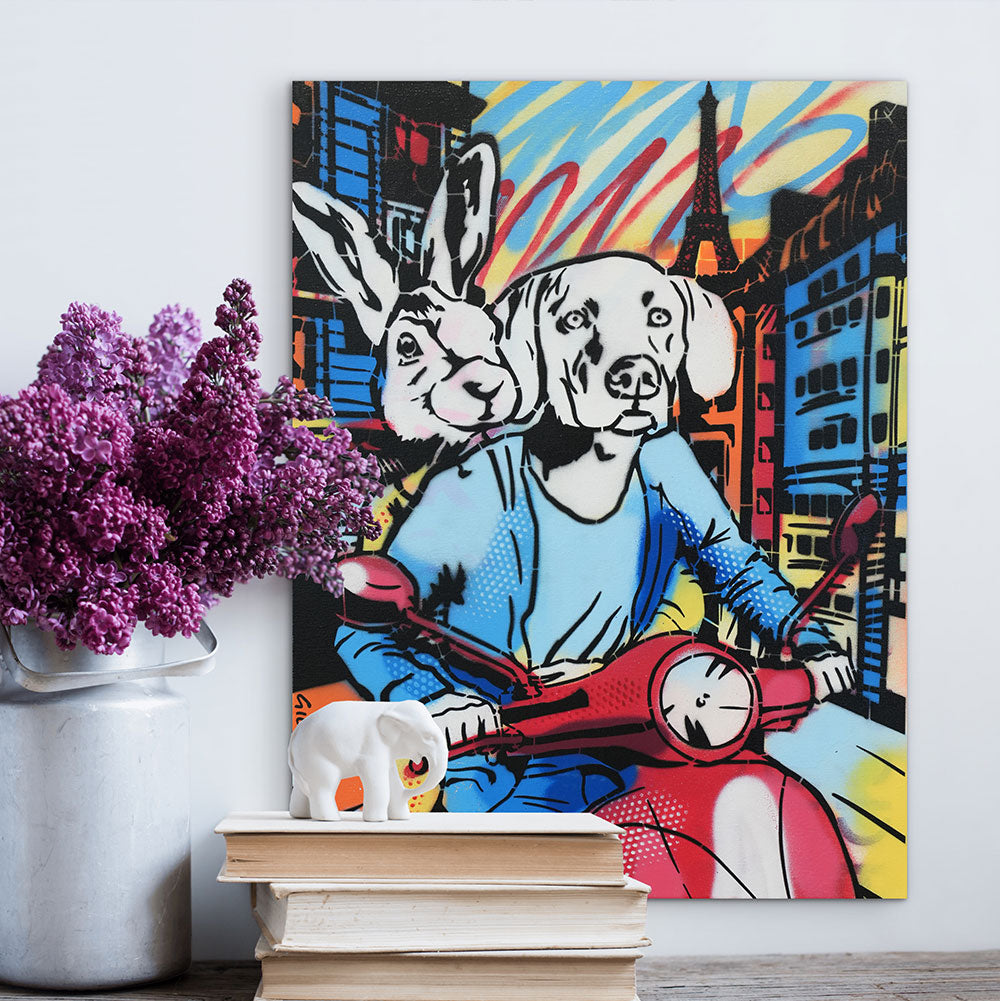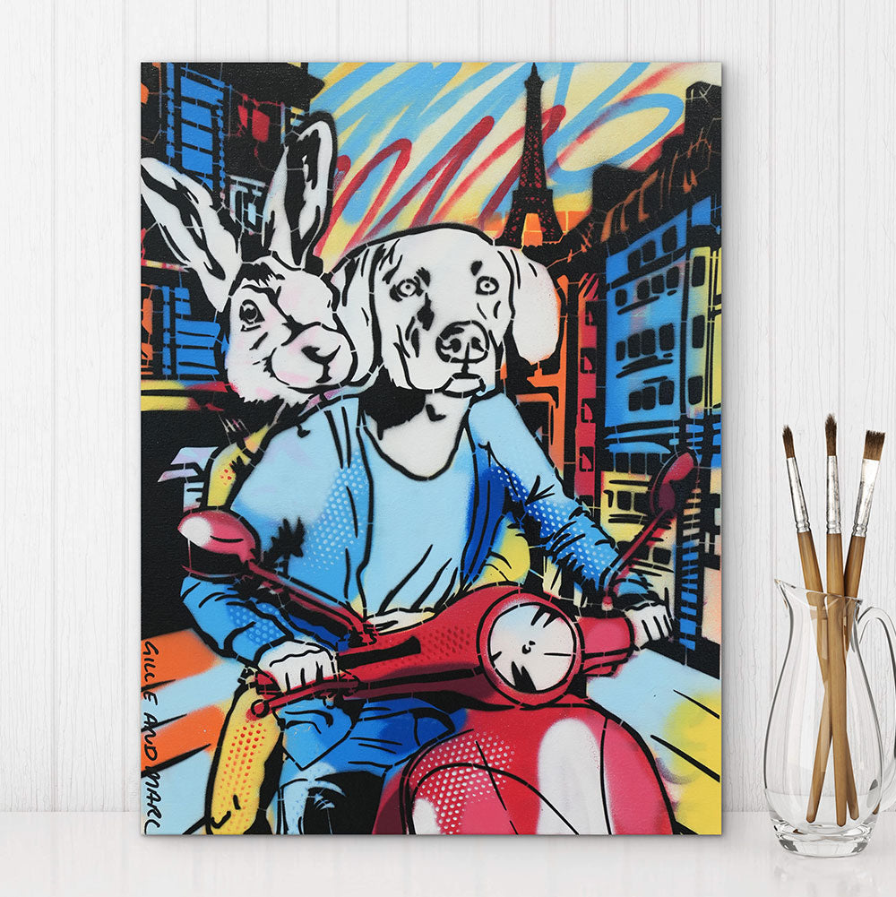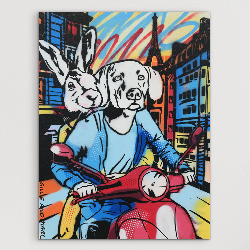 Description Set against the vibrant streets of Paris, with the Eiffel Tower rising in the background, Rabbitwoman and Dogman ride together on their red scooter — united, fearless, and full of life. The bold colours and energetic stencils capture the pulse of the city while highlighting the quiet strength found in their companionship. In The Strength of Two, Gillie and Marc celebrate partnership as a source of courage and joy, reminding us that love becomes its most powerful when two hearts move forward as one.