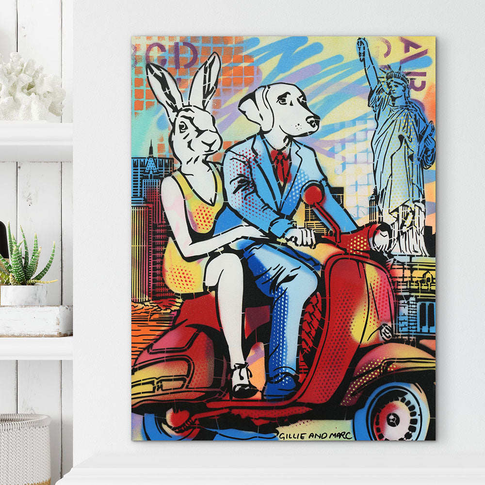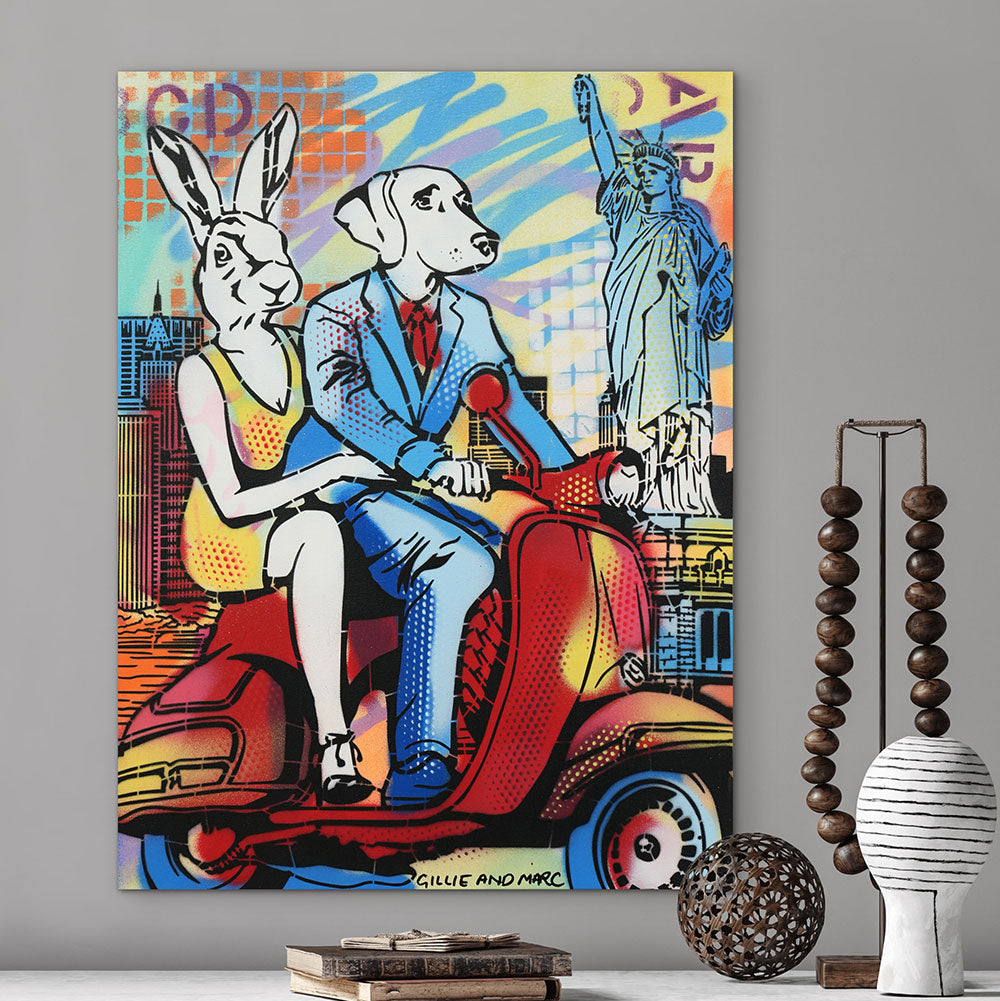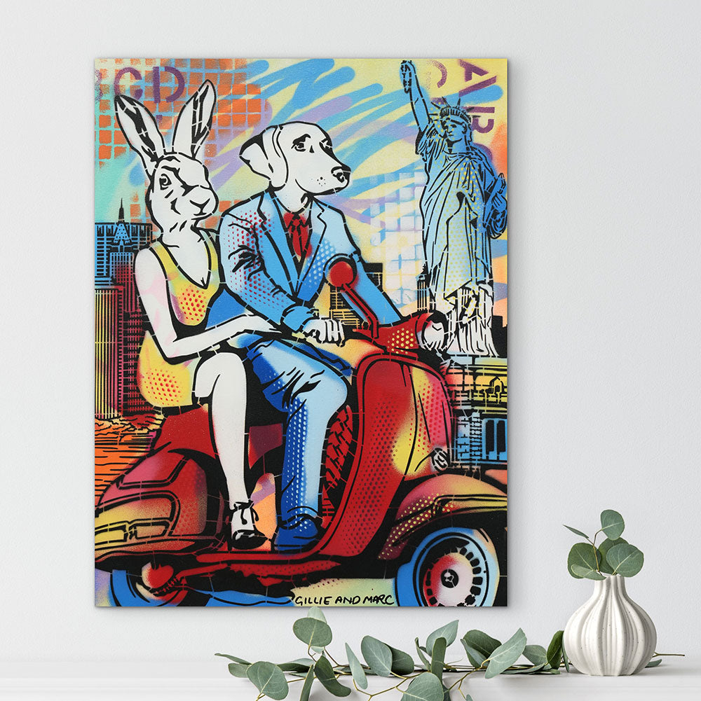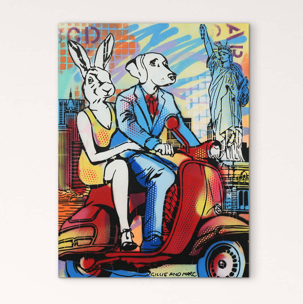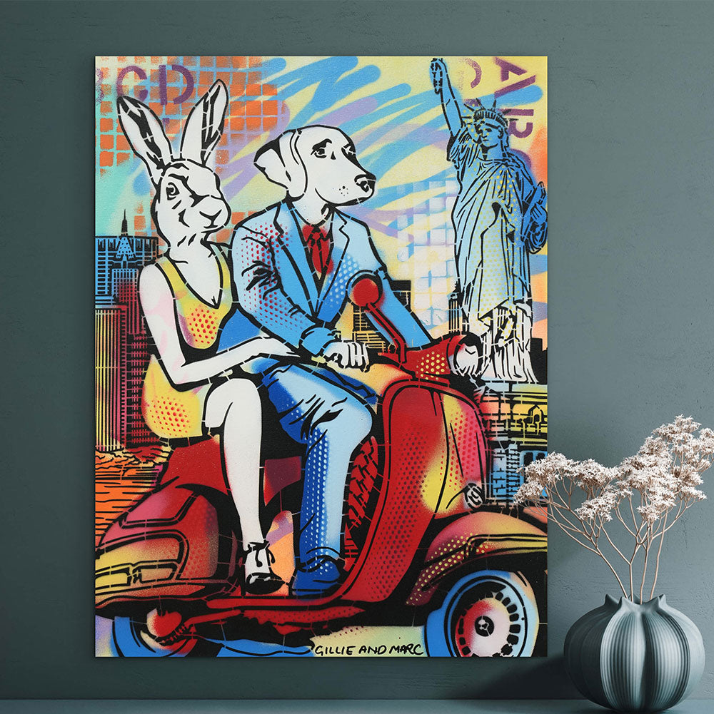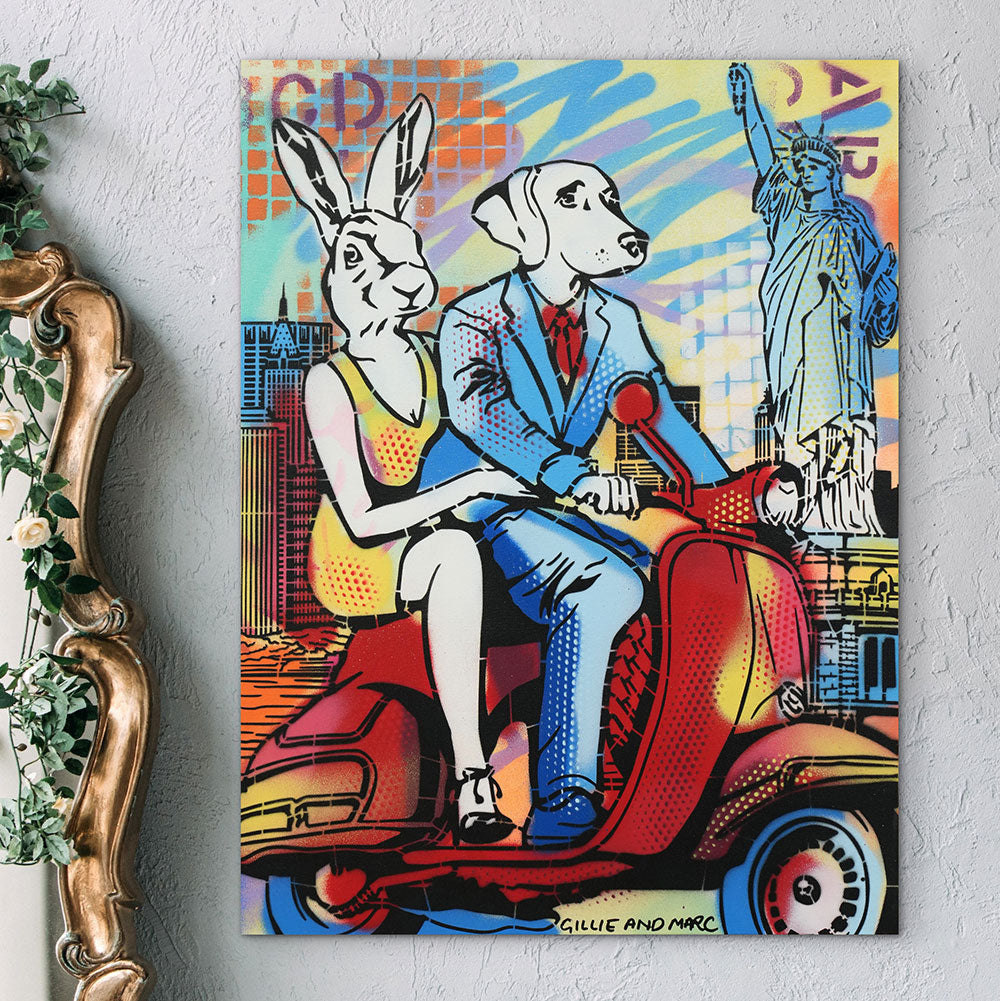 Description This artwork, "The Unforgettable Day" by Gillie and Marc, beautifully captures a moment of connection and adventure. In this piece, Dogman is dressed in a formal blue suit and red tie, while Rabbitwoman embraces him from behind, wearing a bright yellow dress. They're riding a classic red scooter, a recurring symbol in Gillie and Marc’s work, representing freedom, movement, and shared experiences. The background explodes with dynamic graffiti-style patterns, giving the impression of energy, excitement, and spontaneity. The title, "The Unforgettable Day," suggests a special journey, one that will be cherished forever—perhaps a romantic escape, an adventure, or a defining moment in their lives. This piece is a perfect blend of pop art, street art, and storytelling, celebrating love, companionship, and the thrill of the open road.