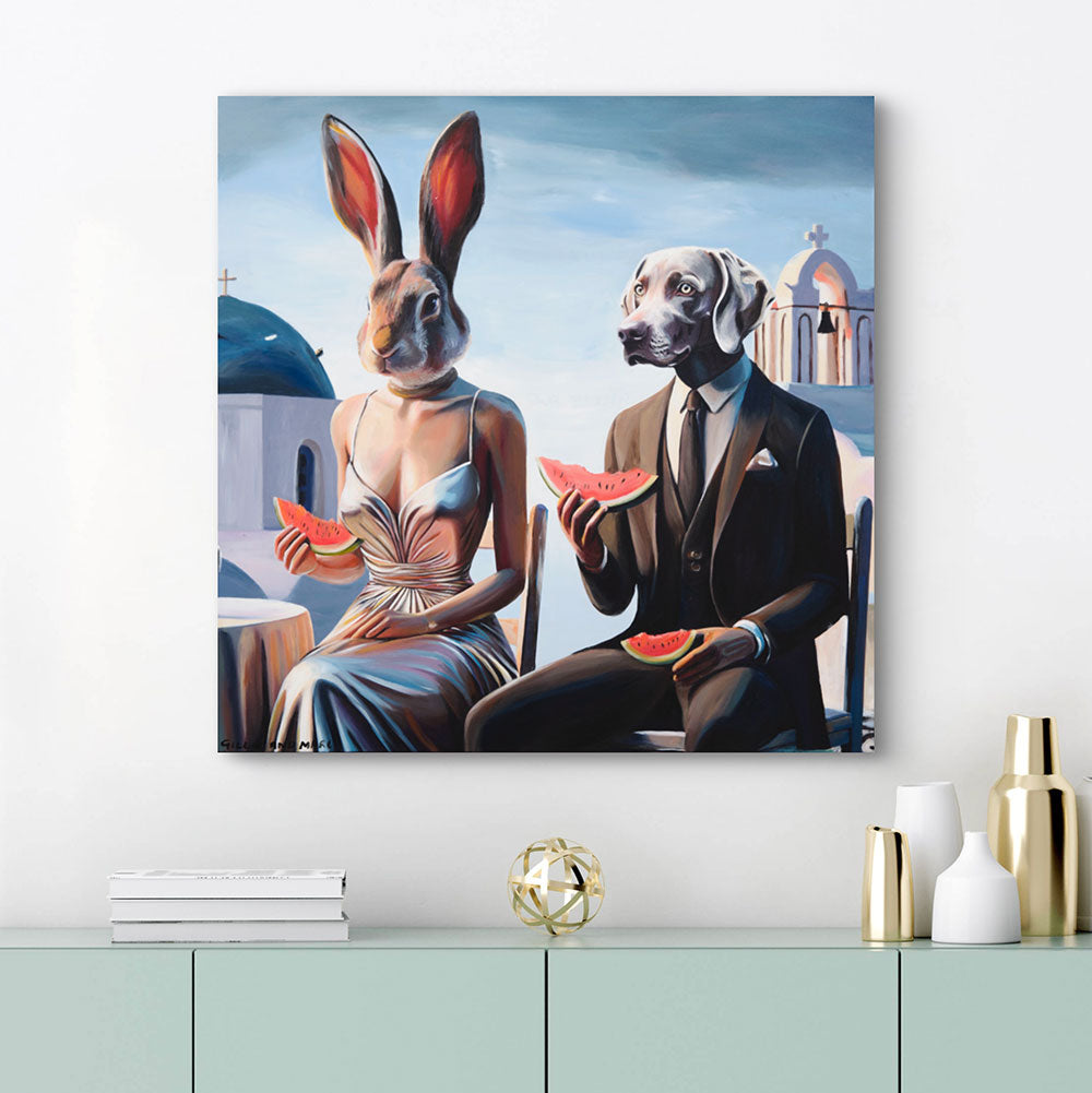 Style Contemporary Figurative, Romanticism Description Bondi is a special part of the world. The sea air and the warm breeze makes this a slice of paradise that Rabbitwoman and Dogman felt so lucky to call home. It was so much fun to be able to quickly nip down for a quick swim in the salty water and then cross the road to look into the local market. They were as happy as could be.