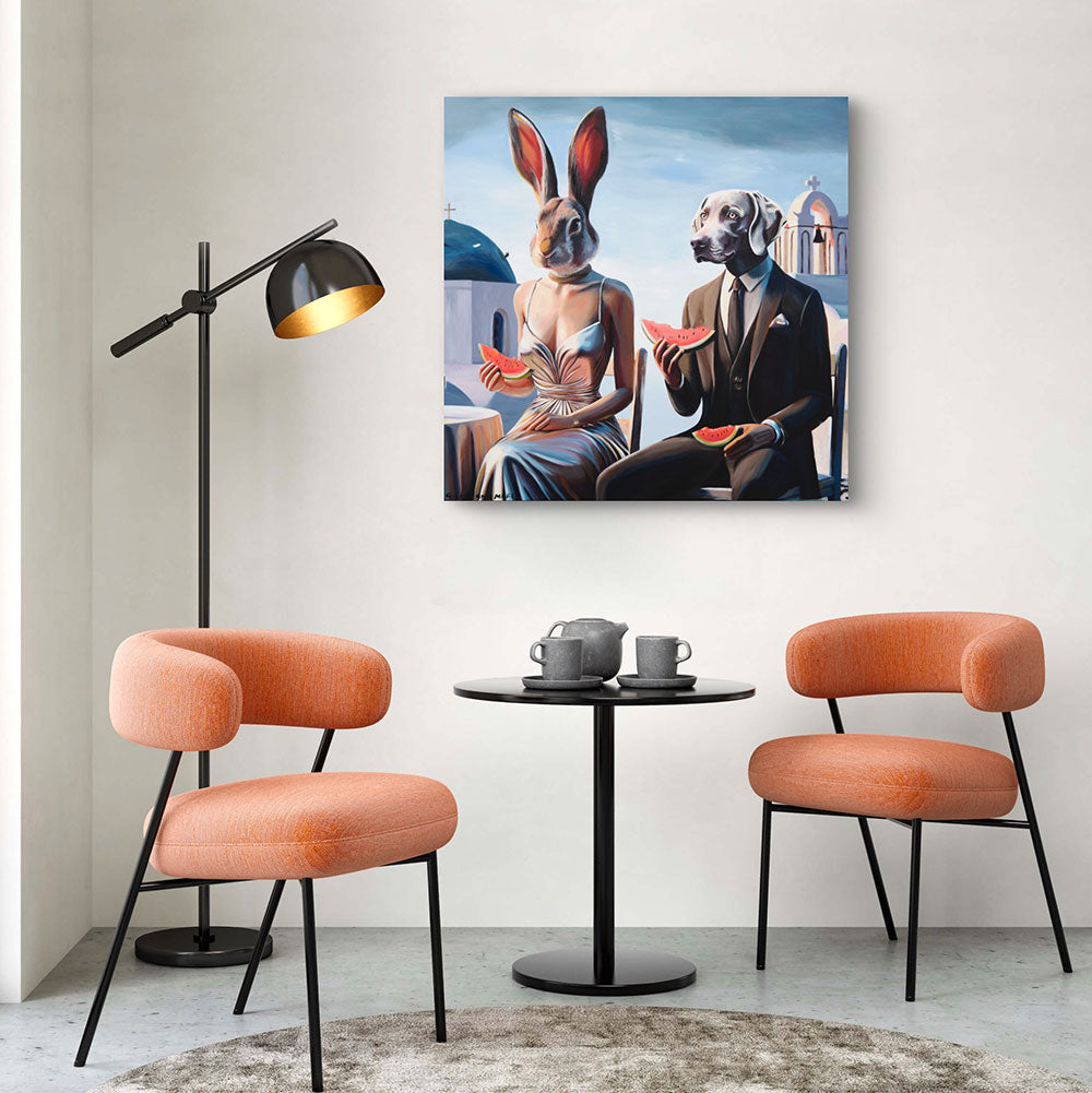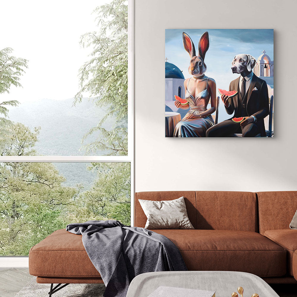 Description Pasta is delicious. You know this, your mum knows this, and especially, Rabbitwoman and Dogman know this. Every chance they get, the duo will chow down on a plate of delicious pasta wherever they are. Linguine by the Eiffel Tower, penne by Big Ben, ravioli next to the Acropolis, it doesn’t matter. If it’s on offer, they’ll take it with a smile and be the happiest in town.With the layers of the paint, Rabbitwoman and Dogman seem to pop out of the canvas and into your room, making you a part of their adventure. With the vibrant colours and exciting scene, this painting will bring a story to your home and a sense of life and vitality.