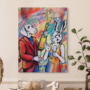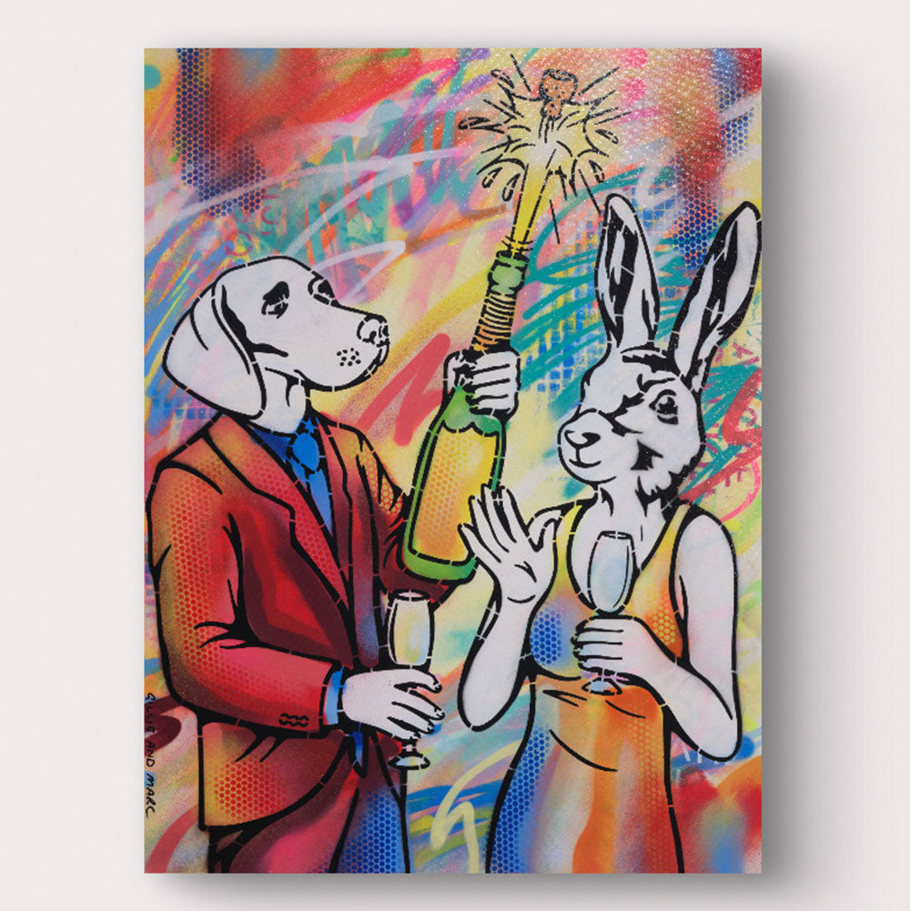 Description In this lively and celebratory piece, a well-dressed dogman and a chic rabbitwoman raise their glasses, as champagne erupts from the bottle in a burst of sparkling energy. The playful interaction between the two characters, combined with their fashionable attire, creates a joyful and sophisticated atmosphere. The vibrant graffiti-style background, filled with neon hues of pink, yellow, and blue, enhances the festive mood, making the moment feel electric. This piece captures the essence of celebration, fun, and style, blending humor with pop art aesthetics to create a visually dynamic and engaging scene.