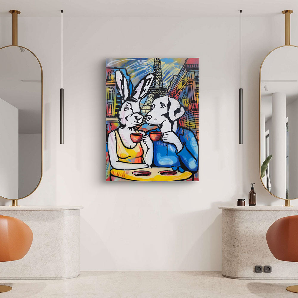 Description In They Fell in Love in Paris, Rabbitwoman and Dogman are seen sharing a quiet moment over coffee, set against the iconic Eiffel Tower and vibrant Parisian architecture. The scene captures the essence of romance in the City of Love, with bold colors and expressive lines that highlight both the intensity and tenderness of their connection. The bright palette and urban pop-art style blend seamlessly with the nostalgic charm of Paris, embodying the joy of finding love in an enchanting city. Through the lens of fantasy, this artwork celebrates love that transcends boundaries and embraces diversity in a truly magical setting.