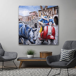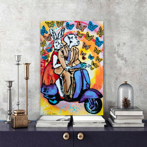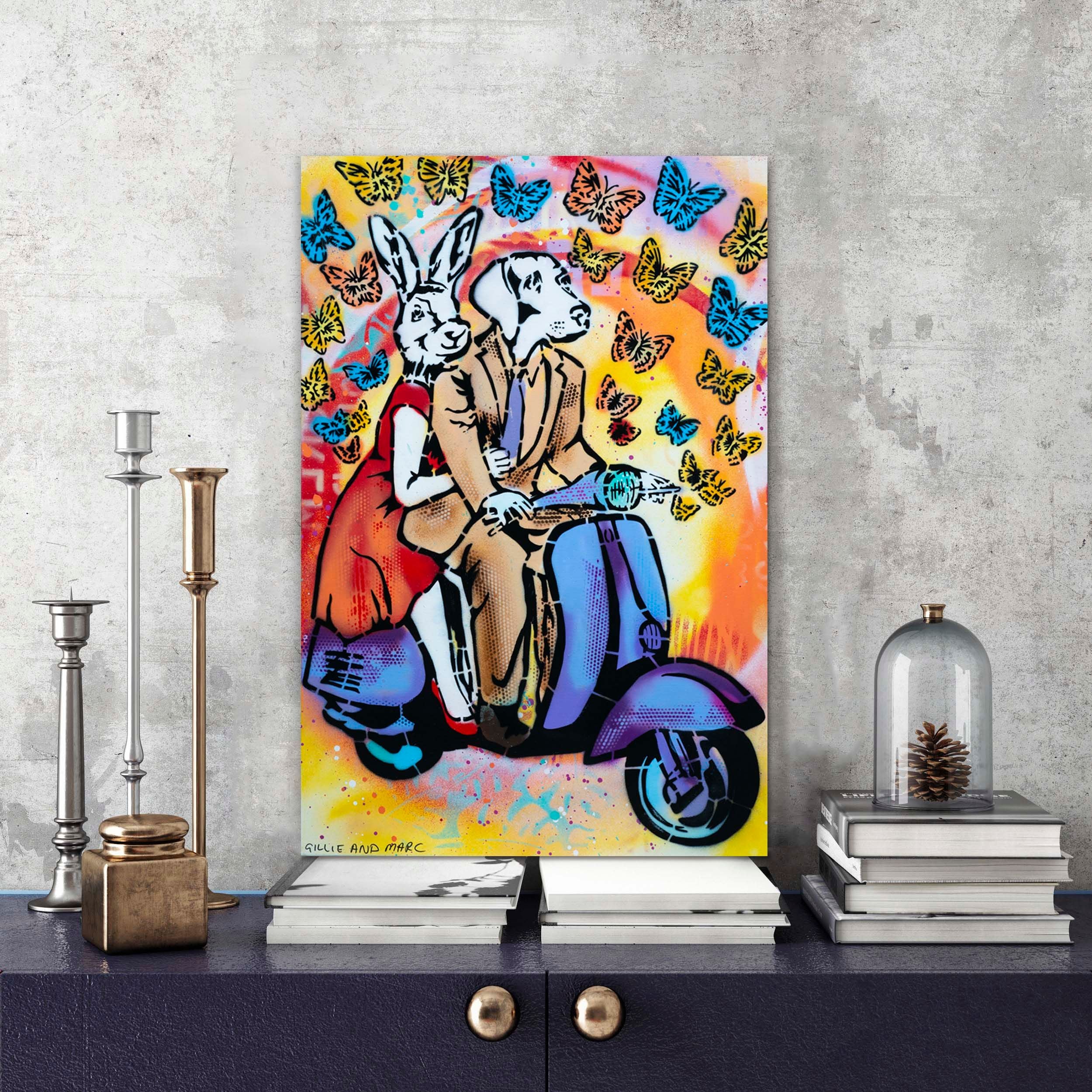 Style Contemporary Realism Description If it were up to Dogman and Rabbitwoman, they would spend the rest of their lives embracing one another on a vespa while going off on new, exciting adventures. They loved being together and were always a team. Artwork Features The iconic style of Gillie and Marc’s Thick Texture Paintings provide the tangible dimensions of a sculpture with the convenient spatial simplicity of a painting. Multiple layers of impasto are mixed with the paint. With each piece, Gillie and Marc are sharing a part of their unique experience through choppy brushstrokes and captivating visuals that create a harmonious image that is more than just a painting.