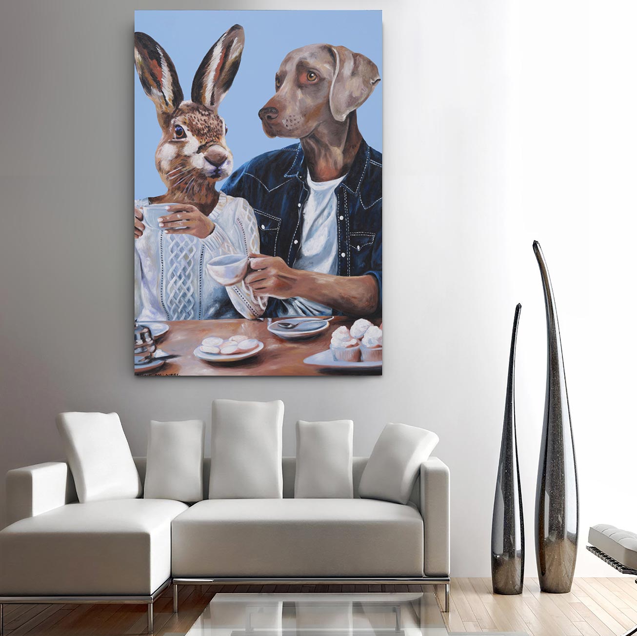 Style Contemporary Figurative, Romanticism Description Rabbitwoman and Dogman love cooking a meal together. They find it so romantic, sauteeing, dicing, and stirring, all with a glass of delicious wine handy. Every night together was a special meal and they loved sharing these intimate domestic moments. It’s what makes being a couple so special.