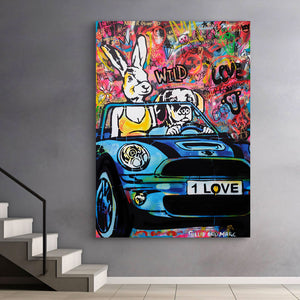 Description The painting titled "They Were Ready and Able" depicts a whimsical scene where Dogman and Rabbitwoman joyfully ride in their beloved Mini. The bright and vibrant pop colors used in the artwork create a visually captivating composition, while the abstract background adds an element of intrigue. The abstract background symbolizes the boundless possibilities and adventures that await Dogman and Rabbitwoman on their journey. It represents the freedom, spontaneity, and excitement of embracing life's experiences with enthusiasm and readiness. The painting encourages viewers to embrace their own sense of adventure and seize opportunities with a fearless and optimistic spirit.