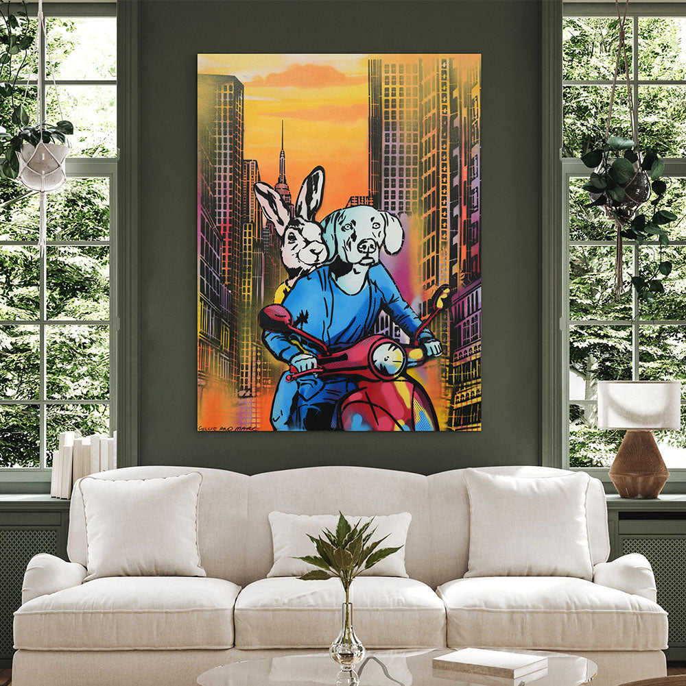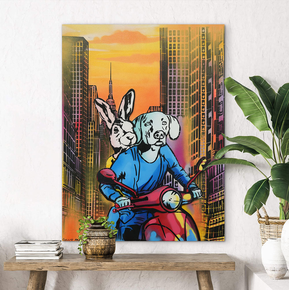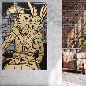 Style Contemporary Pop Art, Romanticism, Adventure Description Whatever Dogman and Rabbitwoman do, they are always in love. They wake up, they drink coffee, they work, they eat - always so in love. But, their most favourite way to be in love was to hold on to each other tight, jump on their vespa and go for the ride of their life.