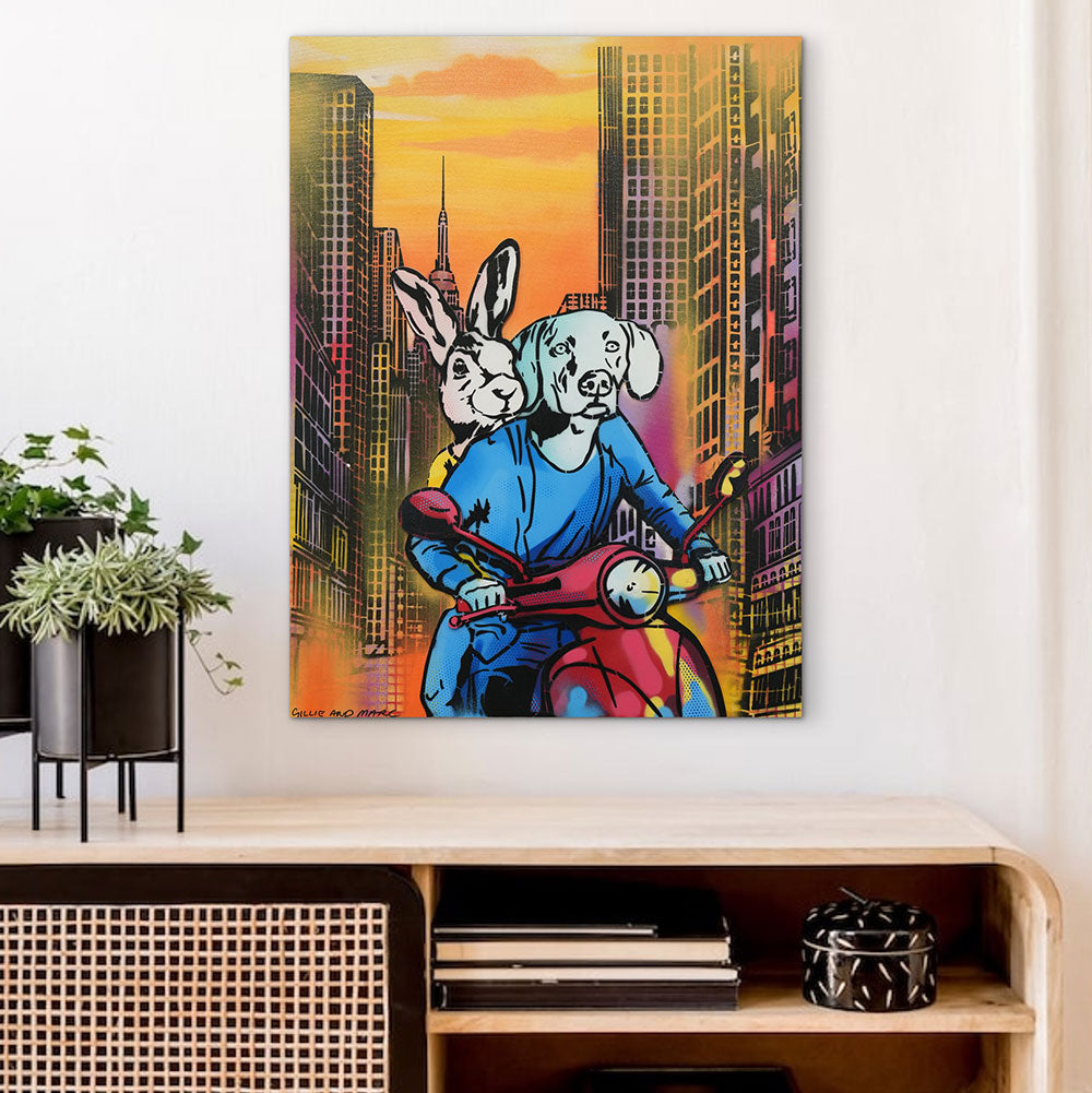 Style Contemporary Figurative Description This original painting depicts Rabbitwoman and Dogman, riding together in their Vespa sidecar. Behind them lies a vibrant, colourful backdrop, symbolizing the joy and freedom of life's adventures. Rabbitwoman is driving and Dogman is ready for the ride, expressing the importance of companionship and support on the journey. The title, "They were go go go," captures the energy and optimism of the scene. Artwork Features The iconic style of Gillie and Marc’s Thick Texture Paintings provide the tangible dimensions of a sculpture with the convenient spatial simplicity of a painting. Multiple layers of impasto are mixed with the paint. With each piece, Gillie and Marc are sharing a part of their unique experience through choppy brushstrokes and captivating visuals that create a harmonious image that is more than just a painting.