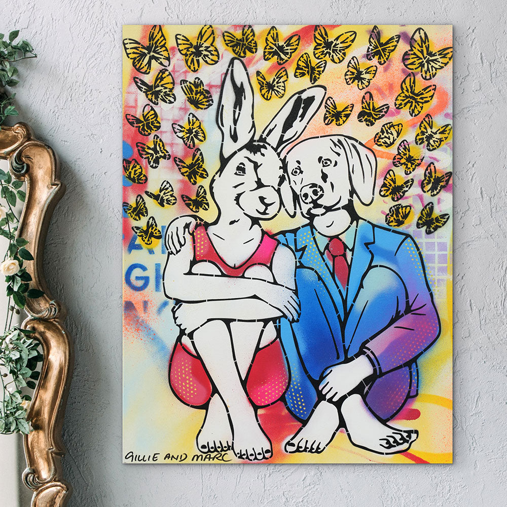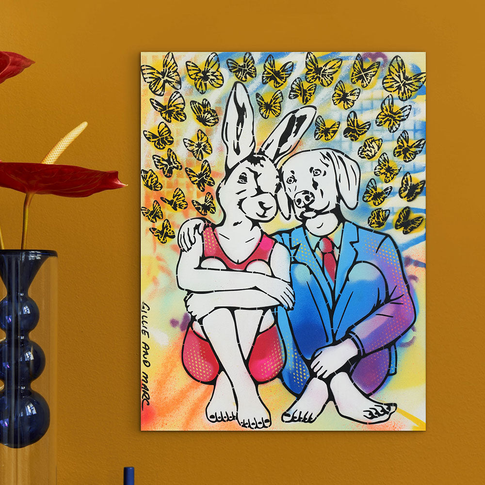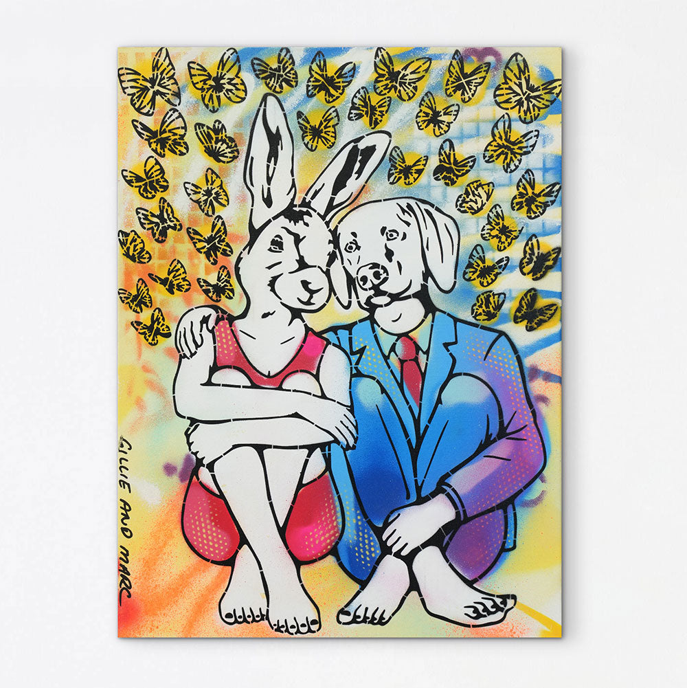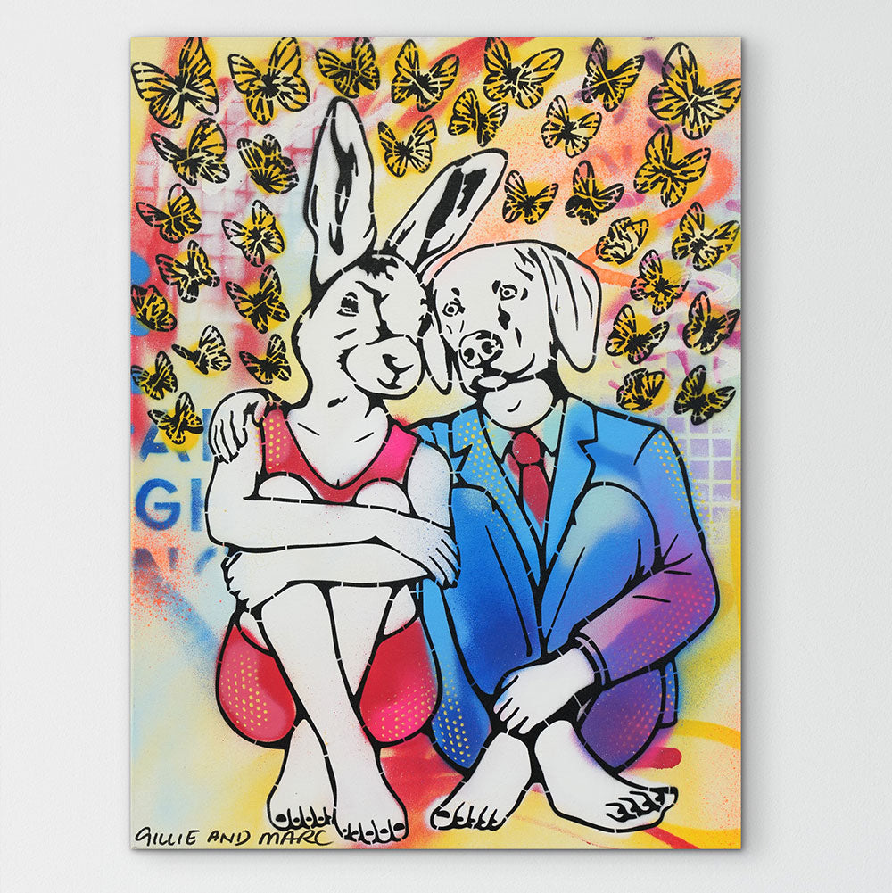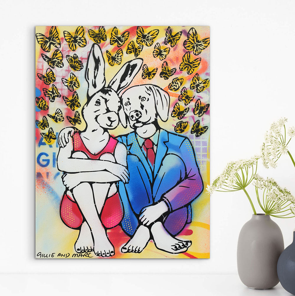 Artwork Features The purest example of the artist’s freehand work, Gillie and Marc’s ‘Contemporary Line & Stencil Paintings’ are a stunning series that pairs unashamedly bold colors with deep black line work to form intimate moments featuring their signature alter egos, endangered wildlife and more. The carefully selected vivid colors and unmistakable imagery means no two pieces are alike and can have multiple meanings the more they are viewed. Gillie and Marc paint each unique canvas side-by-side ensuring love is engrained in every brushstroke of each one-of-a-kind work of art. Recently inspired by the pop style of Andy Warhol and the iconic stencils of street artists Banksy and Mr. Brainwash, Gillie and Marc expanded their collection with the edgy addition of using spray paint stencils on their canvases. The stark contrast of bright colors beneath a dark stencil breathes life into this limited series, embodying Gillie and Marc’s philosophy of the importance of accessible art by playfully bringing the street to the canvas.
