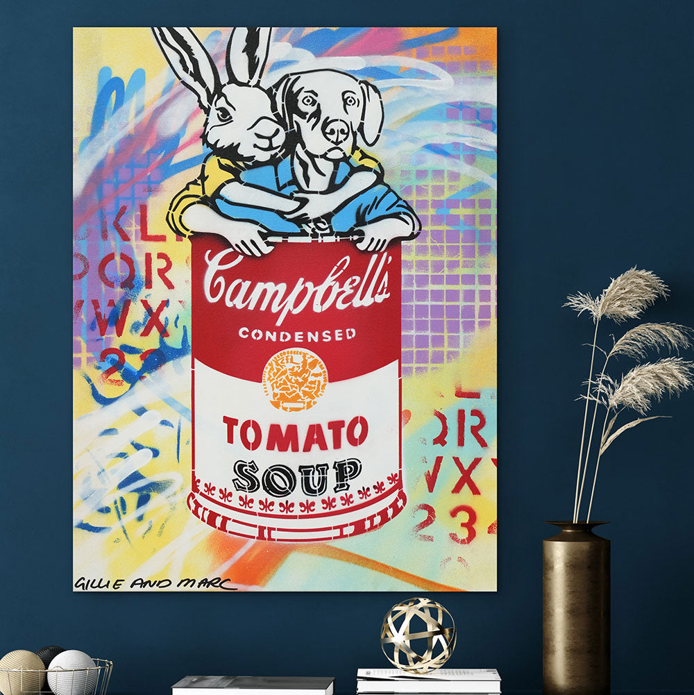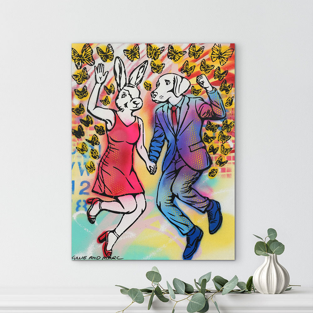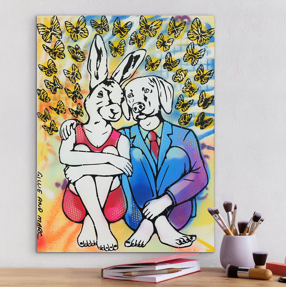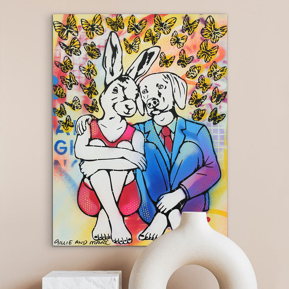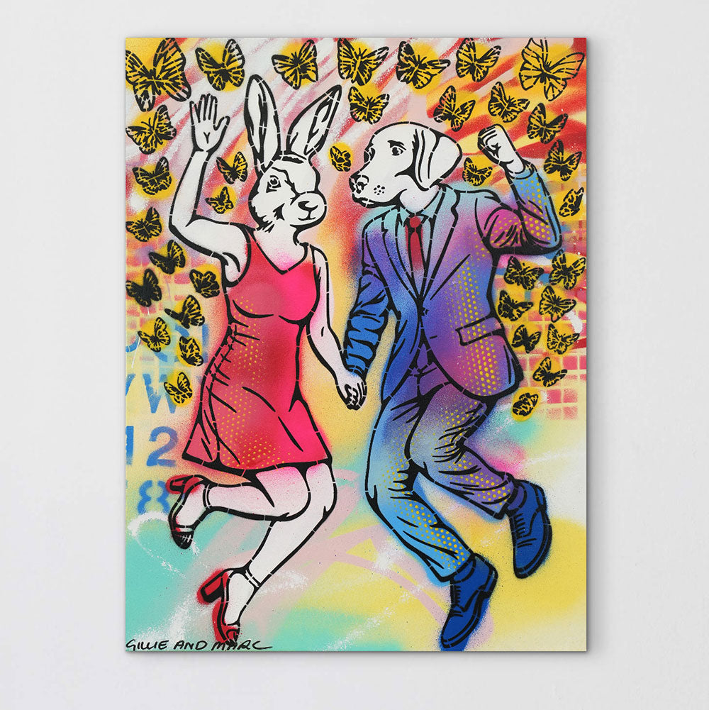 Artwork Features The purest example of the artist’s freehand work, Gillie and Marc’s ‘Contemporary Line & Stencil Paintings’ are a stunning series that pairs unashamedly bold colors with deep black line work to form intimate moments featuring their signature alter egos, endangered wildlife and more. The carefully selected vivid colors and unmistakable imagery means no two pieces are alike and can have multiple meanings the more they are viewed. Gillie and Marc paint each unique canvas side-by-side ensuring love is engrained in every brushstroke of each one-of-a-kind work of art. Recently inspired by the pop style of Andy Warhol and the iconic stencils of street artists Banksy and Mr. Brainwash, Gillie and Marc expanded their collection with the edgy addition of using spray paint stencils on their canvases. The stark contrast of bright colors beneath a dark stencil breathes life into this limited series, embodying Gillie and Marc’s philosophy of the importance of accessible art by playfully bringing the street to the canvas.