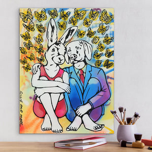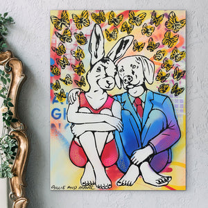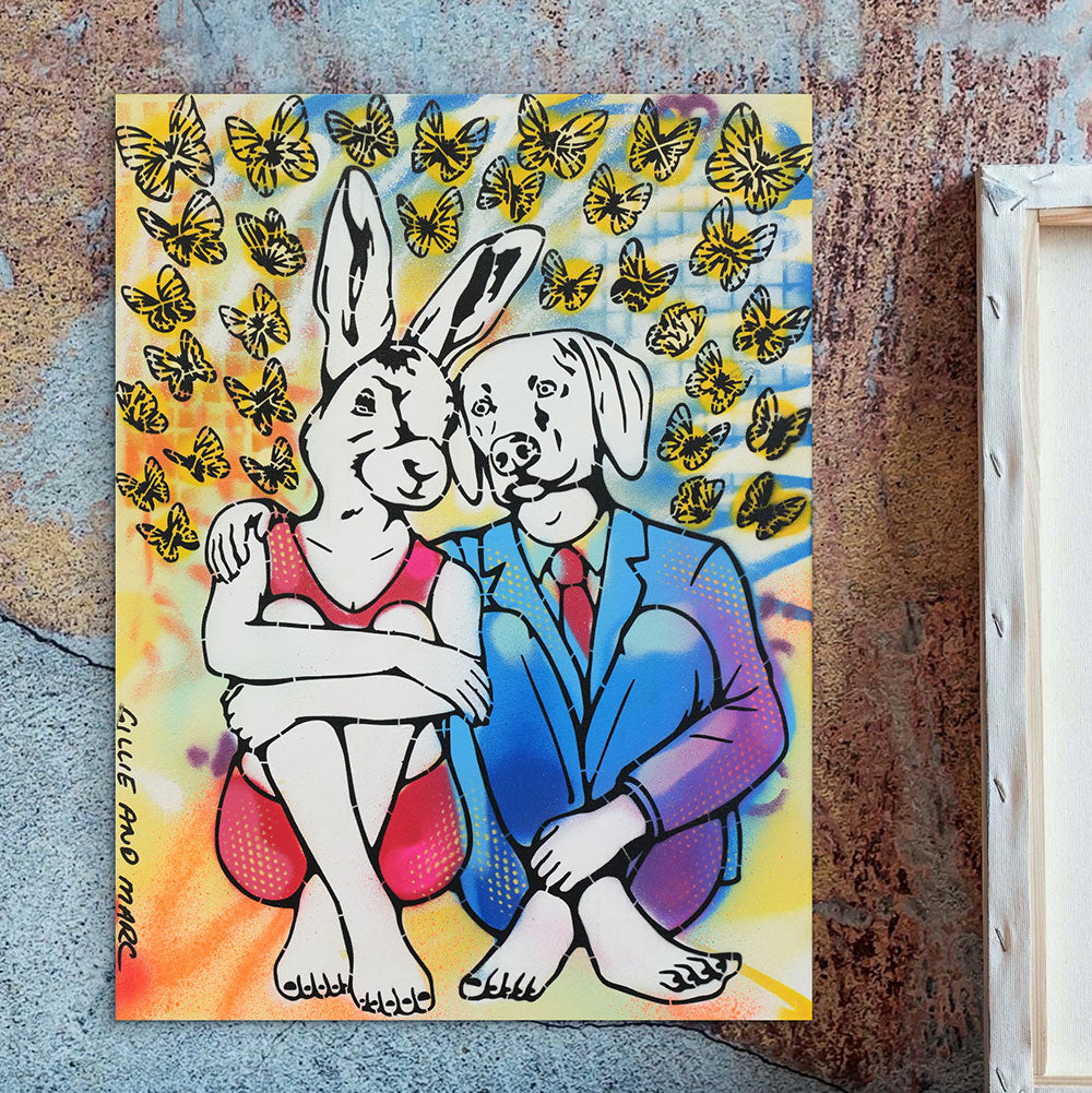 Description This captivating piece combines impasto and enamel on canvas to create a rich, textured experience. The artwork features Rabbitwoman, dressed in a striking red gown, holding a vibrant red balloon, and Dogman, donning a sharp blue suit, with his arms confidently crossed. Together, they stand as the central figures in this dynamic composition. The contrast between the bold colors and the layered textures invites viewers to explore the energy and depth of the piece, evoking a sense of movement and stillness, all at once.