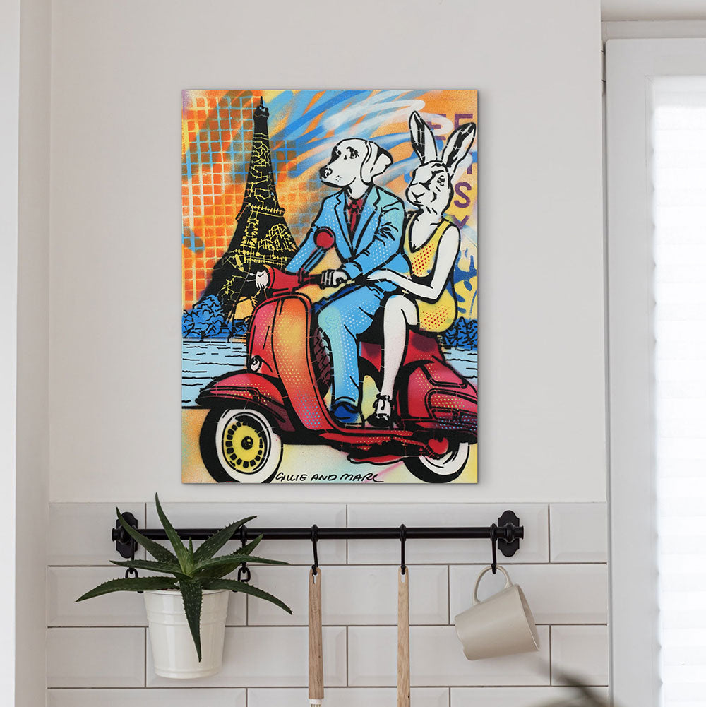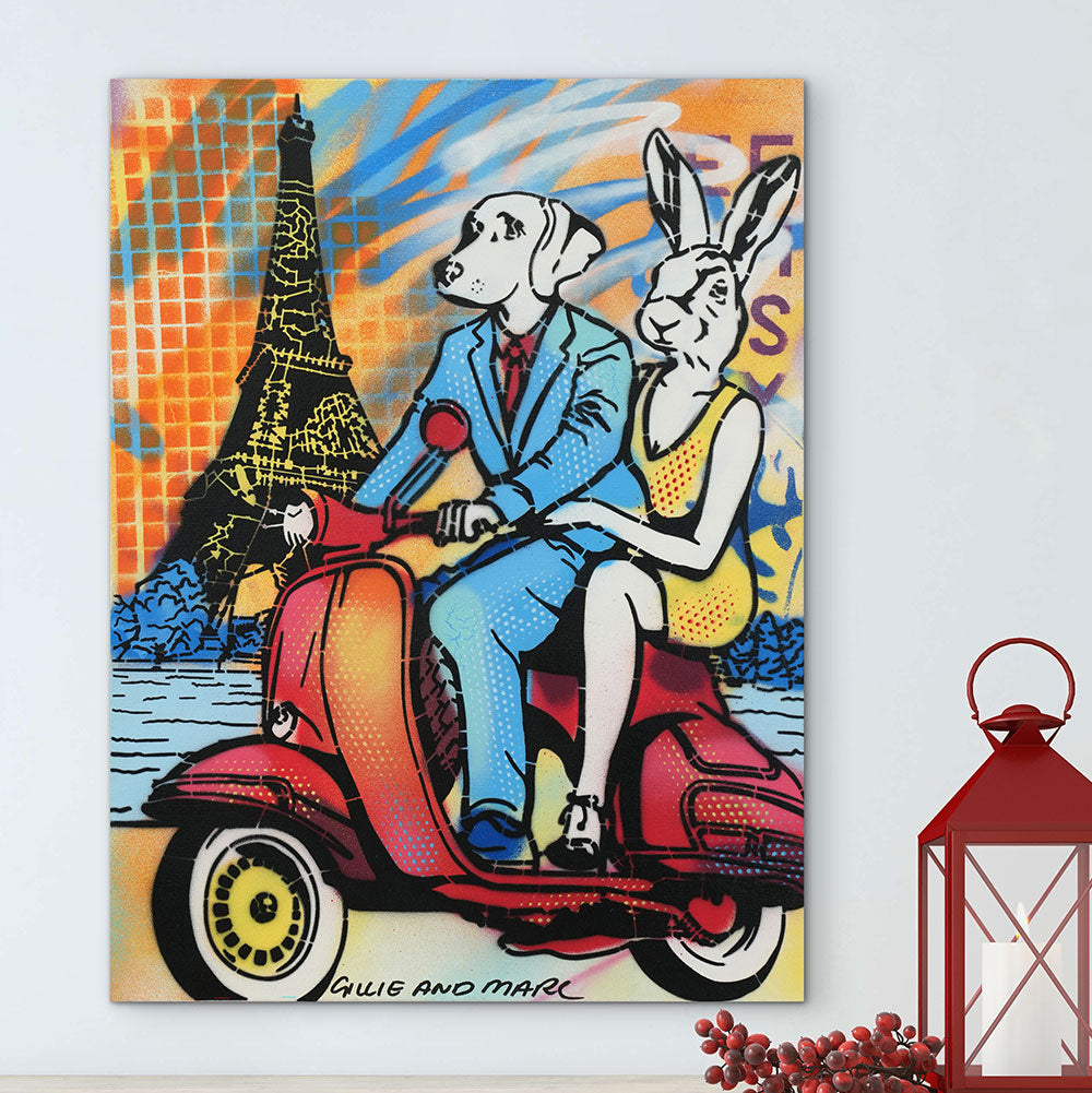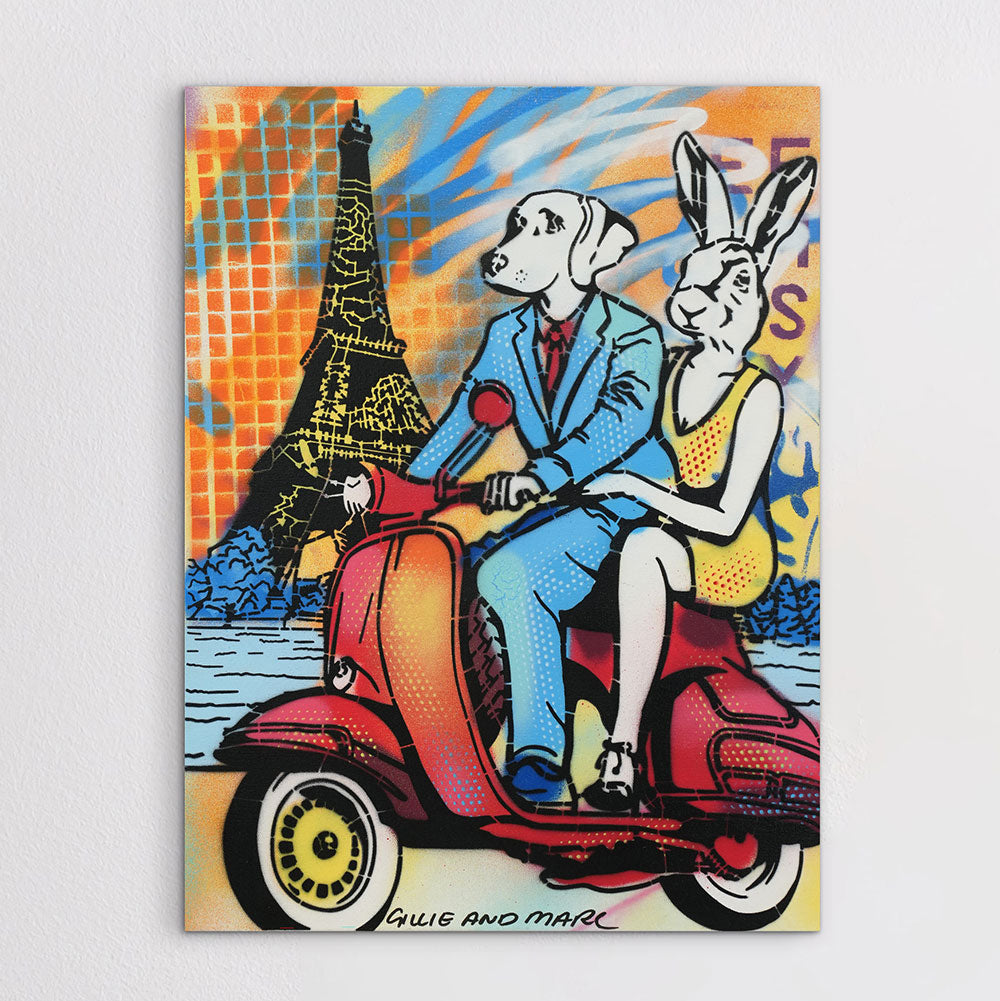 Description Two Souls follows rabbitwoman and dogman as they weave through the glowing streets of Paris on a bright red scooter, the Eiffel Tower rising behind them like a promise of adventure. Painted with Gillie and Marc’s signature burst of colour and urban energy, the work celebrates partnership, spontaneity, and the joy of discovering the world together. With wind, movement, and love all captured in a single frame, the artwork reminds us that every journey becomes extraordinary when shared with your soulmate.