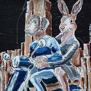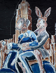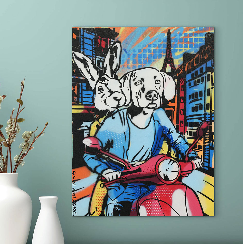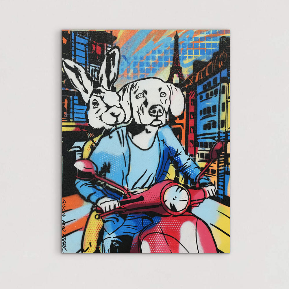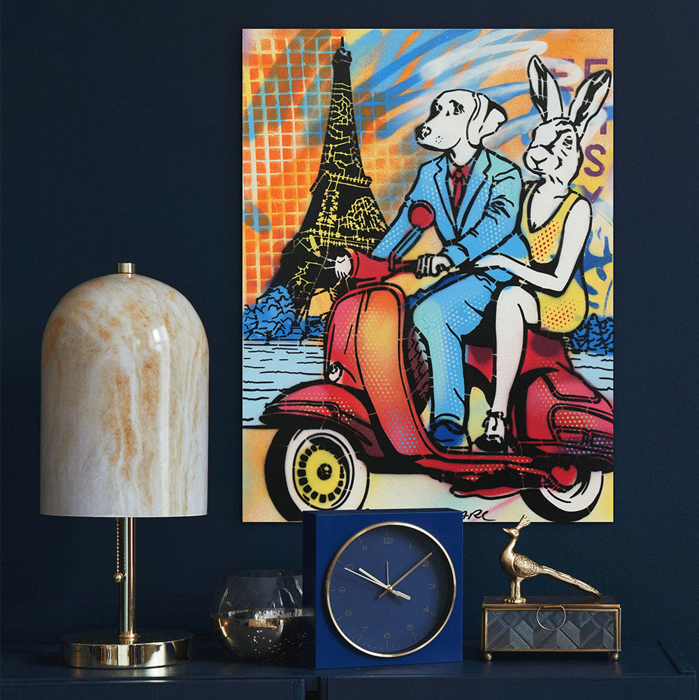 Description A burst of colour and movement, this artwork shows Rabbitwoman and Dogman riding through the heart of Paris on a bright red scooter. The bold, pop-art palette captures the excitement of a city alive with light and romance. Spray-paint textures and graphic lines give a sense of speed and adventure as they glide past the glowing skyline. Hints of the Eiffel Tower anchor the scene, celebrating love and freedom in the City of Lights. A joyful tribute to connection, travel, and the thrill of sharing the ride together.