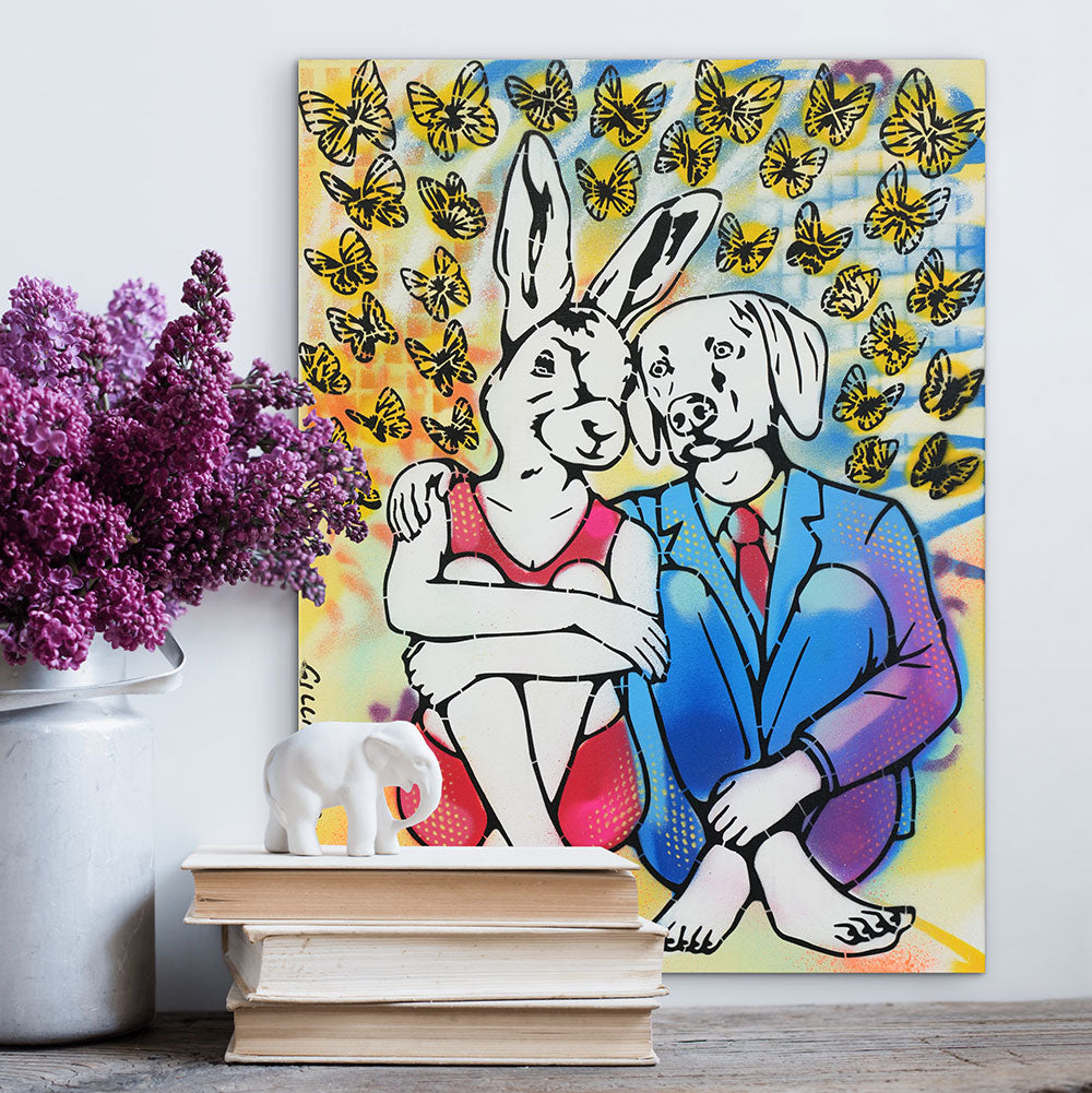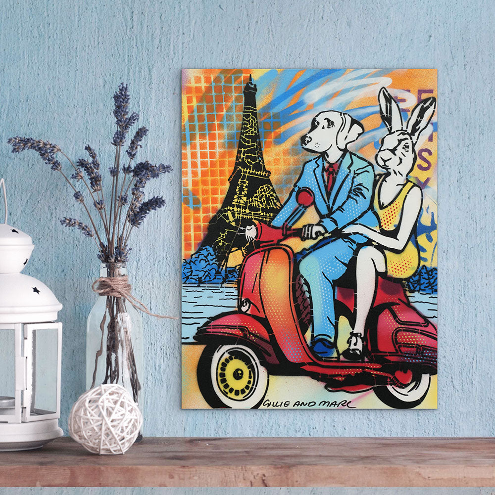 Description In True Love in Paris, Rabbitwoman and Dogman take to the streets of the French capital on their red scooter, symbolizing the freedom and excitement of love. With the Eiffel Tower standing tall in the background, the artwork captures a moment of adventure and romance in a city known for both. The bold color palette and pop-art stencil technique bring an urban vibrancy to the scene, highlighting the playful yet deeply meaningful connection between the two characters. This piece is a celebration of love, travel, and the joy of shared journeys.