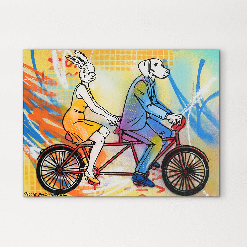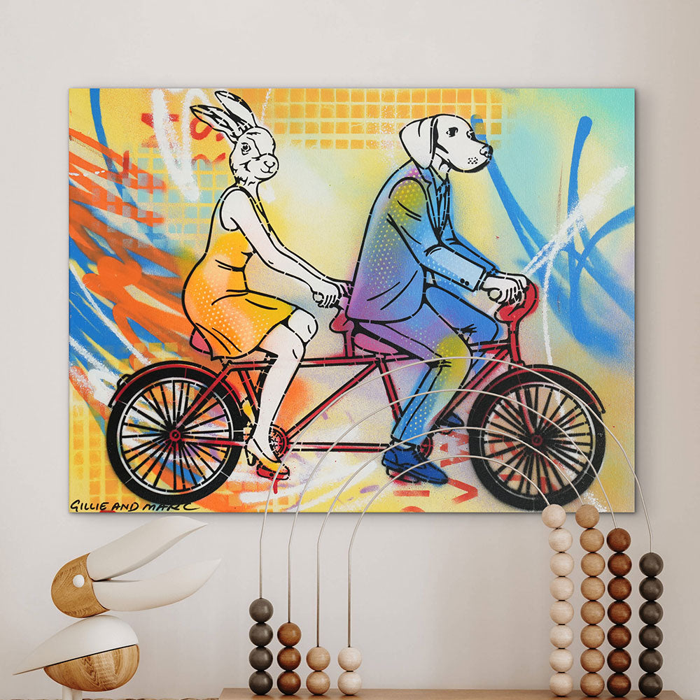 Description Rabbitwoman and Dogman share a tandem bicycle ride, their vibrant attire radiating joy and connection. Dogman wears a teal suit with a yellow tie, while Rabbitwoman glows in a striking pink dress, both rendered with bold, expressive brushstrokes. The bright red frame of the bicycle pops against the soft beige background, drawing the eye to their synchronized movement. This piece celebrates companionship, trust, and the simple pleasures of journeying together—two hearts perfectly in tune, moving forward as one.
