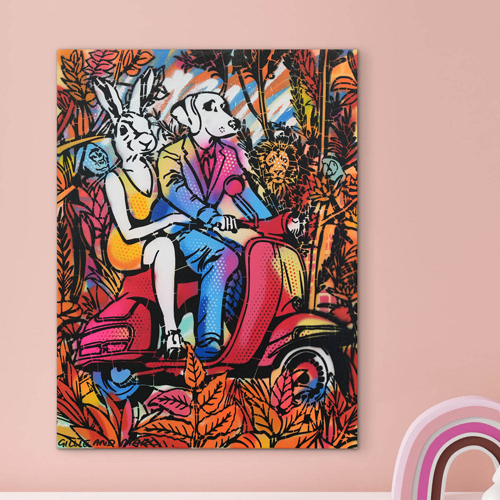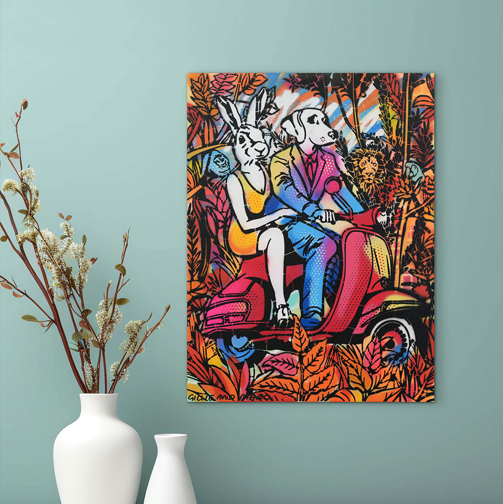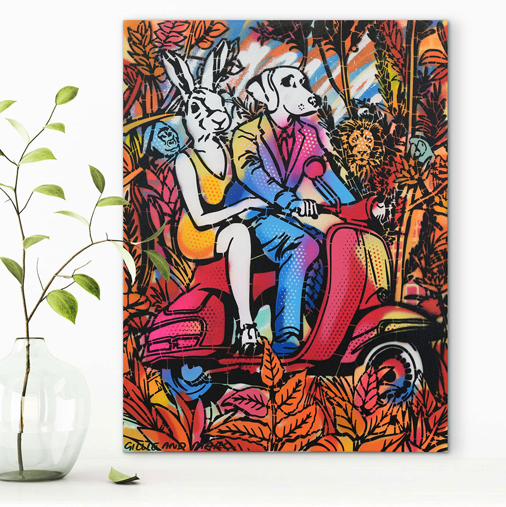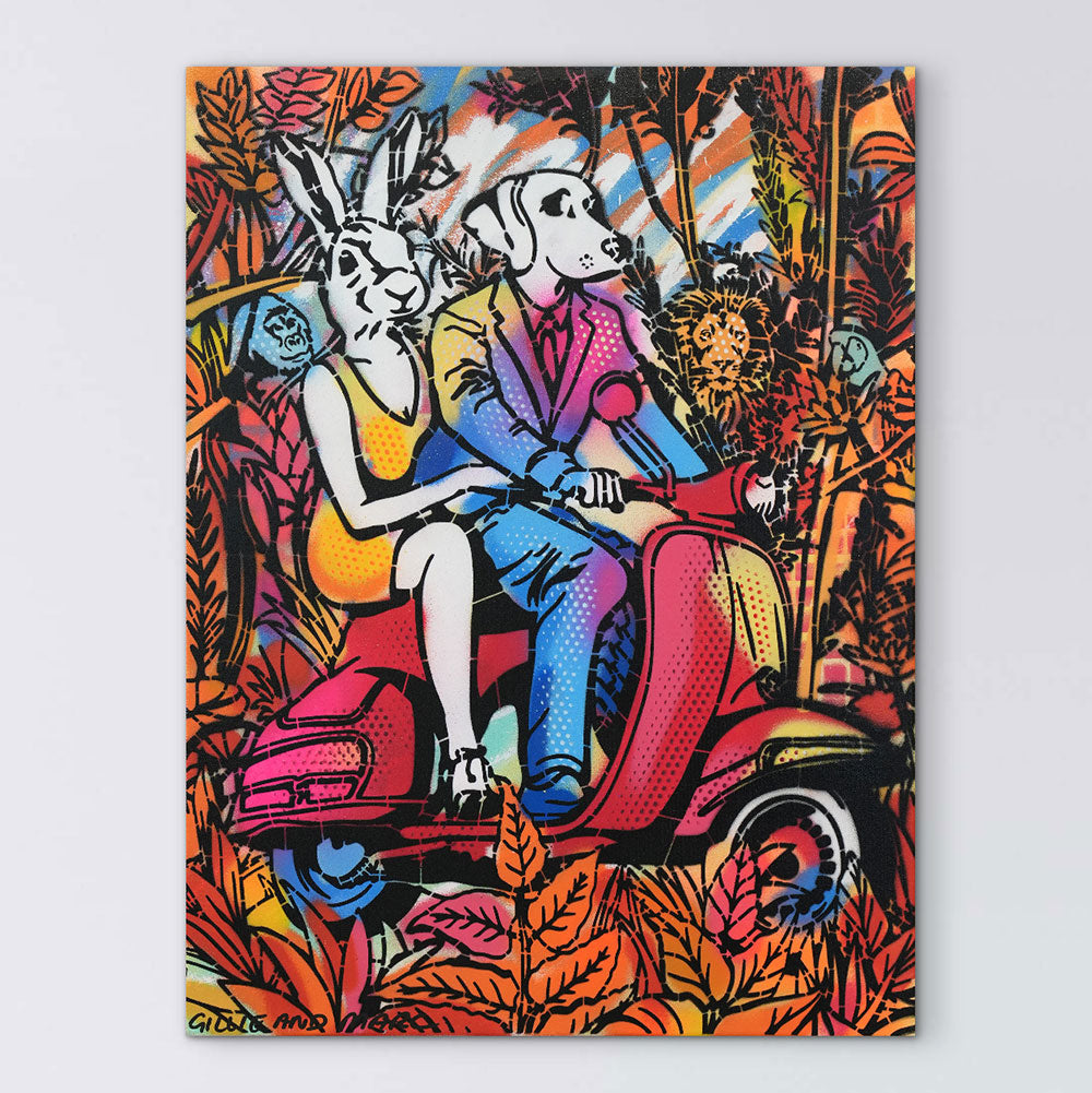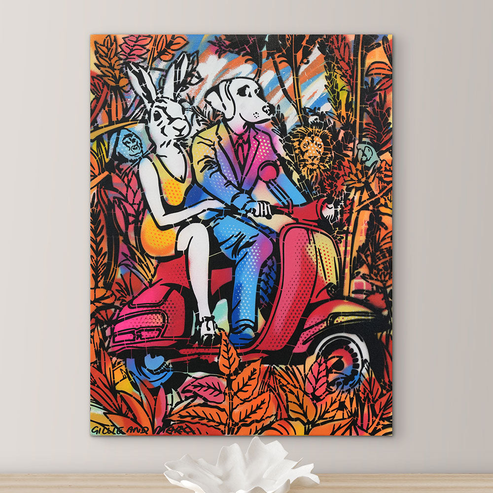 Description Rabbitwoman and Dogman ride together through a lush, dreamlike jungle alive with colour and hidden wildlife. Painted in bold tones of orange, pink, and electric blue, the scene pulses with energy and passion. Their journey on the red scooter symbolises unity, freedom, and the shared adventure of life. In Two Souls One Destiny, Gillie and Marc capture the timeless connection between two hearts that move as one — fearless, inseparable, and destined to travel the world together.